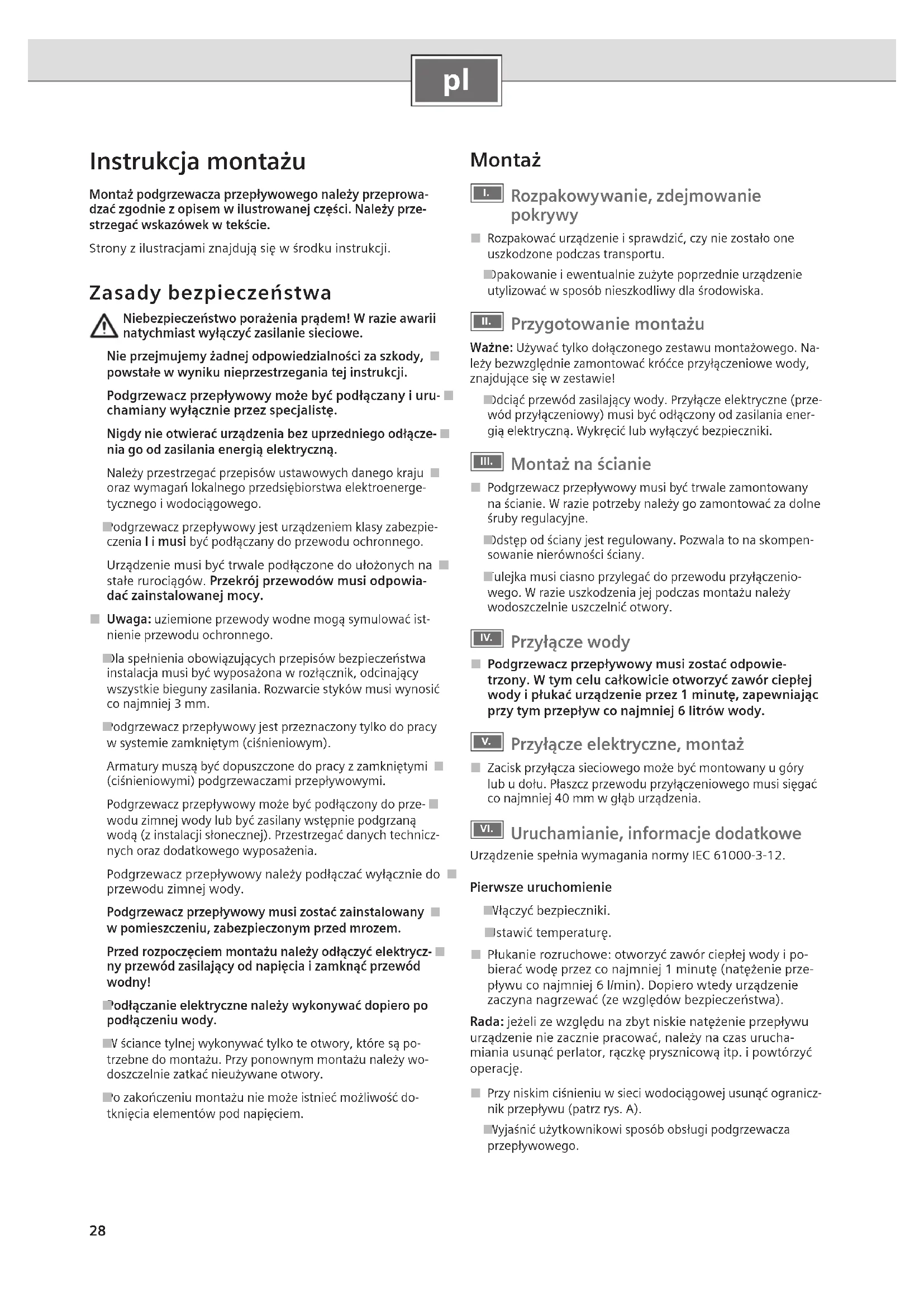 Instrukcja montażu Montaż podgrzewacza przepływowego należy przeprowa-dzać zgodnie z opisem w ilustrowanej części. Należy prze-strzegać wskazówek w tekście.Strony z ilustracjami znajdują się w środku instrukcji. Zasady bezpieczeństwa Niebezpieczeństwo porażenia prądem! W razie awarii natychmiast wyłączyć zasilanie sieciowe.Nie przejmujemy żadnej odpowiedzialności za szkody, ■powstałe w wyniku nieprzestrzegania tej instrukcji.Podgrzewacz przepływowy może być podłączany i uru- ■chamiany wyłącznie przez specjalistę.Nigdy nie otwierać urządzenia bez uprzedniego odłącze- ■nia go od zasilania energią elektryczną.Należy przestrzegać przepisów ustawowych danego kraju ■oraz wymagań lokalnego przedsiębiorstwa elektroenerge-tycznego i wodociągowego.Podgrzewacz przepływowy jest urządzeniem klasy zabezpie- ■czenia I i musi być podłączany do przewodu ochronnego.Urządzenie musi być trwale podłączone do ułożonych na ■stałe rurociągów. Przekrój przewodów musi odpowia-dać zainstalowanej mocy. Uwaga: ■ uziemione przewody wodne mogą symulować ist- nienie przewodu ochronnego.Dla spełnienia obowiązujących przepisów bezpieczeństwa ■instalacja musi być wyposażona w rozłącznik, odcinający wszystkie bieguny zasilania. Rozwarcie styków musi wynosić co najmniej 3 mm.Podgrzewacz przepływowy jest przeznaczony tylko do pracy ■w systemie zamkniętym (ciśnieniowym).Armatury muszą być dopuszczone do pracy z zamkniętymi ■(ciśnieniowymi) podgrzewaczami przepływowymi.Podgrzewacz przepływowy może być podłączony do prze- ■wodu zimnej wody lub być zasilany wstępnie podgrzaną wodą (z instalacji słonecznej). Przestrzegać danych technicz-nych oraz dodatkowego wyposażenia.Podgrzewacz przepływowy należy podłączać wyłącznie do ■przewodu zimnej wody.Podgrzewacz przepływowy musi zostać zainstalowany ■w pomieszczeniu, zabezpieczonym przed mrozem.Przed rozpoczęciem montażu należy odłączyć elektrycz- ■ny przewód zasilający od napięcia i zamknąć przewód wodny!Podłączanie elektryczne należy wykonywać dopiero po ■podłączeniu wody.W ściance tylnej wykonywać tylko te otwory, które są po- ■trzebne do montażu. Przy ponownym montażu należy wo-doszczelnie zatkać nieużywane otwory.Po zakończeniu montażu nie może istnieć możliwość do- ■tknięcia elementów pod napięciem. Montaż