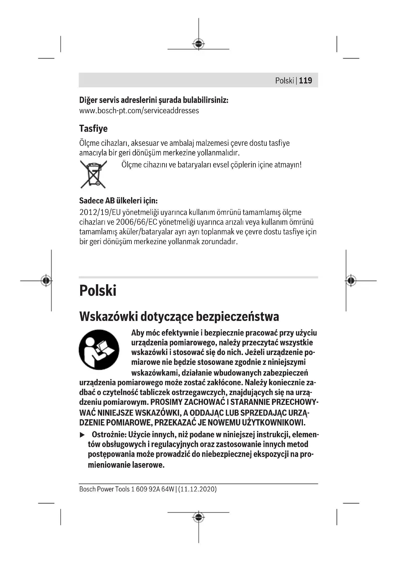 Karasoku Mahallesi 28028. Sokak No:20/A Merkez / ADANA Tel.: +903223599710 -3521379 Fax: +903223591323 E-mail: isiklar@isiklarelektrik.com 1 609 92A 64W | (11.12.2020) Bosch Power ToolsPolski | 119 Diğer servis adreslerini şurada bulabilirsiniz: www.bosch-pt.com/serviceaddresses Tasfiye Ölçme cihazları, aksesuar ve ambalaj malzemesi çevre dostu tasfiye amacıyla bir geri dönüşüm merkezine yollanmalıdır. Ölçme cihazını ve bataryaları evsel çöplerin içine atmayın! Sadece AB ülkeleri için: 2012/19/EU yönetmeliği uyarınca kullanım ömrünü tamamlamış ölçme cihazları ve 2006/66/EC yönetmeliği uyarınca arızalı veya kullanım ömrünü tamamlamış aküler/bataryalar ayrı ayrı toplanmak ve çevre dostu tasfiye için bir geri dönüşüm merkezine yollanmak zorundadır. Polski Wskazówki dotyczące bezpieczeństwa Aby móc efektywnie i bezpiecznie pracować przy użyciu urządzenia pomiarowego, należy przeczytać wszystkie wskazówki i stosować się do nich. Jeżeli urządzenie po- miarowe nie będzie stosowane zgodnie z niniejszymi wskazówkami, działanie wbudowanych zabezpieczeń urządzenia pomiarowego może zostać zakłócone. Należy koniecznie za- dbać o czytelność tabliczek ostrzegawczych, znajdujących się na urzą- dzeniu pomiarowym. PROSIMY ZACHOWAĆ I STARANNIE PRZECHOWY- WAĆ NINIEJSZE WSKAZÓWKI, A ODDAJĄC LUB SPRZEDAJĄC URZĄ- DZENIE POMIAROWE, PRZEKAZAĆ JE NOWEMU UŻYTKOWNIKOWI. u Ostrożnie: Użycie innych, niż podane w niniejszej instrukcji, elemen- tów obsługowych iregulacyjnych oraz zastosowanie innych metod postępowania może prowadzić do niebezpiecznej ekspozycji na pro- mieniowanie laserowe. Bosch Power Tools 1 609 92A 64W | (11.12.2020)120 | Polski u W zakres dostawy urządzenia pomiarowego wchodzi tabliczka ostrzegawcza lasera (na schemacie urządzenia pomiarowego znajdu- jącym się na stronie graficznej oznaczona jest ona numerem). u Jeżeli tabliczka ostrzegawcza lasera nie została napisana w języku polskim, zaleca się, aby jeszcze przed pierwszym uruchomieniem urządzenia nakleić na nią wchodzącą w zakres dostawy etykietę w ję- zyku polskim. Nie wolno kierować wiązki laserowej wstronę osób i zwierząt, nie wolno również samemu wpatrywać się w wiązkę ani w jej odbicie. Można w ten sposób spowodo- wać czyjeś oślepienie, wypadki lub uszkodzenie wzroku. u W przypadku gdy wiązka lasera zostanie skierowane na oko, należy zamknąć oczy i odsunąć głowę tak, aby znalazła się poza zasięgiem padania wiązki. u Nie wolno dokonywać żadnych zmian ani modyfikacji urządzenia la- serowego. u Nie należy używać okularów do pracy z laserem (osprzęt) jako okula- rów ochronnych. Okulary do pracy z laserem służą do łatwiejszej identy- fikacji wiązki lasera, nie chronią jednak przed promieniowaniem lasero- wym. u Nie należy używać okularów do pracy z laserem (osprzęt) jako okula- rów przeciwsłonecznych ani podczas prowadzenia samochodu. Oku- lary do pracy z laserem nie zapewniają całkowitej ochrony przed promie- niowaniem UV i utrudniają rozróżnianie kolorów. u Naprawę urządzenia pomiarowego należy zlecać wyłącznie wykwali- fikowanym fachowcom i wykonać ją tylko przy użyciu oryginalnych części zamiennych. Tylko w ten sposób zagwarantowane zostanie za- chowanie bezpieczeństwa urządzenia. u Nie wolno udostępniać laserowego urządzenia pomiarowego do użyt- kowania dzieciom pozostawionym bez nadzoru. Mogą one nieumyślnie oślepić inne osoby lub same siebie. u Nie należy stosować tego urządzenia pomiarowego w otoczeniu za- grożonym wybuchem, wktórym znajdują się łatwopalne ciecze, gazy lub pyły. W urządzeniu pomiarowym może dojść do utworzenia iskier, które mogą spowodować zapłon pyłów lub oparów. 1 609 92A 64W | (11.12.2020) Bosch Power ToolsPolski | 121 Nie należy umieszczać magnesu w pobliżu implantów oraz innych urządzeń medycznych, np. rozrusznika ser- ca lub pompy insulinowej. Magneswytwarza pole, które może zakłócić działanie implantów i urządzeń medycznych. u Urządzenie pomiarowe należy przechowywać z dala od magnetycz- nych nośników danych oraz urządzeń wrażliwych magnetycznie. Pod wpływem działania magnesów może dojść do nieodwracalnej utraty da- nych. Opis urządzenia i jego zastosowania Proszę zwrócić uwagę na rysunki zamieszczone na początku instrukcji obsłu- gi. Użycie zgodne z przeznaczeniem Urządzenie pomiarowe przeznaczone jest do wyznaczania i wskazywania linii poziomych i pionowych. Urządzenie pomiarowe dostosowane jest do prac wewnątrz pomieszczeń. Przedstawione graficznie komponenty Numeracja przedstawionych komponentów odnosi się do schematu urzą- dzenia pomiarowego, znajdującego się na stronie graficznej. (1) Uchwyt 1/4" adaptera (2) Śruba do precyzyjnej regulacji adaptera (3) Adapter (4) Włącznik/wyłącznik (5) Otwór wyjściowy wiązki lasera (6) Statyw