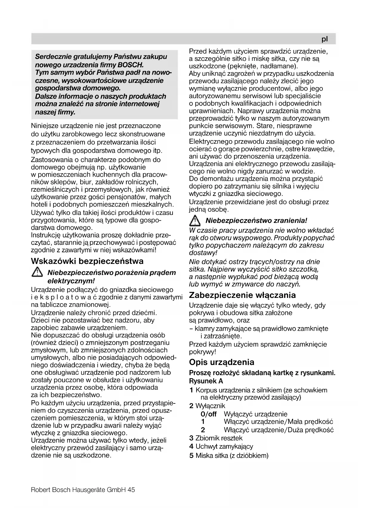 Deðiþiklikler olabilir.Robert Bosch Hausgeräte GmbH 45 Niniejsze urz¹dzenie nie jest przeznaczone do u¿ytku zarobkowego lecz skonstruowane z przeznaczeniem do przetwarzania iloœci typowych dla gospodarstwa domowego itp. Zastosowania o charakterze podobnym do domowego obejmuj¹ np. u¿ytkowanie w pomieszczeniach kuchennych dla pracow- ników sklepów, biur, zakładów rolniczych, rzemieœlniczych i przemysłowych, jak równie¿ u¿ytkowanie przez goœci pensjonatów, małych hoteli i podobnych pomieszczeñ mieszkalnych. U¿ywać tylko dla takiej iloœci produktów i czasu przygotowania, które s¹ typowe dla gospo- darstwa domowego. Instrukcjê u¿ytkowania proszê dokładnie prze- czytać, starannie j¹ przechowywać i postêpować zgodnie z zawartymi w niej wskazówkami! Wskazówki bezpieczeñstwa Niebezpieczeñstwo pora¿enia pr¹dem elektrycznym! Urz¹dzenie podł¹czyć do gniazdka sieciowego ieksploatować zgodnie z danymi zawartymi na tabliczce znamionowej. Urz¹dzenie nale¿y chronić przed dziećmi. Dzieci nie pozostawiać bez nadzoru, aby zapobiec zabawie urz¹dzeniem. Nie dopuszczać do obsługi urz¹dzenia osób (równie¿ dzieci) o zmniejszonym postrzeganiu zmysłowym, lub zmniejszonych zdolnoœciach umysłowych, albo nie posiadaj¹cych odpowied- niego doœwiadczenia i wiedzy, chyba ¿e bêd¹ one obsługiwać urz¹dzenie pod nadzorem lub zostały pouczone w obsłudze i u¿ytkowaniu urz¹dzenia przez osobê, która odpowiada za ich bezpieczeñstwo. Po ka¿dym u¿yciu urz¹dzenia, przed przyst¹pie- niem do czyszczenia urz¹dzenia, przed opusz- czeniem pomieszczenia, w którym stoi urz¹- dzenie lub w przypadku awarii nale¿y wyj¹ć wtyczkê z gniazdka sieciowego. Urz¹dzenie mo¿na u¿ywać tylko wtedy, je¿eli elektryczny przewód zasilaj¹cy i samo urz¹- dzenie nie s¹ uszkodzone. Przed ka¿dym u¿yciem sprawdzić urz¹dzenie, a szczególnie sitko i miskê sitka, czy nie s¹ uszkodzone (pêkniête, nadłamane). Aby unikn¹ć zagro¿eñ w przypadku uszkodzenia przewodu zasilaj¹cego nale¿y zlecić jego wymianê wył¹cznie producentowi, albo jego autoryzowanemu serwisowi lub specjaliœcie o podobnych kwalifikacjach i odpowiednich uprawnieniach. Naprawy urz¹dzenia mo¿na przeprowadzić tylko w naszym autoryzowanym punkcie serwisowym. Stare, niesprawne urz¹dzenie uczynić niezdatnym do u¿ycia. Elektrycznego przewodu zasilaj¹cego nie wolno ocierać o gor¹ce powierzchnie, ostre krawêdzie, ani u¿ywać do przenoszenia urz¹dzenia. Urz¹dzenia ani elektrycznego przewodu zasilaj¹- cego nie wolno nigdy zanurzać w wodzie. Do demonta¿u urz¹dzenia mo¿na przyst¹pić dopiero po zatrzymaniu siê silnika i wyjêciu wtyczki z gniazdka sieciowego. Urz¹dzenie przewidziane jest do obsługi przez jedn¹ osobê. Niebezpieczeñstwo zranienia! W czasie pracy urz¹dzenia nie wolno wkładać r¹k do otworu wsypowego. Produkty popychać tylko popychaczem nale¿¹cym do zakresu dostawy! Nie dotykać ostrzy tr¹cych/ostrzy na dnie sitka. Najpierw wyczyœcić sitko szczotk¹, anastêpnie wypłukać pod bie¿¹c¹ wod¹ lub wymyć w zmywarce do naczyñ. Zabezpieczenie wł¹czania Urz¹dzenie daje siê wł¹czyć tylko wtedy, gdy pokrywa i obudowa sitka zało¿one s¹ prawidłowo, oraz – klamry zamykaj¹ce s¹ prawidłowo zamkniête i zatrzaœniête. Przed ka¿dym u¿yciem sprawdzić zamkniêcie pokrywy! Opis urz¹dzenia Proszê rozło¿yć składan¹ kartkê z rysunkami. Rysunek A 1 Korpus urz¹dzenia z silnikiem (ze schowkiem na elektryczny przewód zasilaj¹cy) 2 Wył¹cznik 0/off Wył¹czyć urz¹dzenie 1 Wł¹czyć urz¹dzenie/Mała prêdkoœć 2 Wł¹czyć urz¹dzenie/Du¿a prêdkoœć 3 Zbiornik resztek 4 Uchwyt zamykaj¹cy 5 Miska sitka (z dzióbkiem)