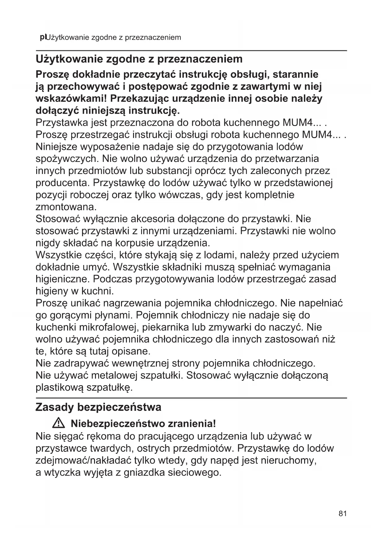 Użytkowanie zgodne z przeznaczeniem Użytkowanie zgodne z przeznaczeniem Proszę dokładnie przeczytać instrukcję obsługi, starannie ją przechowywać i postępować zgodnie z zawartymi w niej wskazówkami! Przekazując urządzenie innej osobie należy dołączyć niniejszą instrukcję. Przystawka jest przeznaczona do robota kuchennego MUM4... . Proszę przestrzegać instrukcji obsługi robota kuchennego MUM4... . Niniejsze wyposażenie nadaje się do przygotowania lodów spożywczych. Nie wolno używać urządzenia do przetwarzania innych przedmiotów lub substancji oprócz tych zaleconych przez producenta. Przystawkę do lodów używać tylko w przedstawionej pozycji roboczej oraz tylko wówczas, gdy jest kompletnie zmontowana. Stosować wyłącznie akcesoria dołączone do przystawki. Nie stosować przystawki z innymi urządzeniami. Przystawki nie wolno nigdy składać na korpusie urządzenia. Wszystkie części, które stykają się z lodami, należy przed użyciem dokładnie umyć. Wszystkie składniki muszą spełniać wymagania higieniczne. Podczas przygotowywania lodów przestrzegać zasad higieny w kuchni. Proszę unikać nagrzewania pojemnika chłodniczego. Nie napełniać go gorącymi płynami. Pojemnik chłodniczy nie nadaje się do kuchenki mikrofalowej, piekarnika lub zmywarki do naczyć. Nie wolno używać pojemnika chłodniczego dla innych zastosowań niż te, które są tutaj opisane. Nie zadrapywać wewnętrznej strony pojemnika chłodniczego. Nie używać metalowej szpatułki. Stosować wyłącznie dołączoną plastikową szpatułkę. Zasady bezpieczeństwa W Niebezpieczeństwo zranienia! Nie sięgać rękoma do pracującego urządzenia lub używać w przystawce twardych, ostrych przedmiotów. Przystawkę do lodów zdejmować/nakładać tylko wtedy, gdy napęd jest nieruchomy, a wtyczka wyjęta z gniazdka sieciowego.82 pl Opis urządzenia Opis urządzenia Proszę otworzyć składane kartki z rysunkami. X Rysunek A 1 Pokrywa urządzenia a Oznaczenia 2 Ramię ze sprzęgłem a Czopy zabieraka 3 Pojemnik chłodniczy 4 Uchwyt dla pojemnika chłodniczego 5 Plastikowa szpatułka Zabezpieczenie przed przeciążeniem W ramieniu jest wbudowane sprzęgło, które zapobiega większym uszkodzeniom urządzenia w przypadku wystąpienia prze- ciążenia przystawki. Gdyby podczas pracy miało dojść do zablokowania ramienia, to pojawi się skrzypiący odgłos. Wtedy natychmiast wyłączyć urządzenie! Proszę sprawdzić, czy nie została prze- kroczona ilość składników podanych w przepisach. W razie potrzeby usunąć część przetwarzanych produktów i ponownie włączyć urządzenie. Wskazówka: skrzypiący odgłos ramienia przed upływem podanego czasu przetwa- rzania to znak, że lody są gotowe wcześniej niż podano w przepisie. Przed pierwszym użyciem Przed rozpoczęciem użytkowania przy- stawki należy ją całkowicie rozpakować, oczyścić i sprawdzić. Uwaga! Nigdy nie użytkować uszkodzonej przystawki! ■ Wyjąć z opakowania wszystkie elementy wyposażenia. ■ Usunąć wszelki materiał opakowania. ■ Rozebrać zmontowane części na poszczególne elementy. Postępować przy tym w odwrotnej kolejności niż opisano w punkcie „Przygotowanie“. ■ Sprawdzić kompletność wszystkich części. X Rysunek A ■ Sprawdzić wszystkie części pod kątem widocznych uszkodzeń. ■ Przed pierwszym użyciem umyć dokład- nie wszystkie części i osuszyć. X„Kon- serwacjaicodzienneczyszczenie”patrz strona83 Przygotowanie Schłodzenie przystawki do lodów Uwaga! Pojemnik chłodniczy musi być zupełnie czysty, aby móc przygotować lody. X Cykl rysunków B