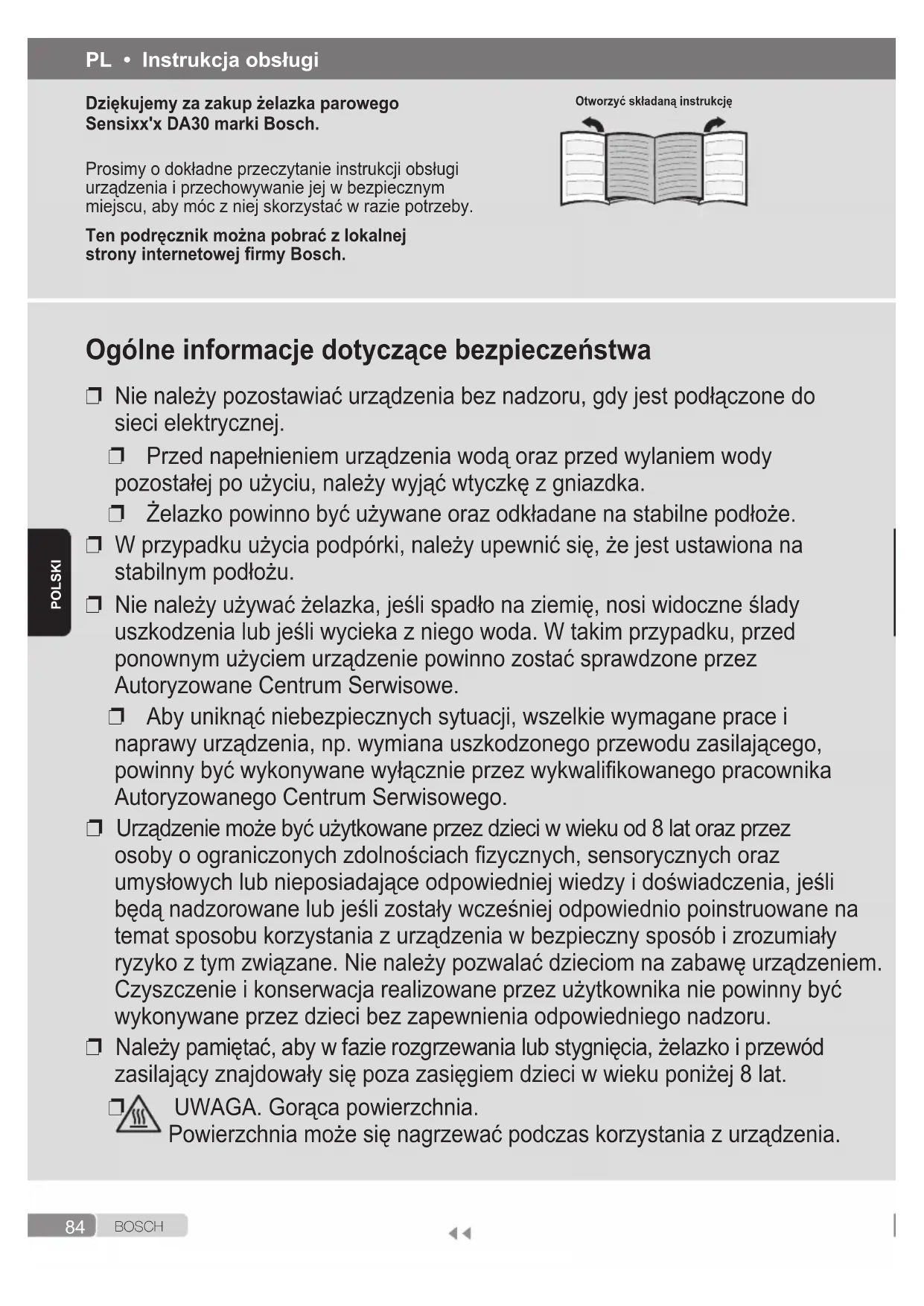 UWAGA. Gorąca powierzchnia. Powierzchnia może się nagrzewać podczas korzystania z urządzenia. PL • Instrukcja obsługi Dziękujemy za zakup żelazka parowego Sensixx'x DA30 marki Bosch. Prosimy o dokładne przeczytanie instrukcji obsługi urządzenia i przechowywanie jej w bezpiecznym miejscu, aby móc z niej skorzystać w razie potrzeby. Ten podręcznik można pobrać z lokalnej strony internetowej rmy Bosch. Otworzyć składaną instrukcję85 B O S C H