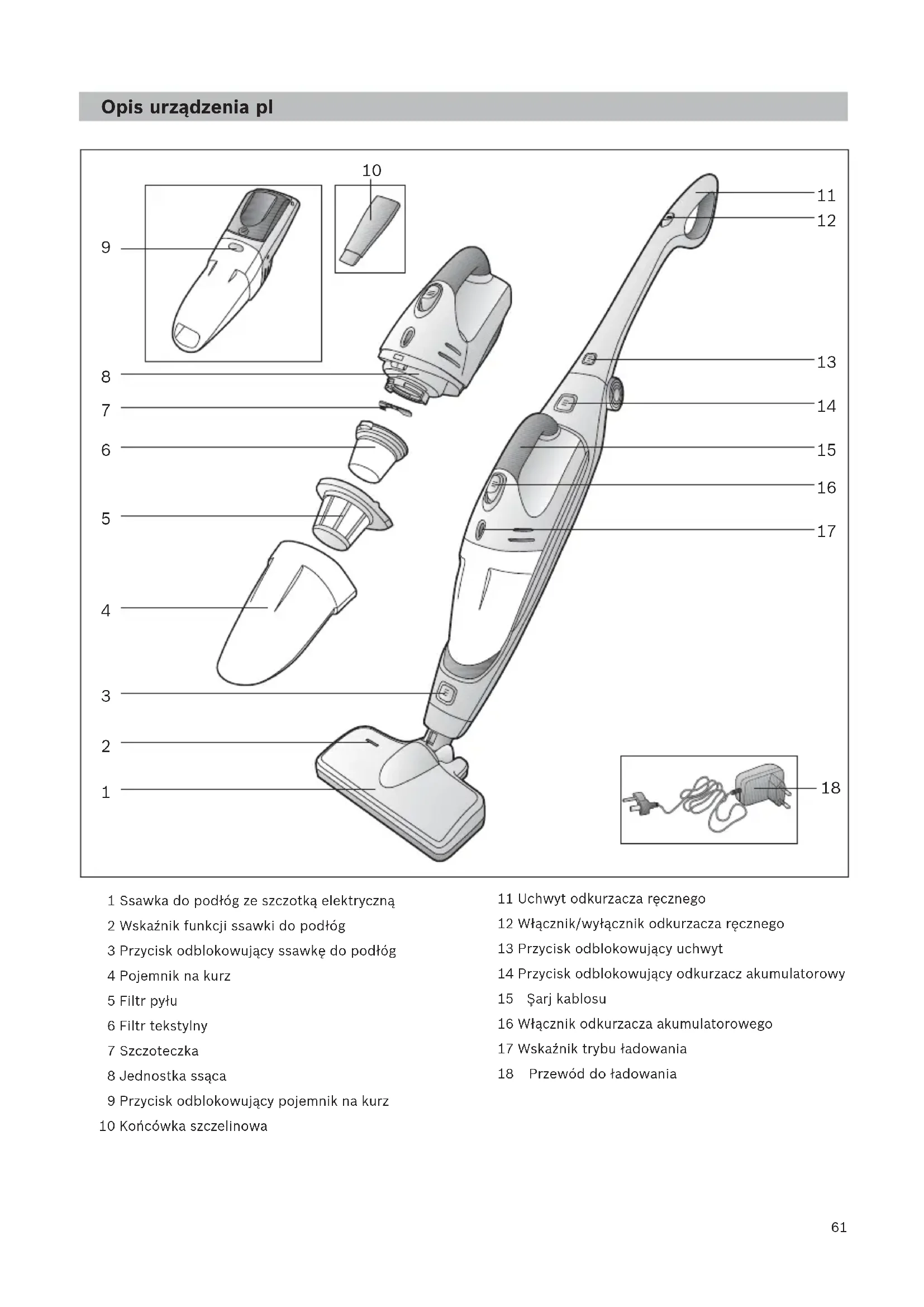 1 Ssawka do podłóg ze szczotką elektryczną 2 Wskaźnik funkcji ssawki do podłóg 3 Przycisk odblokowujący ssawkę do podłóg 4 Pojemnik na kurz 5 Filtr pyłu 6 Filtr tekstylny 7 Szczoteczka 8 Jednostka ssąca 9 Przycisk odblokowujący pojemnik na kurz 10 Końcówka szczelinowa 11 Uchwyt odkurzacza ręcznego 12 Włącznik/wyłącznik odkurzacza ręcznego 13 Przycisk odblokowujący uchwyt 14 Przycisk odblokowujący odkurzacz akumulatorowy 15 Uchwyt odkurzacza akumulatorowego 16 Włącznik odkurzacza akumulatorowego 17 Wskaźnik trybu ładowania 18 Stacja ładowania 19 Stojak stacji ładowania 20 Przewód do ładowania Şarj kablosu Opis urządzenia pl Przewód do ładowania62