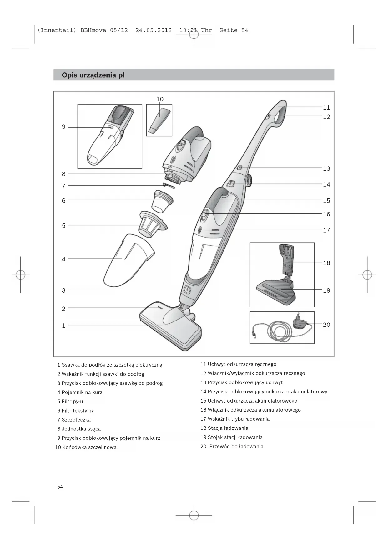 (Innenteil) BBHmove 05/12 24.05.2012 10:01 Uhr Seite 5354 Opis urządzenia pl 1 Ssawka do podłóg ze szczotką elektryczną 2 Wskaźnik funkcji ssawki do podłóg 3 Przycisk odblokowujący ssawkę do podłóg 4 Pojemnik na kurz 5 Filtr pyłu 6 Filtr tekstylny 7 Szczoteczka 8 Jednostka ssąca 9 Przycisk odblokowujący pojemnik na kurz 10 Końcówka szczelinowa 11 Uchwyt odkurzacza ręcznego 12 Włącznik/wyłącznik odkurzacza ręcznego 13 Przycisk odblokowujący uchwyt 14 Przycisk odblokowujący odkurzacz akumulatorowy 15 Uchwyt odkurzacza akumulatorowego 16 Włącznik odkurzacza akumulatorowego 17 Wskaźnik trybu ładowania 18 Stacja ładowania 19 Stojak stacji ładowania 20 Przewód do ładowania