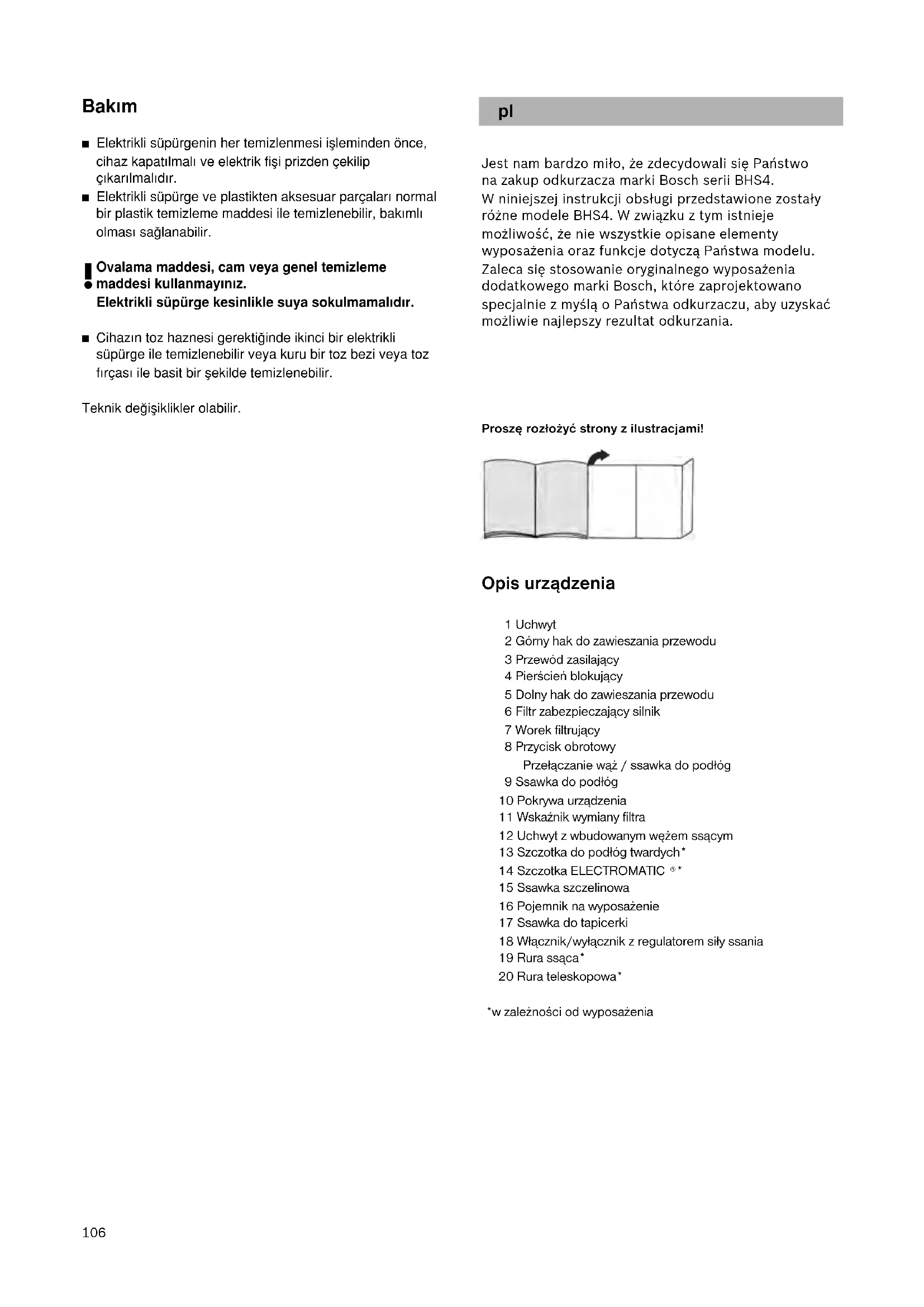Jest nam bardzo miło, że zdecydowali się Państwo na zakup odkurzacza marki Bosch serii BHS4. W niniejszej instrukcji obsługi przedstawione zostały różne modele BHS4. W związku z tym istnieje możliwość, że nie wszystkie opisane elementy wyposażenia oraz funkcje dotyczą Państwa modelu. Zaleca się stosowanie oryginalnego wyposażenia dodatkowego marki Bosch, które zaprojektowano specjalnie z myślą o Państwa odkurzaczu, aby uzyskać możliwie najlepszy rezultat odkurzania. Proszę rozłożyć strony z ilustracjami! Opis urządzenia 1 Uchwyt 2 Górny hak do zawieszania przewodu 3 Przewód zasilający 4 Pierścień blokujący 5 Dolny hak do zawieszania przewodu 6 Filtr zabezpieczający silnik 7 Worek filtrujący 8 Przycisk obrotowy Przełączanie wąż / ssawka do podłóg 9 Ssawka do podłóg 10 Pokrywa urządzenia 11 Wskaźnik wymiany filtra 12 Uchwyt z wbudowanym wężem ssącym 13 Szczotka do podłóg twardych* 14 Szczotka ELECTROMATIC