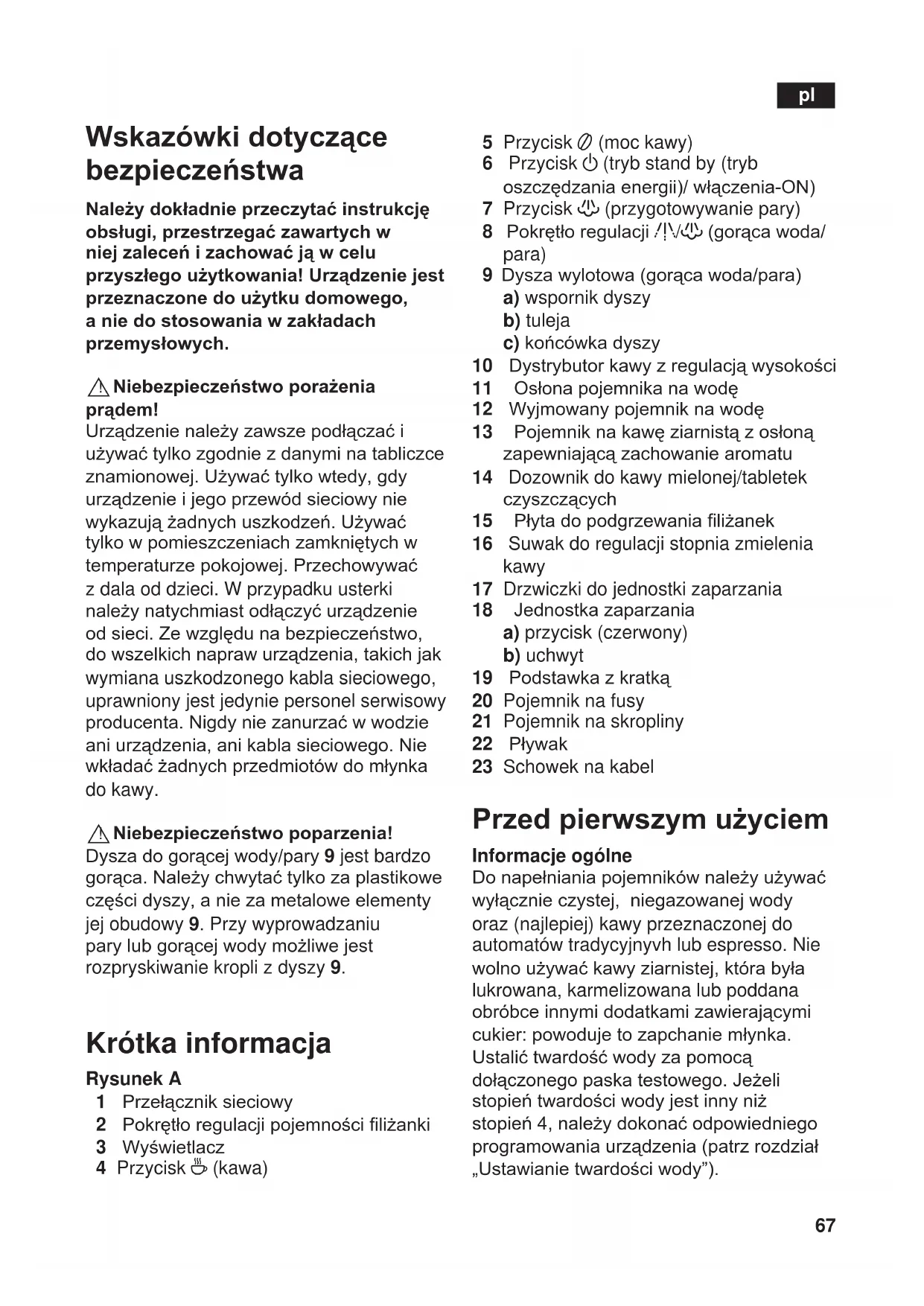 ! Niebezpieczeństwo poparzenia! Dyszadogorącejwody/pary9 jest bardzo gorąca.Należychwytaćtylkozaplastikowe częścidyszy,aniezametaloweelementy jej obudowy 9. Przy wyprowadzaniu parylubgorącejwodymożliwejest rozpryskiwanie kropli z dyszy 9. Krótka informacja Rysunek A 1 Przełączniksieciowy 2 Pokrętłoregulacjipojemnościliżanki 3 Wyświetlacz 4 Przycisk 4 (kawa) 5 Przycisk 5 (moc kawy) 6 Przycisk a (tryb stand by (tryb oszczędzaniaenergii)/włączeniaON) 7 Przycisk h (przygotowywanie pary) 8 Pokrętłoregulacjig/h(gorącawoda/ para) 9 Dyszawylotowa(gorącawoda/para) a) wspornik dyszy b) tuleja c)końcówkadyszy 10 Dystrybutorkawyzregulacjąwysokości 11 Osłonapojemnikanawodę 12 Wyjmowanypojemniknawodę 13 Pojemniknakawęziarnistązosłoną zapewniającązachowaniearomatu 14 Dozownik do kawy mielonej/tabletek czyszczących 15 Płytadopodgrzewanialiżanek 16 Suwak do regulacji stopnia zmielenia kawy 17 Drzwiczki do jednostki zaparzania 18 Jednostkazaparzania a) przycisk (czerwony) b) uchwyt 19 Podstawkazkratką 20 Pojemnik na fusy 21 Pojemnik na skropliny 22 Pływak 23 Schowek na kabel Przed pierwszym użyciem Informacje ogólne Donapełnianiapojemnikównależyużywać wyłącznieczystej,niegazowanejwody oraz (najlepiej) kawy przeznaczonej do automatów tradycyjnyvh lub espresso. Nie wolnoużywaćkawyziarnistej,którabyła lukrowana, karmelizowana lub poddana obróbceinnymidodatkamizawierającymi cukier:powodujetozapchaniemłynka. Ustalićtwardośćwodyzapomocą dołączonegopaskatestowego.Jeżeli stopieńtwardościwodyjestinnyniż stopień4,należydokonaćodpowiedniego programowaniaurządzenia(patrzrozdział „Ustawianietwardościwody”). pl68