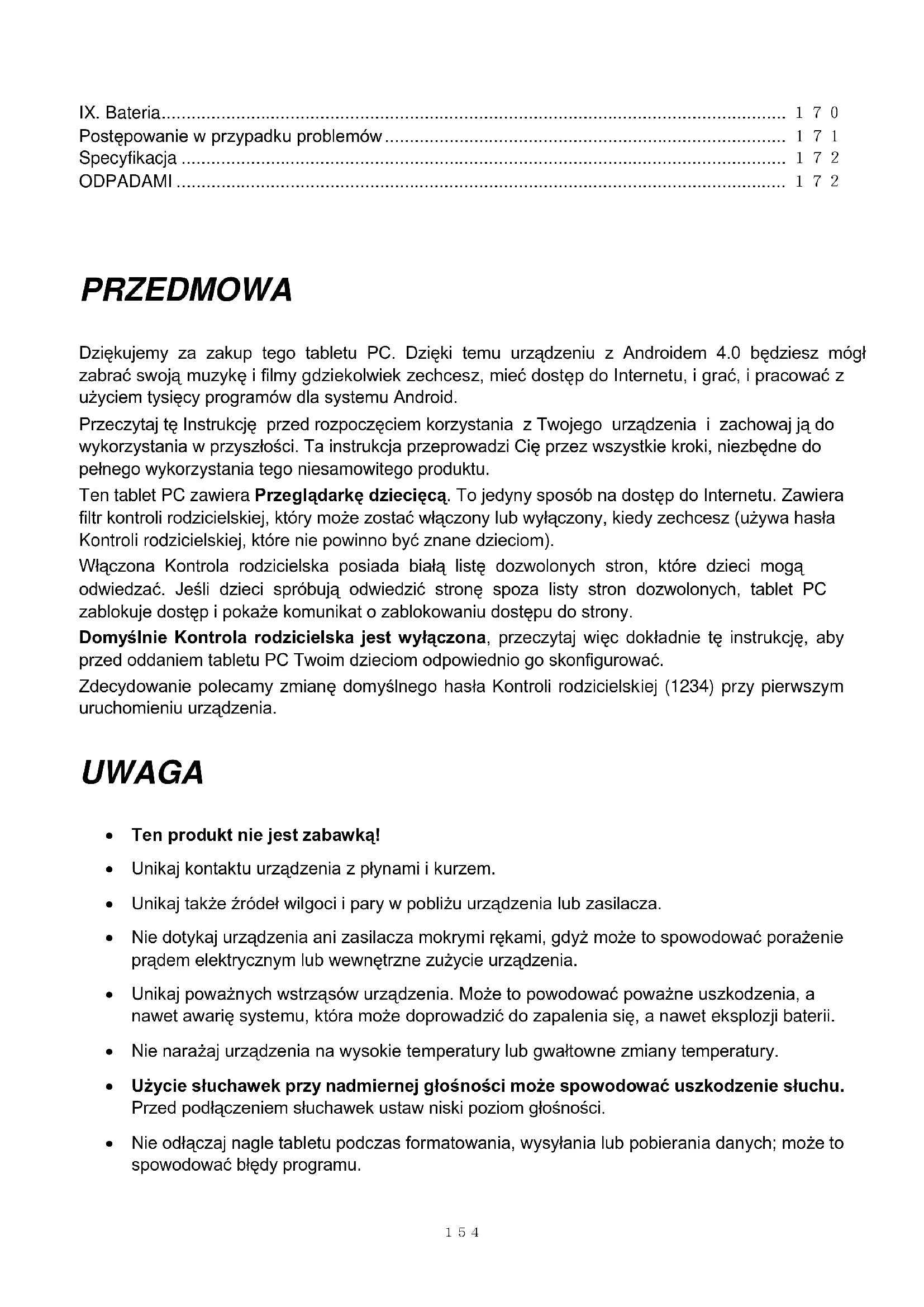 IX. Bateria .............................................................................................................................. 170 Postępowanie w przypadku problemów ................................................................................. 171 Specyfikacja .......................................................................................................................... 172 ODPADAMI ........................................................................................................................... 172 PRZEDMOWA Dziękujemy za zakup tego tabletu PC. Dzięki temu urządzeniu z Androidem 4.0 będziesz mógł zabrać swoją muzykę i filmy gdziekolwiek zechcesz, mieć dostęp do Internetu, i grać, i pracować z użyciem tysięcy programów dla systemu Android. Przeczytaj tę Instrukcję przed rozpoczęciem korzystania z Twojego urządzenia i zachowaj ją do wykorzystania w przyszłości. Ta instrukcja przeprowadzi Cię przez wszystkie kroki, niezbędne do pełnego wykorzystania tego niesamowitego produktu. Ten tablet PC zawiera Przeglądarkę dziecięcą. To jedyny sposób na dostęp do Internetu. Zawiera filtr kontroli rodzicielskiej, który może zostać włączony lub wyłączony, kiedy zechcesz (używa hasła Kontroli rodzicielskiej, które nie powinno być znane dzieciom). Włączona Kontrola rodzicielska posiada białą listę dozwolonych stron, które dzieci mogą odwiedzać. Jeśli dzieci spróbują odwiedzić stronę spoza listy stron dozwolonych, tablet PC zablokuje dostęp i pokaże komunikat o zablokowaniu dostępu do strony. Domyślnie Kontrola rodzicielska jest wyłączona, przeczytaj więc dokładnie tę instrukcję, aby przed oddaniem tabletu PC Twoim dzieciom odpowiednio go skonfigurować. Zdecydowanie polecamy zmianę domyślnego hasła Kontroli rodzicielskiej (1234) przy pierwszym uruchomieniu urządzenia. UWAGA
