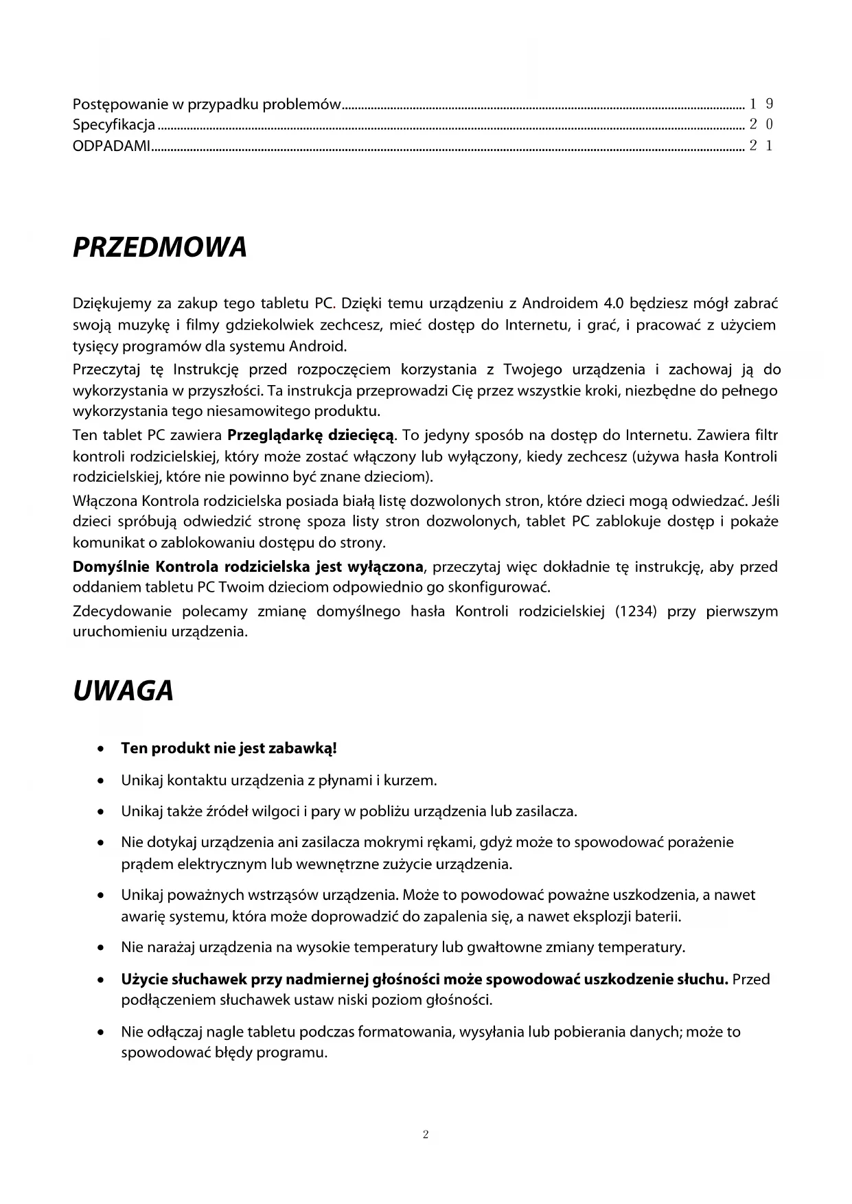Postępowanie w przypadku problemów ............................................................................................................................. 19 Specyfikacja ...................................................................................................................................................................................... 20 ODPADAMI ........................................................................................................................................................................................ 21 PRZEDMOWA Dziękujemy za zakup tego tabletu PC. Dzięki temu urządzeniu z Androidem 4.0 będziesz mógł zabrać swoją muzykę i filmy gdziekolwiek zechcesz, mieć dostęp do Internetu, i grać, i pracować z użyciem tysięcy programów dla systemu Android. Przeczytaj tę Instrukcję przed rozpoczęciem korzystania z Twojego urządzenia i zachowaj ją do wykorzystania w przyszłości. Ta instrukcja przeprowadzi Cię przez wszystkie kroki, niezbędne do pełnego wykorzystania tego niesamowitego produktu. Ten tablet PC zawiera Przeglądarkę dziecięcą. To jedyny sposób na dostęp do Internetu. Zawiera filtr kontroli rodzicielskiej, który może zostać włączony lub wyłączony, kiedy zechcesz (używa hasła Kontroli rodzicielskiej, które nie powinno być znane dzieciom). Włączona Kontrola rodzicielska posiada białą listę dozwolonych stron, które dzieci mogą odwiedzać. Jeśli dzieci spróbują odwiedzić stronę spoza listy stron dozwolonych, tablet PC zablokuje dostęp i pokaże komunikat o zablokowaniu dostępu do strony. Domyślnie Kontrola rodzicielska jest wyłączona, przeczytaj więc dokładnie tę instrukcję, aby przed oddaniem tabletu PC Twoim dzieciom odpowiednio go skonfigurować. Zdecydowanie polecamy zmianę domyślnego hasła Kontroli rodzicielskiej (1234) przy pierwszym uruchomieniu urządzenia. UWAGA