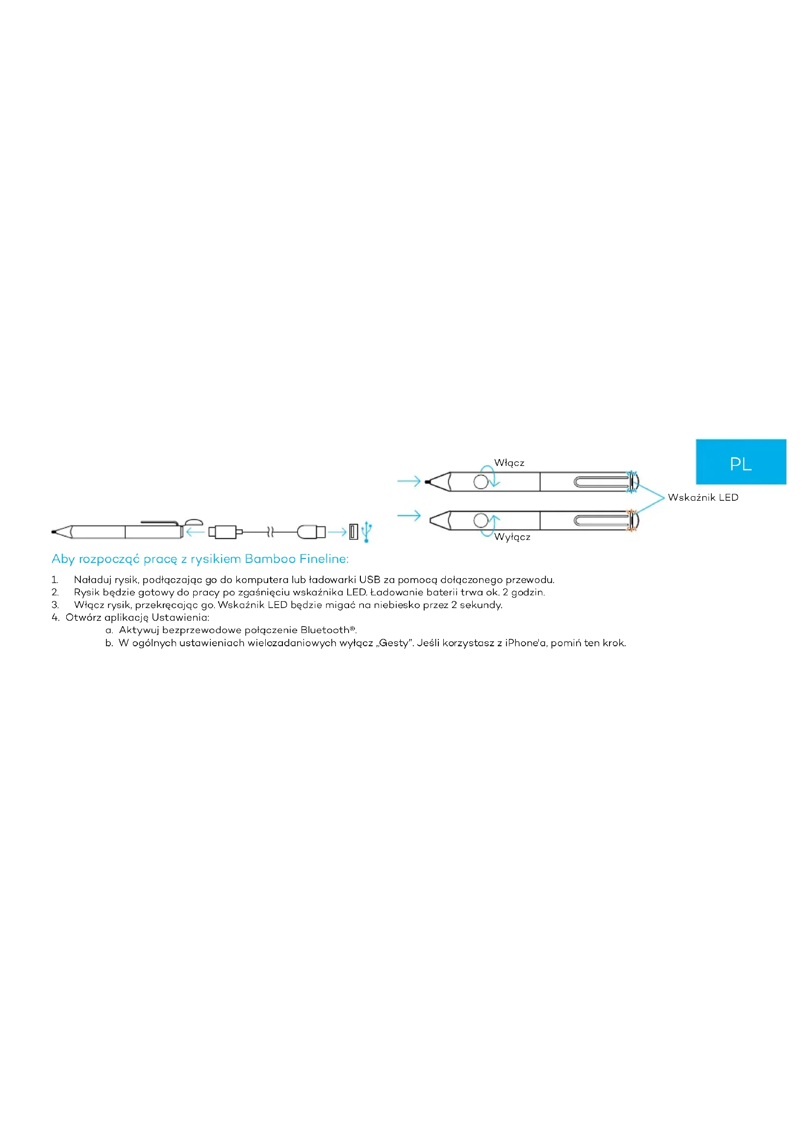 Ważne wskazówki i oferty: Więcej informacji na temat rysika oraz parowania go z aplikacjami można uzyskać na stronie internetowej wacom.com/finelinego. Aby sparować rysik po ponownym otwarciu aplikacji, należy nacisnąć przycisk rysika. Wskaźniki LED: Niski stan baterii Ładowanie Włącz Wyłącz Parowanie Sparowano Aby zarejestrować swój produkt i uzyskać pomoc techniczną, wejdź na stronę wacom.com i kliknij „Support” (Pomoc). Aby zamówić wymienne wkłady, wkłady rysika Bamboo ACK22301, przejdź na stronę wacom.com i kliknij „Store” (Sklep). Doskonałe rozwiązania dla rysika: aplikacja Bamboo Paper i usługa w chmurze Inkspace. Więcej narzędzi oferuje Wacom Marketplace. 2 s 2 s Emerald_QSG_book.indb 2 24-Aug-16 12:26:58 PMwacom.com ©2016 Wacom Co., Ltd. All rights reserved. Wacom, Bamboo and their respective logos are trademarks and/ or registered trademarks of Wacom Co., Ltd. All other company names and product names are trademarks and/or registered trademarks of their respective owners. Modifications and errors excepted.ƍ ƍƍƍƍƍ ƍƍƍƍƍƍƍƍƍƍƍƍƍƍƍƍƍƍƍ UM-0590