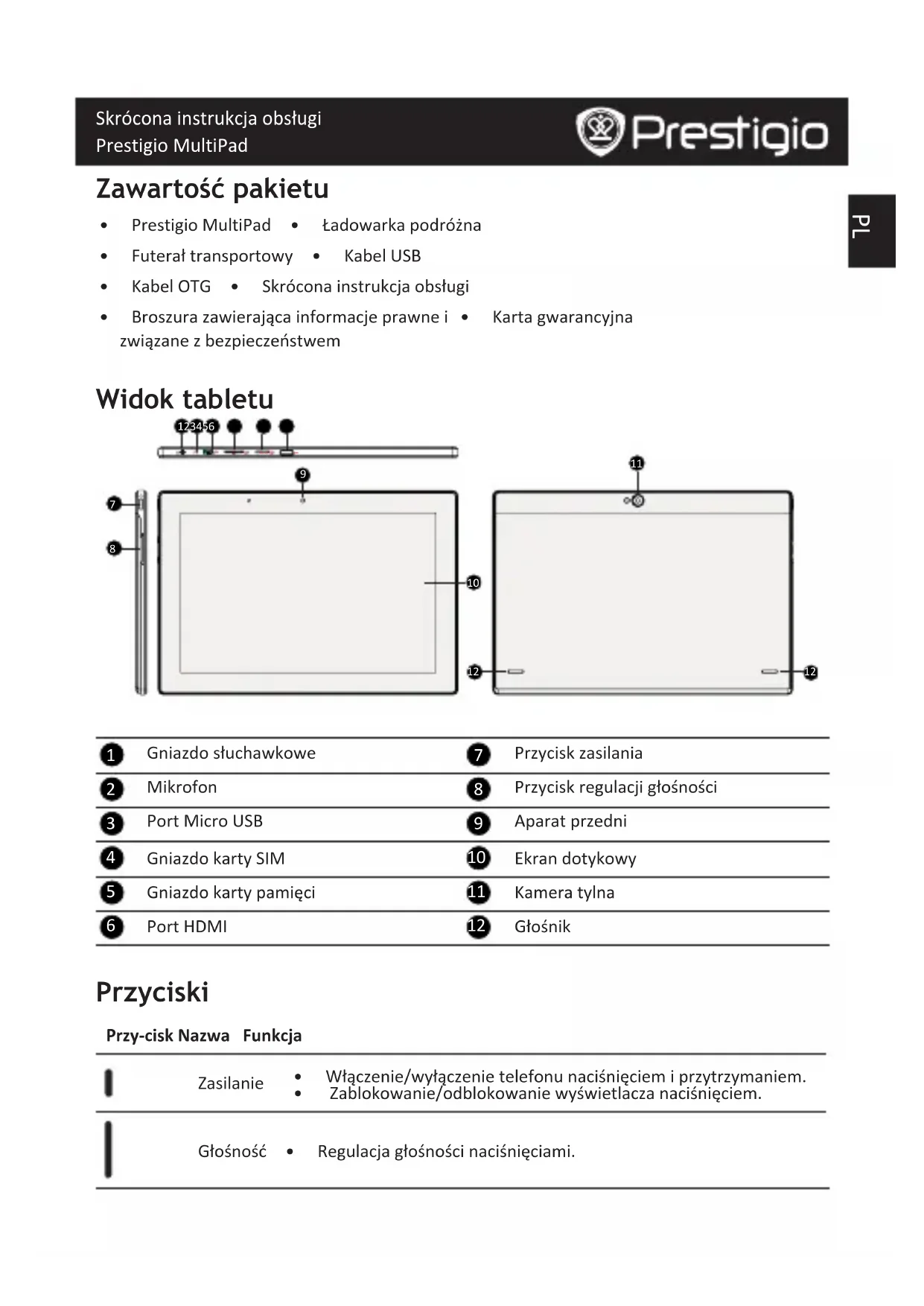 - Zablokowanie/odblokowaniewyświetlaczanaciśnięciem. Głośność • Regulacjagłośnościnaciśnięciami.PL Skrócona instrukcja obsługi Prestigio MultiPad Wstecz