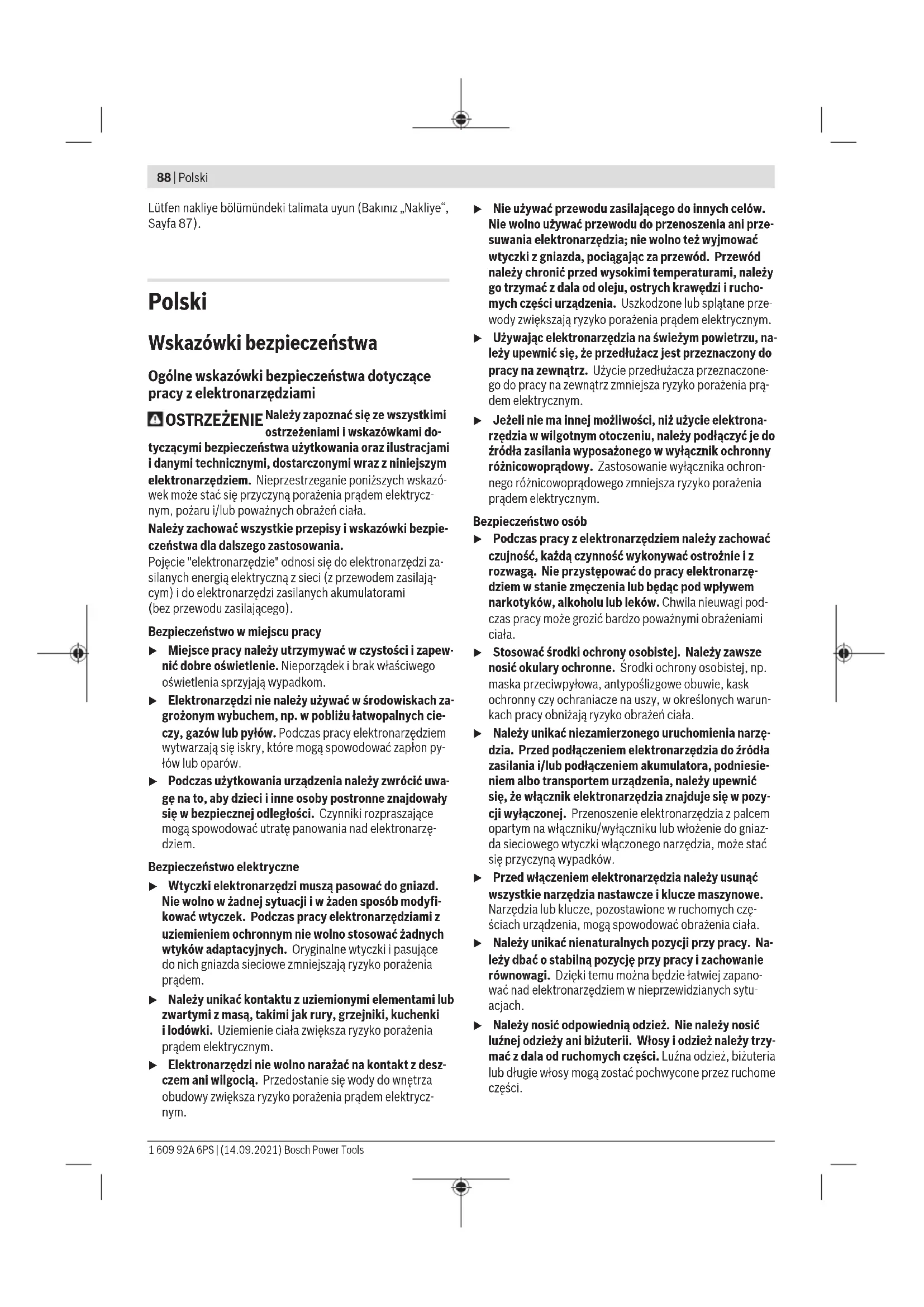 Karasoku Mahallesi 28028. Sokak No:20/A Merkez / ADANA Tel.: +903223599710 -3521379 Fax: +903223591323 E-mail: isiklar@isiklarelektrik.com Diğer servis adreslerini şurada bulabilirsiniz: www.bosch-pt.com/serviceaddresses Nakliye Alet içindeki lityum iyon (Li-Ionen) aküler tehlikeli madde taşıma yönetmeliği hükümlerine tabidir. Aküler başka bir yükümlülük olmaksızın kullanıcı tarafından caddeler üzerinde taşınabilir. Üçüncü kişiler eliyle yollanma durumunda (örneğin hava yolu ile veya nakliye şirketleri ile) paketleme ve etiketlemeye ilişkin özel hükümlere uyulmalıdır. Gönderi paketlenirken bir tehlikeli madde uzmanından yardım alınmalıdır. Aküleri sadece ve ancak gövdelerinde hasar yoksa gönderin. Açık kontakları kapatın ve aküyü ambalaj içinde hareket etmeyecek biçimde paketleyin. Lütfen olası ek ulusal yönetmelik hükümlerine de uyun. Tasfiye Elektrikli el aletleri, aküler, aksesuar ve ambalaj malzemesi çevre dostu tasfiye amacıyla bir geri dönüşüm merkezine yollanmalıdır. Elektrikli el aletlerini ve aküleri/bataryaları evsel çöplerin içine atmayın! Sadece AB ülkeleri için: 2012/19/EU yönetmeliği uyarınca kullanım ömrünü tamamlamış elektrikli el aletleri ve 2006/66/EC yönetmeliği uyarınca arızalı veya kullanım ömrünü tamamlamış aküler/ bataryalar ayrı ayrı toplanmak ve çevre dostu tasfiye için bir geri dönüşüm merkezine yollanmak zorundadır. Aküler/bataryalar: Lityum iyon: Bosch Power Tools 1 609 92A 6PS | (14.09.2021)88 | Polski Lütfen nakliye bölümündeki talimata uyun (Bakınız „Nakliye“, Sayfa87). Polski Wskazówki bezpieczeństwa Ogólne wskazówki bezpieczeństwa dotyczące pracy z elektronarzędziami OSTRZEŻENIE Należy zapoznać się ze wszystkimi ostrzeżeniami i wskazówkami do- tyczącymi bezpieczeństwa użytkowania oraz ilustracjami i danymi technicznymi, dostarczonymi wraz z niniejszym elektronarzędziem. Nieprzestrzeganie poniższych wskazó- wek może stać się przyczyną porażenia prądem elektrycz- nym, pożaru i/lub poważnych obrażeń ciała. Należy zachować wszystkie przepisy i wskazówki bezpie- czeństwa dla dalszego zastosowania. Pojęcie "elektronarzędzie" odnosi się do elektronarzędzi za- silanych energią elektryczną z sieci (z przewodem zasilają- cym) i do elektronarzędzi zasilanych akumulatorami (bezprzewodu zasilającego). Bezpieczeństwo w miejscu pracy u Miejsce pracy należy utrzymywać w czystości i zapew- nić dobre oświetlenie. Nieporządek i brak właściwego oświetlenia sprzyjają wypadkom. u Elektronarzędzi nie należy używać w środowiskach za- grożonym wybuchem, np. w pobliżu łatwopalnych cie- czy, gazów lub pyłów. Podczas pracy elektronarzędziem wytwarzają się iskry, które mogą spowodować zapłon py- łów lub oparów. u Podczas użytkowania urządzenia należy zwrócić uwa- gę na to, aby dzieci i inne osoby postronne znajdowały się w bezpiecznej odległości. Czynniki rozpraszające mogą spowodować utratę panowania nad elektronarzę- dziem. Bezpieczeństwo elektryczne u Wtyczki elektronarzędzi muszą pasować do gniazd. Nie wolno w żadnej sytuacji i w żaden sposób modyfi- kować wtyczek. Podczas pracy elektronarzędziami z uziemieniem ochronnym nie wolno stosować żadnych wtyków adaptacyjnych. Oryginalne wtyczki i pasujące do nich gniazda sieciowe zmniejszają ryzyko porażenia prądem. u Należy unikać kontaktu z uziemionymi elementami lub zwartymi z masą, takimi jak rury, grzejniki, kuchenki ilodówki. Uziemienie ciała zwiększa ryzyko porażenia prądem elektrycznym. u Elektronarzędzi nie wolno narażać na kontakt z desz- czem ani wilgocią. Przedostanie się wody do wnętrza obudowy zwiększa ryzyko porażenia prądem elektrycz- nym. u Nie używać przewodu zasilającego do innych celów. Nie wolno używać przewodu do przenoszenia ani prze- suwania elektronarzędzia; nie wolno też wyjmować wtyczki z gniazda, pociągając za przewód. Przewód należy chronić przed wysokimi temperaturami, należy go trzymać zdala od oleju, ostrych krawędzi i rucho- mych części urządzenia. Uszkodzone lub splątane prze- wody zwiększają ryzyko porażenia prądem elektrycznym. u Używając elektronarzędzia na świeżym powietrzu, na- leży upewnić się, że przedłużacz jest przeznaczony do pracy na zewnątrz. Użycie przedłużacza przeznaczone- go do pracy na zewnątrz zmniejsza ryzyko porażenia prą- dem elektrycznym. u Jeżeli nie ma innej możliwości, niż użycie elektrona- rzędzia w wilgotnym otoczeniu, należy podłączyć je do źródła zasilania wyposażonego w wyłącznik ochronny różnicowoprądowy. Zastosowanie wyłącznika ochron- nego różnicowoprądowego zmniejsza ryzyko porażenia prądem elektrycznym. Bezpieczeństwo osób u Podczas pracy z elektronarzędziem należy zachować czujność, każdą czynność wykonywać ostrożnie i z rozwagą. Nie przystępować do pracy elektronarzę- dziem w stanie zmęczenia lub będąc pod wpływem narkotyków, alkoholu lub leków. Chwila nieuwagi pod- czas pracy może grozić bardzo poważnymi obrażeniami ciała. u Stosować środki ochrony osobistej. Należy zawsze nosić okulary ochronne. Środki ochrony osobistej, np. maska przeciwpyłowa, antypoślizgowe obuwie, kask ochronny czy ochraniacze na uszy, w określonych warun- kach pracy obniżają ryzyko obrażeń ciała. u Należy unikać niezamierzonego uruchomienia narzę- dzia. Przed podłączeniem elektronarzędzia do źródła zasilania i/lub podłączeniem akumulatora, podniesie- niem albo transportem urządzenia, należy upewnić się, że włącznik elektronarzędzia znajduje się w pozy- cji wyłączonej. Przenoszenie elektronarzędzia z palcem opartym na włączniku/wyłączniku lub włożenie do gniaz- da sieciowego wtyczki włączonego narzędzia, może stać się przyczyną wypadków. u Przed włączeniem elektronarzędzia należy usunąć wszystkie narzędzia