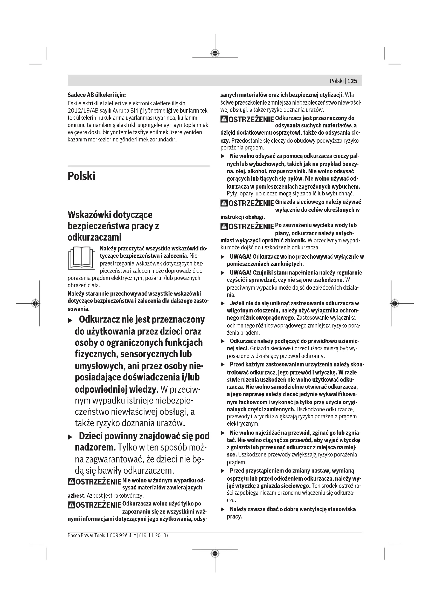 (zgodnie z klasą ochrony przeciwpyłowej L), można je odsysać bezpośrednio do zbiornika. Wskazówka: Podczas stosowania papierowego worka filtra- cyjnego bezwzględnie trzeba, a podczas stosowania włók- ninowego worka filtracyjnego należy wyłączyć system auto- matycznego oczyszczania filtra (AFC) (zob. „System automa- tycznego oczyszczania filtra (zob. rys. H)“, Strona131). OSTRZEŻENIE Odkurzacz zawiera pył niebez- pieczny dla zdrowia. Prace związa- ne z opróżnianiem i konserwacją, w tym utylizację pojem- nika na pył, należy zlecać jedynie wykwalifikowanym fa- chowcom. Podczas pracy konieczne jest stosowanie od- powiedniego wyposażenia ochronnego. Nie wolno uży- wać odkurzacza bez kompletnego systemu filtracji. Uży- cie takie jest groźne dla zdrowia. Wkładanie worka do utylizacji – Otworzyć zatrzaski (13) i zdjąć górną część odkurzacza (12). – Włożyć worek na odpady (25) otworem wlotowym skiero- wanym w górę do zbiornika (1). – Przesunąć otwór wlotowy przez kołnierz, aż znajdzie się w zagłębieniu kołnierza. – Upewnić się, czy worek na odpady (25) dokładnie przyle- ga do wewnętrznych ścianek zbiornika (1). – Wystającą krawędź worka na odpady (25) wywinąć poza krawędź zbiornika (1). – Nałożyć górną część odkurzacza (12) i zamknąć zatrzaski (13). Wyjmowanie i zamykanie worka na odpady – Otworzyć zatrzaski (13) i zdjąć górną część odkurzacza (12). – Zdjąć pełny worek na odpady (25) z kołnierza, w kierun- ku do tyłu. – Ostrożnie wyjąć worek na odpady (25) ze zbiornika (1), uważając przy tym, aby go nie uszkodzić. Należy przy tym uważać, aby worek nie otarł się o kołnierz lub inne ostre przedmioty. – Zdjąć zabezpieczenie paska samoprzylepnego i zakleić worek na odpady. Następnie zasznurować worek na odpady (25) poniżej otworu wlotowego za pomocą zdjętego zabezpieczenia. Wymiana/wkładanie worka na pył (osprzęt) – Otworzyć zatrzaski (13) i zdjąć górną część odkurzacza (12). – Pełny worek na pył pociągnąć do tyłu, wyjmując go z koł- nierza. Zamknąć otwór worka poprzez przełożenie po- krywki. Zamknięty worek na pył wyjąć ze zbiornika (1). – Nałożyć nowy worek na pył na kołnierz odkurzacza. Upewnić się, że worek na pył przylega w całej długości do wewnętrznych ścianek zbiornika (1). – Nałożyć górną część odkurzacza (12) i zamknąć zatrzaski (13). Polski | 129 Bosch Power Tools 1 609 92A 4LY | (19.11.2018)130 | Polski 1 609 92A 4LY | (19.11.2018) Bosch Power Tools Zakładanie przyssawki gumowej (odsysanie na mokro) (zob. rys. E) Wskazówka: Wymagania dotyczące przepuszczalności (kla- sa ochrony przeciwpyłowej M) zostały potwierdzone tylko dla trybu pracy na sucho. – Za pomocą odpowiedniego narzędzia podważyć szczotkę (29) założoną na dyszę do podłóg (30). – Założyć przyssawkę gumową (28) na dyszę do podłóg (30). Wskazówka: Strona przyssawki gumowej z teksturą musi znajdować się od zewnętrznej strony. Mocowanie walizki L-BOXX (zob. rys. F) – Walizkę L-BOXX umieścić w mocowaniach (11). Dla potrzeb transportu odkurzacza oraz przechowywania osprzętu i/lub elektronarzędzia można do górnej części od- kurzacza zamocować walizkę L-BOXX. u Nie przenosić odkurzacza, trzymając go za uchwyt za- mocowanej walizki L-BOXX. Odkurzacz jest za ciężki, aby można go było przenosić przy użyciu uchwytu walizki L-BOXX. Istnieje niebezpieczeństwo doznania obrażeń i uszkodzenia mienia. Praca u Przed przystąpieniem do zmiany nastaw, wymianą osprzętu lub przed odłożeniem odkurzacza, należy wy- jąć wtyczkę z gniazda sieciowego. Ten środek ostrożno- ści zapobiega niezamierzonemu włączeniu się odkurza- cza. Uruchamianie u Należy zwrócić uwagę na napięcie sieciowe! Napięcie źródła prądu musi zgadzać się z danymi na tabliczce zna- mionowej odkurzacza. Ładowarki przeznaczone do pracy pod napięciem 230V można podłączyć również do sieci 220V. u Użytkownik powinien zasięgnąć informacji na temat aktualnie obowiązujących w danym kraju ustaleń/ przepisów regulujących zasady obchodzenia się z py- łami niebezpiecznymi dla zdrowia. Odkurzacz jest przeznaczony do zasysania i oczyszczania na- stępujących materiałów: – Pyły o wartości granicznej narażenia ≥ 0,1mg/m