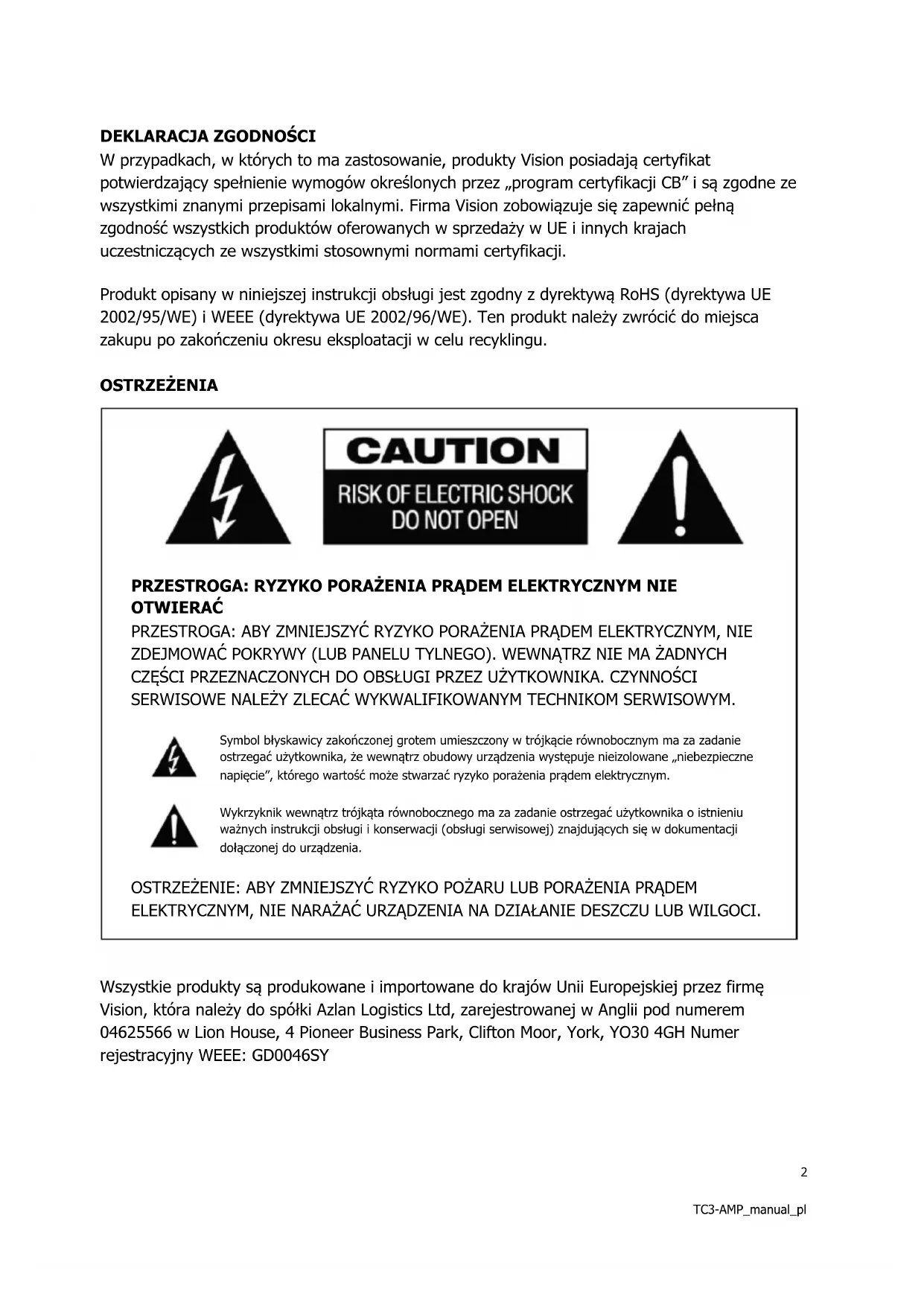 Wszystkie produkty są produkowane i importowane do krajów Unii Europejskiej przez firmę Vision, która należy do spółki Azlan Logistics Ltd, zarejestrowanej w Anglii pod numerem 04625566 w Lion House, 4 Pioneer Business Park, Clifton Moor, York, YO30 4GH Numer rejestracyjny WEEE: GD0046SY