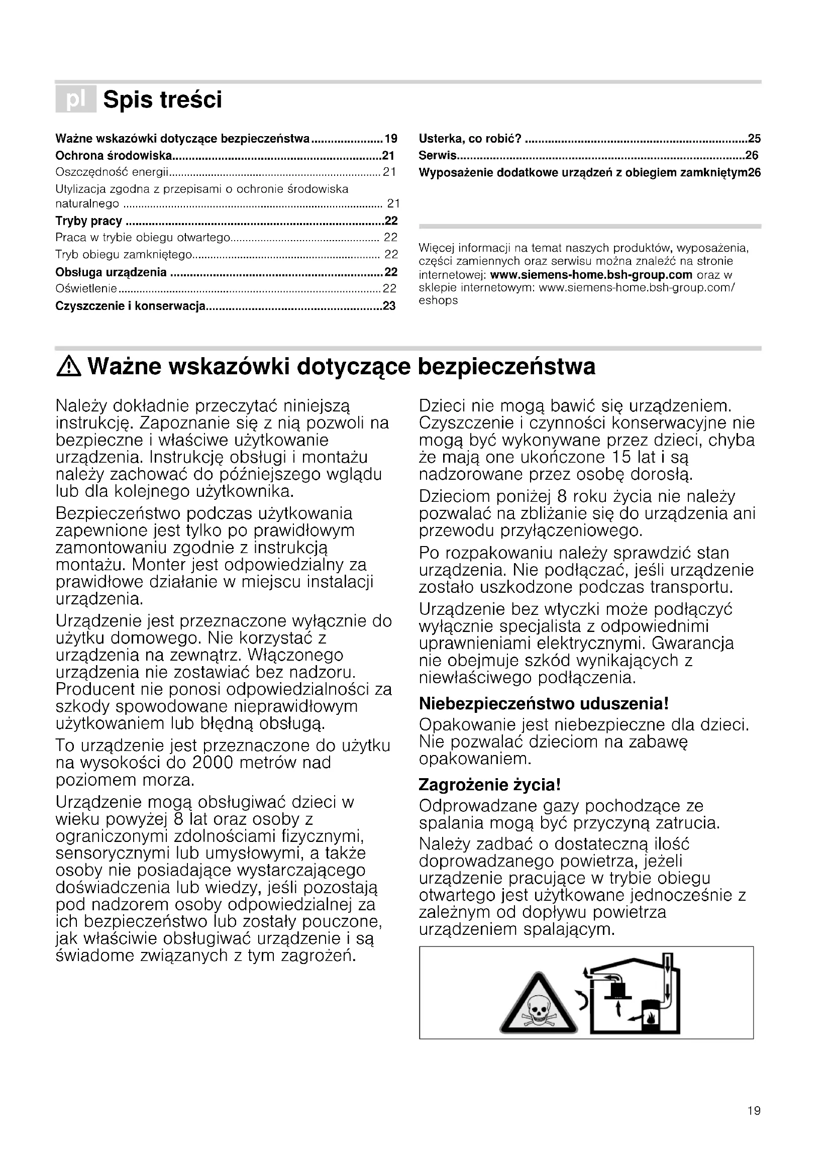 - Serwis Wyposażenie dodatkowe urządzeń z obiegiem zamkniętym26 Produktinfo Więcej informacji na temat naszych produktów, wyposażenia, części zamiennych oraz serwisu można znaleźć na stronie internetowej: www.siemens-home.bsh-group.com oraz w sklepie internetowym: www.siemens-home.bsh-group.com/ eshops : Ważne wskazówki dotyczące bezpieczeństwa Należy dokładnie przeczytać niniejszą instrukcję. Zapoznanie się z nią pozwoli na bezpieczne i właściwe użytkowanie urządzenia. Instrukcję obsługi i montażu należy zachować do późniejszego wglądu lub dla kolejnego użytkownika. Bezpieczeństwo podczas użytkowania zapewnione jest tylko po prawidłowym zamontowaniu zgodnie z instrukcją montażu. Monter jest odpowiedzialny za prawidłowe działanie w miejscu instalacji urządzenia. Urządzenie jest przeznaczone wyłącznie do użytku domowego. Nie korzystać z urządzenia na zewnątrz. Włączonego urządzenia nie zostawiać bez nadzoru. Producent nie ponosi odpowiedzialności za szkody spowodowane nieprawidłowym użytkowaniem lub błędną obs ługą. To urządzenie jest przeznaczone do użytku na wysokości do 2000 metrów nad poziomem morza. Urządzenie mogą obsługiwać dzieci w wieku powyżej 8 lat oraz osoby z ograniczonymi zdolnościami fizycznymi, sensorycznymi lub umysłowymi, a także osoby nie posiadające wystarczającego doświadczenia lub wiedzy, jeśli pozostają pod nadzorem osoby odpowiedzialnej za ich bezpieczeństwo lub zostały pouczone, jak właściwie obsługiwać urządzenie i są świadome związanych z tym zagrożeń. Dzieci nie mogą bawić się urządzeniem. Czyszczenie i czynności konserwacyjne nie mogą być wykonywane przez dzieci, chyba że mają one ukończone 15 lat i są nadzorowane przez osobę dorosłą. Dzieciom poniżej 8 roku życia nie należy pozwalać na zbliżanie się do urządzenia ani przewodu przyłączeniowego. Po rozpakowaniu należy sprawdzić stan urządzenia. Nie podłączać, jeśli urządzenie zostało uszkodzone podczas transportu. Urządzenie bez wtyczki może podłączyć wyłącznie specjalista z odpowiednimi uprawnieniami elektrycznymi. Gwarancja nie obejmuje szkód wynikających z niewłaściwego podłączenia. Niebezpieczeństwo uduszenia! Opakowanie jest niebezpieczne dla dzieci. Nie pozwalać dzieciom na zabawę opakowaniem. Zagrożenie życia! Odprowadzane gazy pochodzące ze spalania mogą być przyczyną zatrucia. Należy zadbać o dostateczną ilość doprowadzanego powietrza, jeżeli urządzenie pracują ce w trybie obiegu otwartego jest użytkowane jednocześnie z zależnym od dopływu powietrza urządzeniem spalającym.20 Zależne od powietrza w pomieszczeniu urządzenia spalające (np. grzejniki na gaz, olej, drewno lub węgiel, przepływowe podgrzewacze wody i inne podgrzewacze wody) pobierają powietrze do spalania z pomieszczenia, w którym się znajdują, a spaliny odprowadzają przez układ wylotowy (np. komin) na zewnątrz. Włączenie okapu kuchennego powoduje zasysanie powietrza w kuchni i sąsiadujących pomieszczeniach – bez wystarczającej wentylacji powstanie podciśnienie. Trujące gazy z komina lub ciągu wentylacyjnego uwalniane są do pomieszczeń mieszkalnych. p. 26