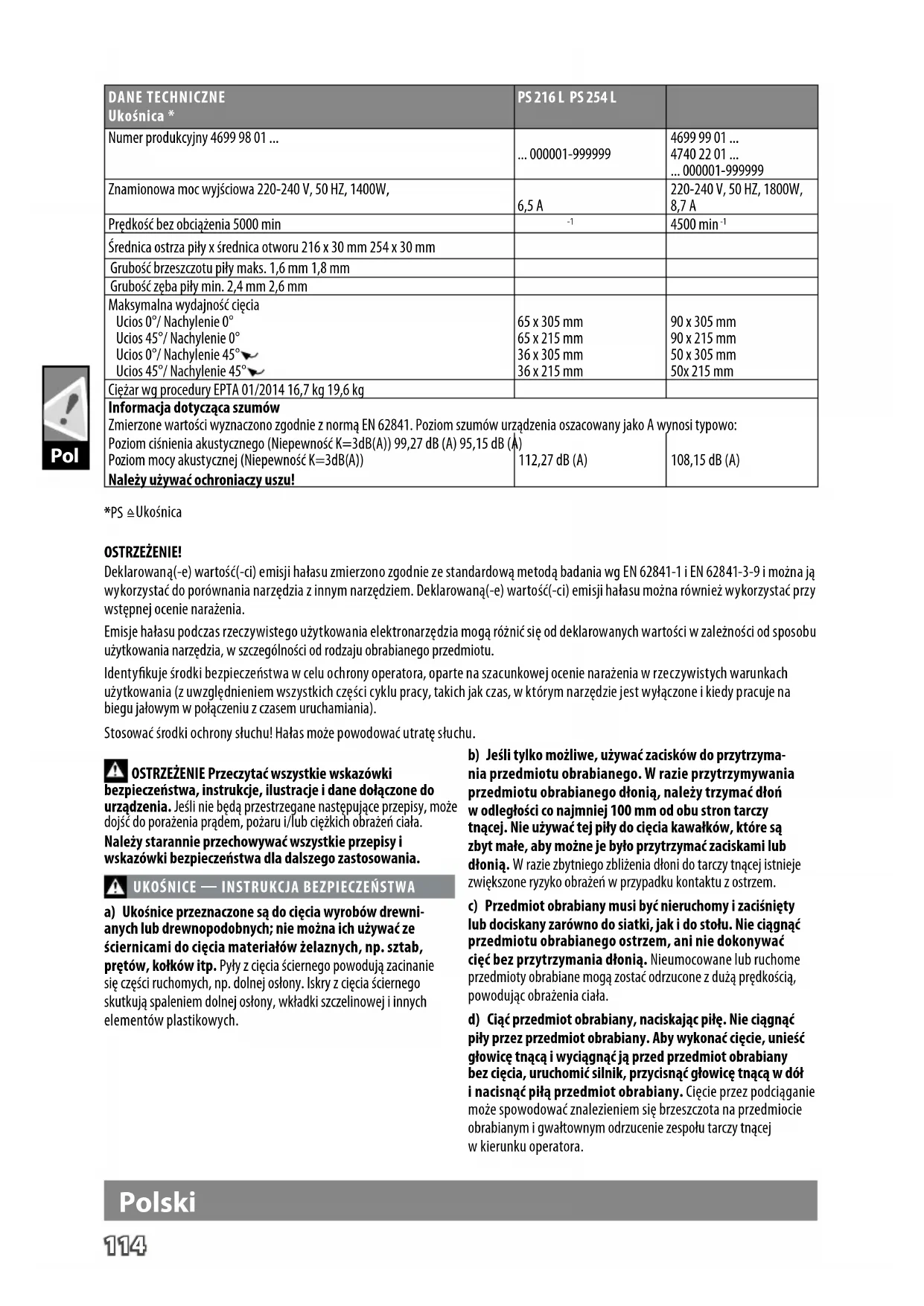 Średnica ostrza piły x średnica otworu 216 x 30 mm 254 x 30 mm Grubość brzeszczotu piły maks. 1,6 mm 1,8 mm Grubość zęba piły min. 2,4 mm 2,6 mm Maksymalna wydajność cięcia Ucios 0°/ Nachylenie 0° Ucios 45°/ Nachylenie 0° Ucios 0°/ Nachylenie 45° Ucios 45°/ Nachylenie 45° 65 x 305 mm 65 x 215 mm 36 x 305 mm 36 x 215 mm 90 x 305 mm 90 x 215 mm 50 x 305 mm 50x 215 mm Ciężar wg procedury EPTA 01/2014 16,7 kg 19,6 kg Informacja dotycząca szumów Zmierzone wartości wyznaczono zgodnie z normą EN 62841. Poziom szumów urządzenia oszacowany jako A wynosi typowo: Poziom ciśnienia akustycznego (Niepewność K=3dB(A)) 99,27 dB (A) 95,15 dB (A) Poziom mocy akustycznej (Niepewność K=3dB(A)) 112,27 dB (A) 108,15 dB (A) Należy używać ochroniaczy uszu! *PS
