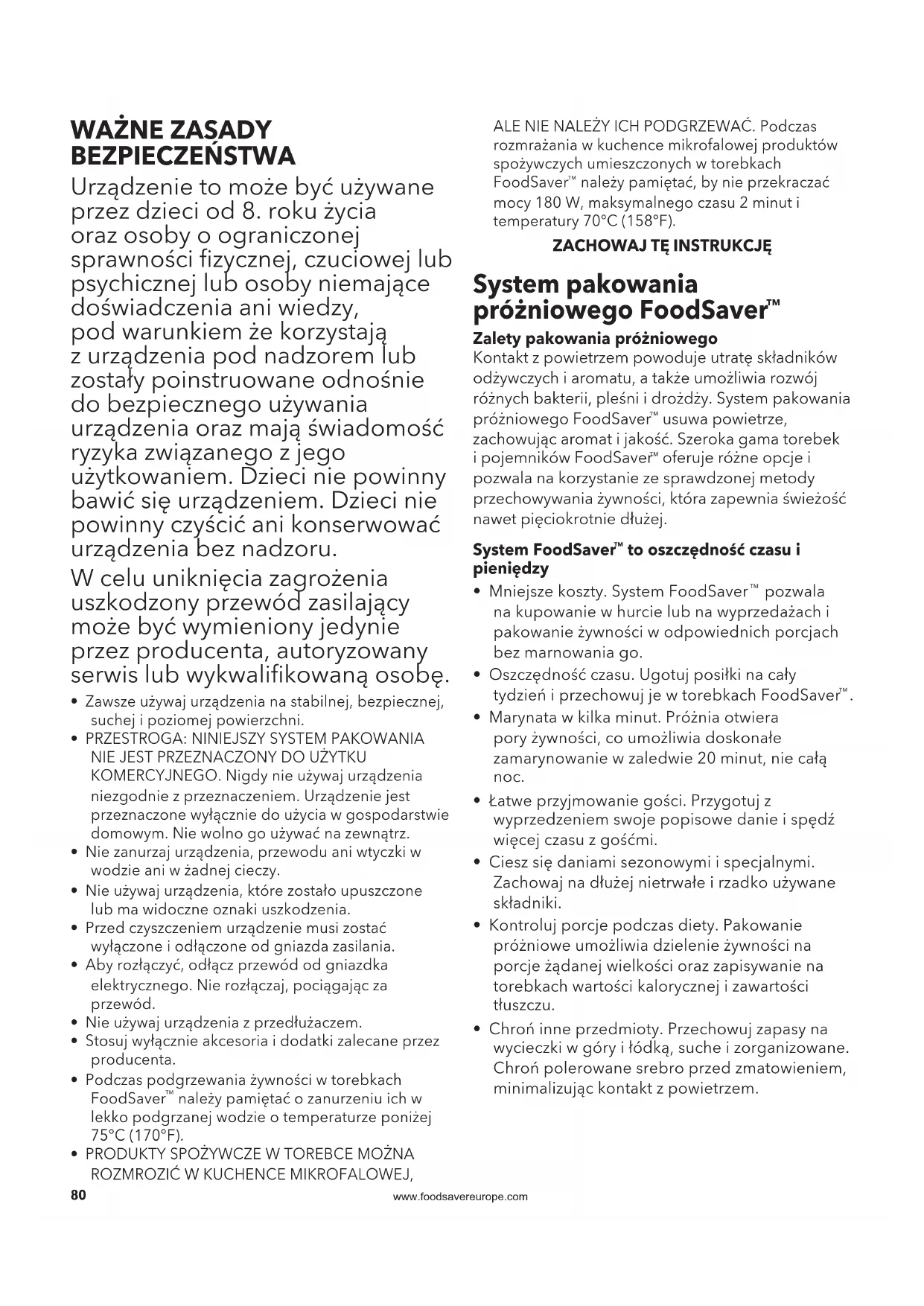działało efektywnie, zalecamy wymianę uszczelek raz w roku. Aby zamówić części zamienne, odwiedź stronę www.foodsavereurope.com. Przechowywanie Zamknij pokrywę do pierwszego „kliknięcia”, aż zatrzaski zadziałają, ale nie wyskoczą i nie pojawi się zielony pasek. Zabezpiecza to pokrywę, ale nie ściska uszczelek (co mogłoby prowadzić do nieprawidłowej pracy urządzenia). Owiń przewód wokół uchwytów znajdujących się pod urządzeniem. Urządzenie można przechowywać w pozycji pionowej, jak pokazano. Przewodnik, wskazówki i porady dotyczące przechowywania Pakowanie próżniowe i bezpieczeństwo żywności Proces pakowania próżniowego przedłuża trwałość żywności, usuwając większość powietrza z uszczelnionego pojemnika, redukując utlenianie obniżające wartość odżywczą i ogólną jakość oraz pogarszające smak. Usunięcie powietrza może także zapobiegać rozwojowi mikroorganizmów, które mogą powodować problemy w określonych warunkach: Bezpieczne przechowywanie żywności wymaga zachowania niskiej temperatury. Rozwój mikroorganizmów można znacznie ograniczyć w temperaturze 4°C i niższej. Zamrażanie w temperaturze –17°C nie zabija mikroorganizmów, ale zatrzymuje ich rozwój. W przypadku przechowywania długoterminowego należy zamrozić nietrwałą żywność przed zapakowaniem próżniowym i przechowywać ją w lodówce po rozmrożeniu. Należy pamiętać, że pakowanie próżniowe NIE zastępuje przechowywania w puszkach i nie odwraca procesu psucia się żywności. Może jedynie spowolnić zmianę jakości. Trudno jest przewidzieć, jak długo żywność zachowa idealny aromat, wygląd i teksturę, ponieważ zależy to od jej wieku i stanu w momencie pakowania próżniowego. Ważne: Pakowanie próżniowe NIE zastępuje zamrażania i chłodzenia. Nietrwałą żywność wymagającą chłodzenia należy po zapakowaniu próżniowym nadal przechowywać w lodówce lub zamrażarce. Aby uniknąć potencjalnych chorób, nie należy używać ponownie torebek, w których przechowywane było surowe mięso, surowe ryby lub tłuste produkty. Nie należy używać ponownie torebek, które były podgrzewane w kuchence mikrofalowej lub wodzie. Rozmrażanie i ponowne podgrzewanie pakowanej żywności Żywność należy zawsze rozmrażać w lodówce lub kuchence mikrofalowej. Nie rozmrażać nietrwałej żywności w temperaturze pokojowej. Produkty spożywcze w torebce można rozmrozić w kuchence mikrofalowej, ale nie należy ich podgrzewać. Podczas rozmrażania w kuchence mikrofalowej produktów spożywczych umieszczonych w torebkach FoodSaver