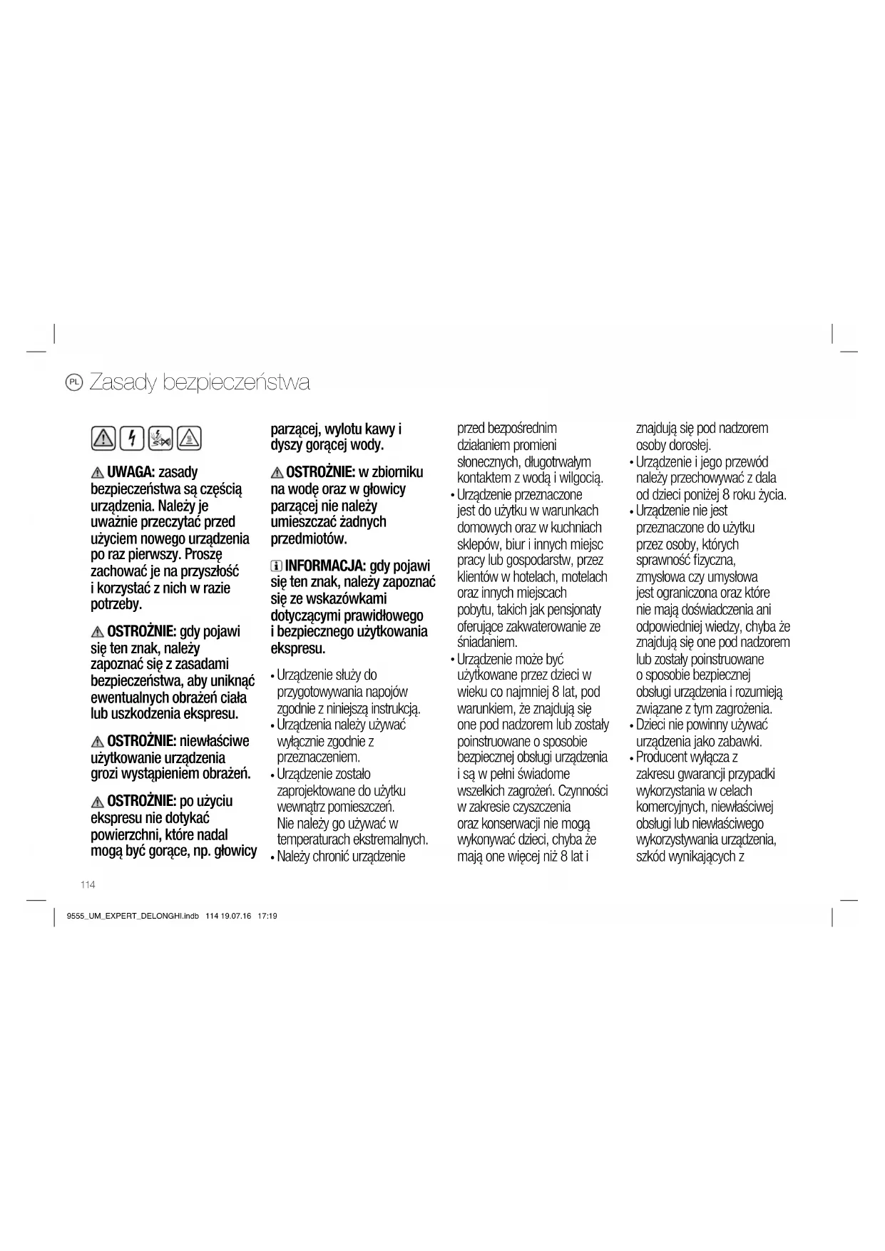 D80 Dane techniczne / D80 Технические характеристики 9555_UM_EXPERT_DELONGHI.indb 113 19.07.16 17:19Zasady bezpieczeństwa UWAGA: zasady bezpieczeństwa są częścią urządzenia. Należy je uważnie przeczytać przed użyciem nowego urządzenia po raz pierwszy. Proszę zachować je na przyszłość i korzystać z nich w razie potrzeby. OSTROŻNIE: gdy pojawi się ten znak, należy zapoznać się z zasadami bezpieczeństwa, aby uniknąć ewentualnych obrażeń ciała lub uszkodzenia ekspresu. OSTROŻNIE: niewłaściwe użytkowanie urządzenia grozi wystąpieniem obrażeń. OSTROŻNIE: po użyciu ekspresu nie dotykać powierzchni, które nadal mogą być gorące, np. głowicy parzącej, wylotu kawy i dyszy gorącej wody. OSTROŻNIE: w zbiorniku na wodę oraz w głowicy parzącej nie należy umieszczać żadnych przedmiotów. INFORMACJA: gdy pojawi się ten znak, należy zapoznać się ze wskazówkami dotyczącymi prawidłowego i bezpiecznego użytkowania ekspresu.