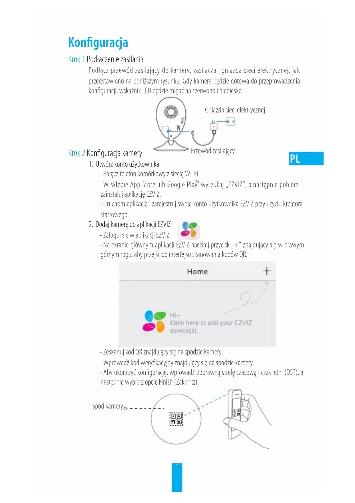 - Zaloguj się w aplikacji EZVIZ. - Na ekranie głównym aplikacji EZVIZ naciśnij przycisk „+” znajdujący się w prawym górnym rogu, aby przejść do interfejsu skanowania kodów QR. - Zeskanuj kod QR znajdujący się na spodzie kamery. - Wprowadź kod werykacyjny znajdujący się na spodzie kamery. - Aby ukończyć kongurację, wprowadź poprawną strefę czasową i czas letni (DST), a następnie wybierz opcję Finish (Zakończ). Przewód zasilający Gniazdo sieci elektrycznej Spód kamery32