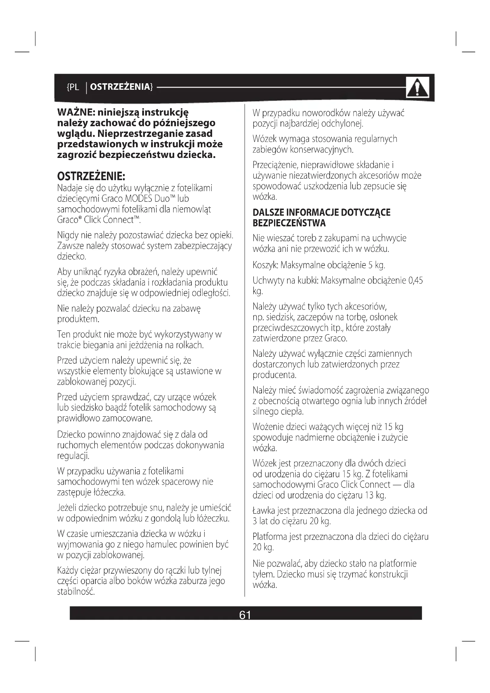 BEZPIECZEŃSTWA Nie wieszać toreb z zakupami na uchwycie wózka ani nie przewozić ich w wózku. Koszyk: Maksymalne obciążenie 5 kg. Uchwyty na kubki: Maksymalne obciążenie 0,45 kg. Należy używać tylko tych akcesoriów, np. siedzisk, zaczepów na torbę, osłonek przeciwdeszczowych itp., które zostały zatwierdzone przez Graco. Należy używać wyłącznie części zamiennych dostarczonych lub zatwierdzonych przez producenta. Należy mieć świadomość zagrożenia związanego z obecnością otwartego ognia lub innych źródeł silnego ciepła. Wożenie dzieci ważących więcej niż 15 kg spowoduje nadmierne obciążenie i zużycie wózka. Wózek jest przeznaczony dla dwóch dzieci od urodzenia do ciężaru 15 kg. Z fotelikami samochodowymi Graco Click Connect — dla dzieci od urodzenia do ciężaru 13 kg. Ławka jest przeznaczona dla jednego dziecka od 3 lat do ciężaru 20 kg. Platforma jest przeznaczona dla dzieci do ciężaru 20 kg. Nie pozwalać, aby dziecko stało na platformie tyłem. Dziecko musi się trzymać konstrukcji wózka.62 {PL