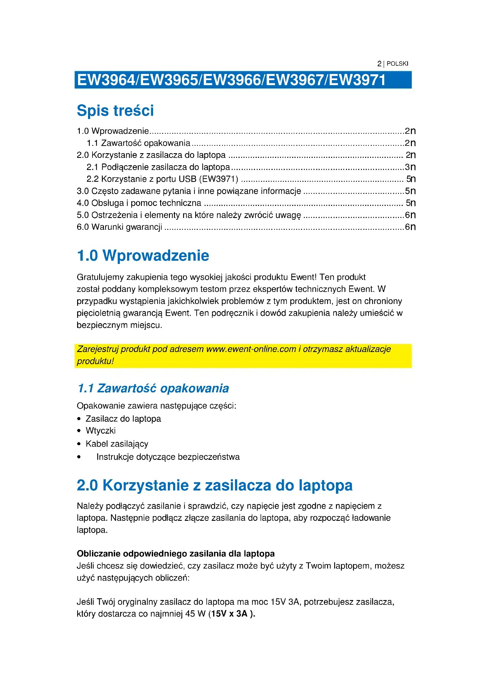 Dwuletni gwarancja Ewent dotyczy wszystkich produktów Ewent chyba, że zostanie to inaczej określone przed lub w trakcie zakupu. Po zakupieniu produktu Ewent z drugiej ręki, pozostały okres gwarancji jest liczony od chwili zakupienia przez początkowego nabywcy produktu. Gwarancja Ewent dotyczy wszystkich produktów i części Ewent, trwale połączonych lub zamontowanych do produktu. Adaptery zasilania, baterie, anteny i wszystkie inne produkty, nie bezpośrednio zintegrowane lub połączone z głównym produktem lub produktami, niewątpliwie zużyte podczas używania, wykazujące inne cechy niż główny produkt, nie są objęte gwarancją Ewent. Produkty nie są objęte gwarancją Ewent, przy ich nieprawidłowym/niewłaściwym
