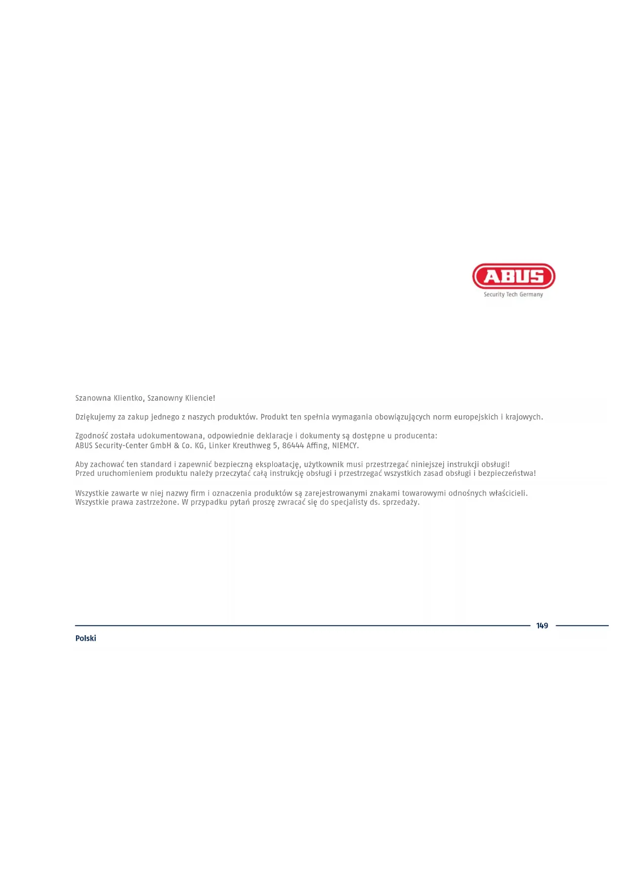 NAGRYWARKI IP Ta skrócona instrukcja zawiera opis pierwszych kroków w zakresie konguracji nagrywarki IP. Szczegółowe informacje znajdują się w instrukcji obsługi.149 Polski Szanowna Klientko, Szanowny Kliencie! Dziękujemy za zakup jednego znaszych produktów. Produkt ten spełnia wymagania obowiązujących norm europejskich ikrajowych. Zgodność została udokumentowana, odpowiednie deklaracje idokumenty są dostępne uproducenta: ABUS Security-Center GmbH & Co. KG, Linker Kreuthweg 5, 86444 Ang, NIEMCY. Aby zachować ten standard izapewnić bezpieczną eksploatację, użytkownik musi przestrzegać niniejszej instrukcji obsługi! Przed uruchomieniem produktu należy przeczytać całą instrukcję obsługi iprzestrzegać wszystkich zasad obsługi ibezpieczeństwa! Wszystkie zawarte wniej nazwy rm ioznaczenia produktów są zarejestrowanymi znakami towarowymi odnośnych właścicieli. Wszystkie prawa zastrzeżone. Wprzypadku pytań proszę zwracać się do specjalisty ds. sprzedaży.150 Polski ZAWARTOŚĆ OPAKOWANIA TVVR36300: