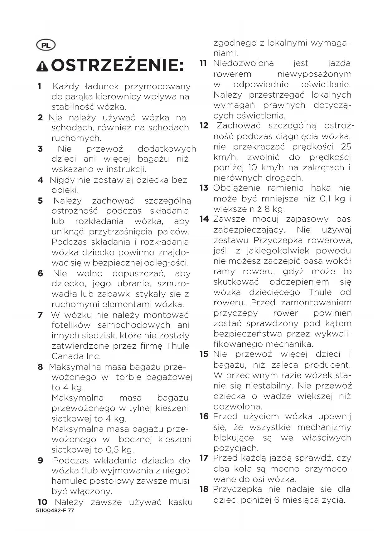 OSTRZEŻENIE: 1 Każdy ładunek przymocowany do pałąka kierownicy wpływa na stabilność wózka. 2 Nie należy używać wózka na schodach, również na schodach ruchomych. 3 Nie przewoź dodatkowych dzieci ani więcej bagażu niż wskazano w instrukcji. 4 Nigdy nie zostawiaj dziecka bez opieki. 5 Należy zachować szczególną ostrożność podczas składania lub rozkładania wózka, aby uniknąć przytrzaśnięcia palców. Podczas składania i rozkładania wózka dziecko powinno znajdo- wać się w bezpiecznej odległości. 6 Nie wolno dopuszczać, aby dziecko, jego ubranie, sznuro- wadła lub zabawki stykały się z ruchomymi elementami wózka. 7 W wózku nie należy montować fotelików samochodowych ani innych siedzisk, które nie zostały zatwierdzone przez firmę Thule Canada Inc. 8 Maksymalna masa bagażu prze- wożonego w torbie bagażowej to 4kg. Maksymalna masa bagażu przewożonego wtylnej kieszeni siatkowej to 4kg. Maksymalna masa bagażu prze- wożonego w bocznej kieszeni siatkowej to 0,5kg. 9 Podczas wkładania dziecka do wózka (lub wyjmowania z niego) hamulec postojowy zawsze musi być włączony. 10 Należy zawsze używać kasku zgodnego zlokalnymi wymaga- niami. 11 Niedozwolona jest jazda rowerem niewyposażonym w odpowiednie oświetlenie. Należy przestrzegać lokalnych wymagań prawnych dotyczą- cych oświetlenia. 12 Zachować szczególną ostroż- ność podczas ciągnięcia wózka, nie przekraczać prędkości 25 km/h, zwolnić do prędkości poniżej 10 km/h na zakrętach i nierównych drogach. 13 Obciążenie ramienia haka nie może być mniejsze niż 0,1 kg i większe niż 8kg. 14 Zawsze mocuj zapasowy pas zabezpieczający. Nie używaj zestawu Przyczepka rowerowa, jeśli z jakiegokolwiek powodu nie możesz zaczepić pasa wokół ramy roweru, gdyż może to skutkować odczepieniem się wózka dziecięcego Thule od roweru. Przed zamontowaniem przyczepy rower powinien zostać sprawdzony pod kątem bezpieczeństwa przez wykwali- fikowanego mechanika. 15 Nie przewoź więcej dzieci i bagażu, niż zaleca producent. W przeciwnym razie wózek sta- nie się niestabilny. Nie przewoź dziecka o wadze większej niż dozwolona. 16 Przed użyciem wózka upewnij się, że wszystkie mechanizmy blokujące są we właściwych pozycjach. 17 Przed każdą jazdą sprawdź, czy oba koła są mocno przymoco- wane do osi wózka. 18 Przyczepka nie nadaje się dla dzieci poniżej 6miesiąca życia.51100482-F78 W przypadku dzieci poniżej 6mie- siąca życia należy zastosować odpowiednie akcesorium Thule.