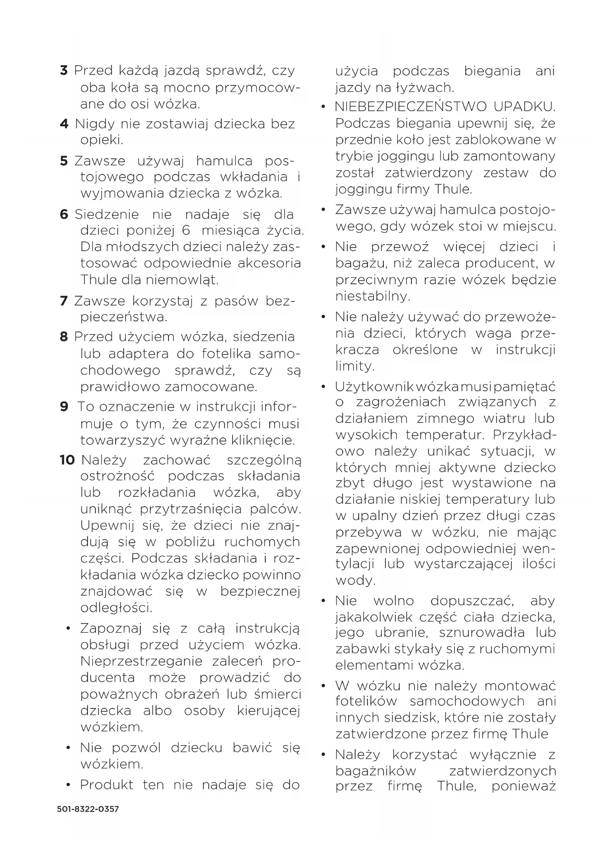 OSTRZEŻENIE: 1 Maksymalna masa bagażu prze- wożonego w części bagażowej to 4,5kg. Maksymalna masa bagażu prze- wożonego wtylnej kieszeni siat- kowej to 1,4kg. Maksymalna masa bagażu prze- wożonego w bocznej kieszeni siatkowej to 0,5kg. 2 Przed użyciem wózka upewnij się, że wszystkie mechanizmy blokujące są we właściwych pozycjach.501-8322-03 57 3 Przed każdą jazdą sprawdź, czy oba koła są mocno przymocow- ane do osi wózka. 4 Nigdy nie zostawiaj dziecka bez opieki. 5 Zawsze używaj hamulca pos- tojowego podczas wkładania i wyjmowania dziecka z wózka. 6 Siedzenie nie nadaje się dla dzieci poniżej 6 miesiąca życia. Dla młodszych dzieci należy zas- tosować odpowiednie akcesoria Thule dla niemowląt. 7 Zawsze korzystaj z pasów bez- pieczeństwa. 8 Przed użyciem wózka, siedzenia lub adaptera do fotelika samo- chodowego sprawdź, czy są prawidłowo zamocowane. 9 To oznaczenie w instrukcji infor- muje o tym, że czynności musi towarzyszyć wyraźne kliknięcie. 10 Należy zachować szczególną ostrożność podczas składania lub rozkładania wózka, aby uniknąć przytrzaśnięcia palców. Upewnij się, że dzieci nie znaj- dują się w pobliżu ruchomych części. Podczas składania i roz- kładania wózka dziecko powinno znajdować się w bezpiecznej odległości.