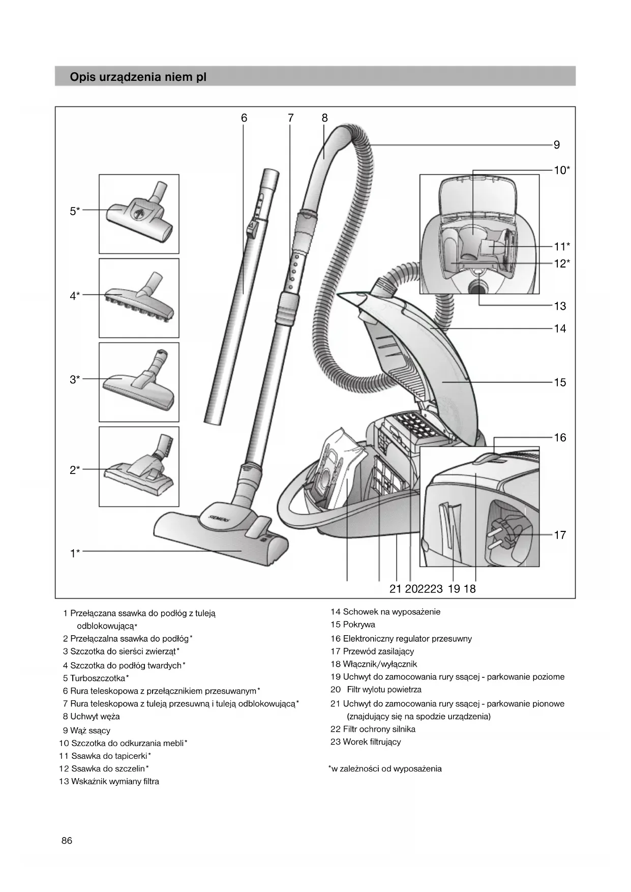 2 Przełączalna ssawka do podłóg* 3 Szczotka do sierści zwierząt* 4 Szczotka do podłóg twardych* 5 Turboszczotka* 6 Rura teleskopowa z przełącznikiem przesuwanym* 7 Rura teleskopowa z tuleją przesuwną i tuleją odblokowującą* 8 Uchwyt węża 9 Wąż ssący 10 Szczotka do odkurzania mebli* 11 Ssawka do tapicerki* 12 Ssawka do szczelin* 13 Wskaźnik wymiany filtra 14 Schowek na wyposażenie 15 Pokrywa 16 Elektroniczny regulator przesuwny 17 Przewód zasilający 18 Włącznik/wyłącznik 19 Uchwyt do zamocowania rury ssącej - parkowanie poziome