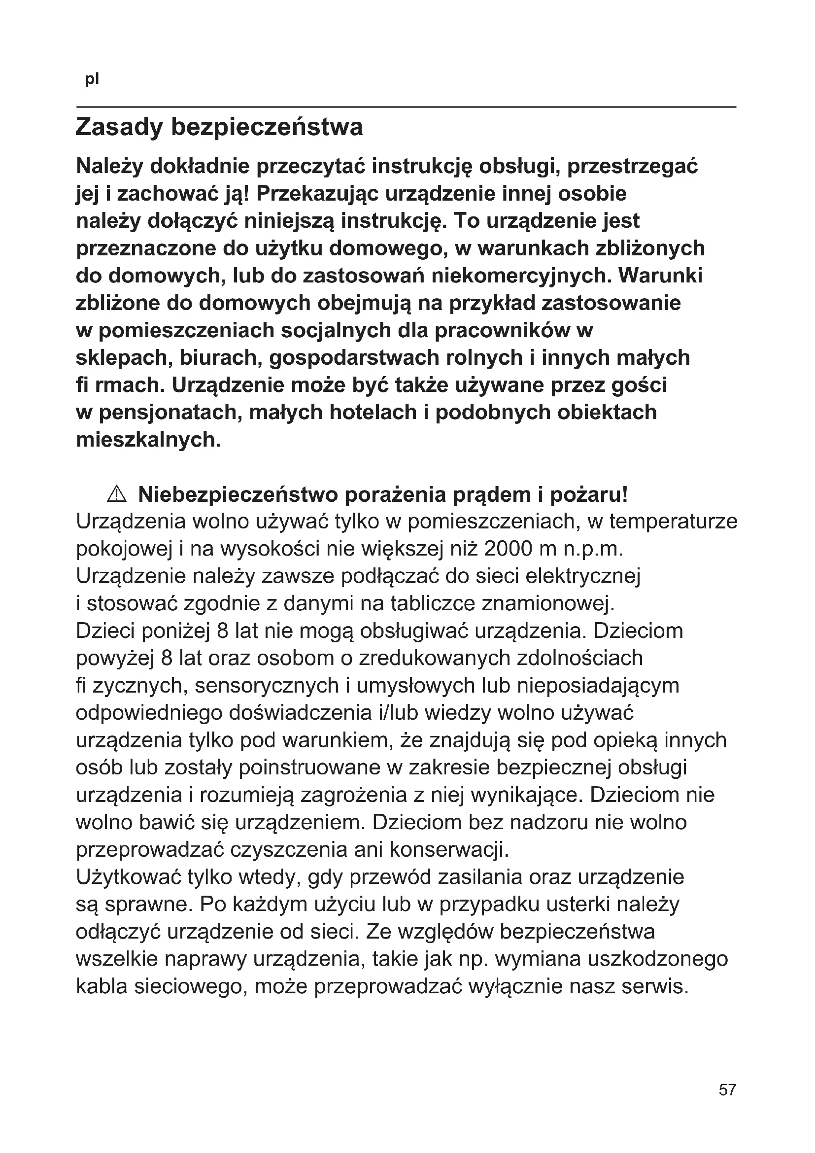 Zasady bezpieczeństwa Należy dokładnie przeczytać instrukcję obsługi, przestrzegać jej i zachować ją! Przekazując urządzenie innej osobie należy dołączyć niniejszą instrukcję. To urządzenie jest przeznaczone do użytku domowego, w warunkach zbliżonych do domowych, lub do zastosowań niekomercyjnych. Warunki zbliżone do domowych obejmują na przykład zastosowanie w pomieszczeniach socjalnych dla pracowników w sklepach, biurach, gospodarstwach rolnych i innych małych rmach. Urządzenie może być także używane przez gości w pensjonatach, małych hotelach i podobnych obiektach mieszkalnych. A Niebezpieczeństwo porażenia prądem i pożaru! Urządzenia wolno używać tylko w pomieszczeniach, w temperaturze pokojowej i na wysokości nie większej niż 2000 m n.p.m. Urządzenie należy zawsze podłączać do sieci elektrycznej i stosować zgodnie z danymi na tabliczce znamionowej. Dzieci poniżej 8 lat nie mogą obsługiwać urządzenia. Dzieciom powyżej 8 lat oraz osobom o zredukowanych zdolnościach zycznych, sensorycznych i umysłowych lub nieposiadającym odpowiedniego doświadczenia i/lub wiedzy wolno używać urządzenia tylko pod warunkiem, że znajdują się pod opieką innych osób lub zostały poinstruowane w zakresie bezpiecznej obsługi urządzenia i rozumieją zagrożenia z niej wynikające. Dzieciom nie wolno bawić się urządzeniem. Dzieciom bez nadzoru nie wolno przeprowadzać czyszczenia ani konserwacji. Użytkować tylko wtedy, gdy przewód zasilania oraz urządzenie są sprawne. Po każdym użyciu lub w przypadku usterki należy odłączyć urządzenie od sieci. Ze względów bezpieczeństwa wszelkie naprawy urządzenia, takie jak np. wymiana uszkodzonego kabla sieciowego, może przeprowadzać wyłącznie nasz serwis.58