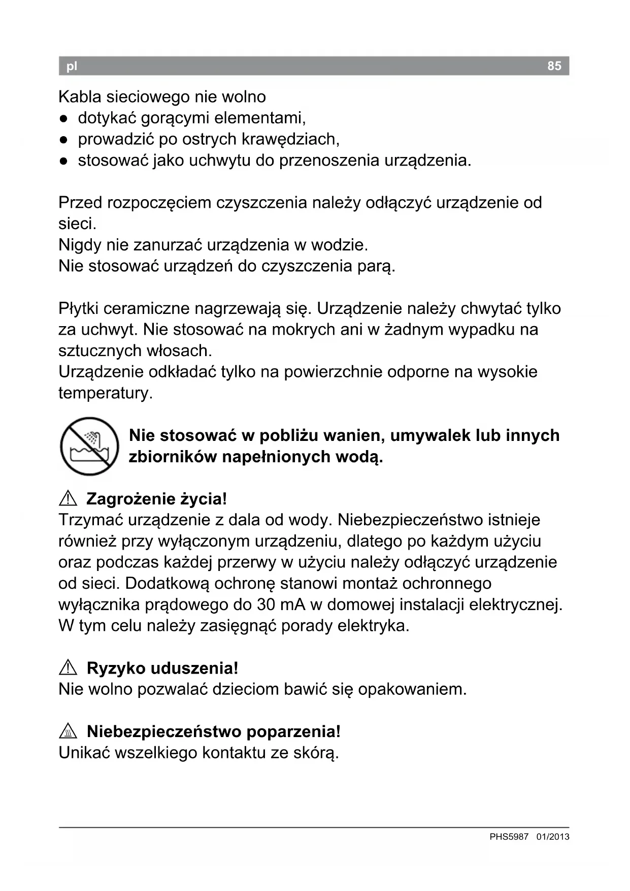 PHS5987 01/2013 85pl Kabla sieciowego nie wolno ● dotykać gorącymi elementami, ● prowadzić po ostrych krawędziach, ● stosować jako uchwytu do przenoszenia urządzenia. Przed rozpoczęciem czyszczenia należy odłączyć urządzenie od sieci. Nigdy nie zanurzać urządzenia w wodzie. Nie stosować urządzeń do czyszczenia parą. Płytki ceramiczne nagrzewają się. Urządzenie należy chwytać tylko za uchwyt. Nie stosować na mokrych ani w żadnym wypadku na sztucznych włosach. Urządzenie odkładać tylko na powierzchnie odporne na wysokie temperatury. Nie stosować w pobliżu wanien, umywalek lub innych zbiorników napełnionych wodą.