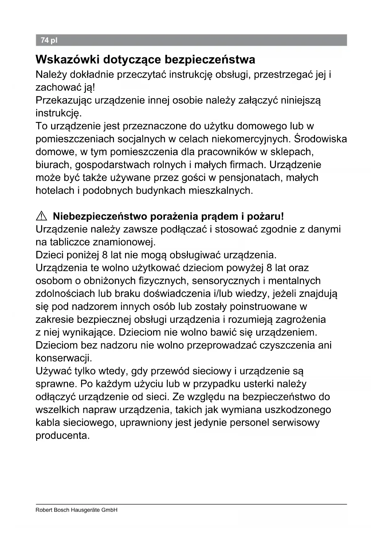 Niebezpieczeństwo porażenia prądem i pożaru! Urządzenie należy zawsze podłączać i stosować zgodnie z danymi na tabliczce znamionowej. Dzieci poniżej 8 lat nie mogą obsługiwać urządzenia. Urządzenia te wolno użytkować dzieciom powyżej 8 lat oraz osobom o obniżonych zycznych, sensorycznych i mentalnych zdolnościach lub braku doświadczenia i/lub wiedzy, jeżeli znajdują się pod nadzorem innych osób lub zostały poinstruowane w zakresie bezpiecznej obsługi urządzenia i rozumieją zagrożenia z niej wynikające. Dzieciom nie wolno bawić się urządzeniem. Dzieciom bez nadzoru nie wolno przeprowadzać czyszczenia ani konserwacji. Używać tylko wtedy, gdy przewód sieciowy i urządzenie są sprawne. Po każdym użyciu lub w przypadku usterki należy odłączyć urządzenie od sieci. Ze względu na bezpieczeństwo do wszelkich napraw urządzenia, takich jak wymiana uszkodzonego kabla sieciowego, uprawniony jest jedynie personel serwisowy producenta.75 PHS 9460 02/2013 75pl Kabla sieciowego nie wolno ● dotykać gorącymi elementami, ● prowadzić po ostrych krawędziach, ● stosować jako uchwytu do przenoszenia urządzenia. Przed rozpoczęciem czyszczenia należy odłączyć urządzenie od sieci. Nigdy nie zanurzać urządzenia w wodzie. Nie stosować urządzeń do czyszczenia parą. Płytki ceramiczne nagrzewają się. Urządzenie należy chwytać tylko za uchwyt. Nie stosować na mokrych ani w żadnym wypadku na sztucznych włosach. Urządzenie odkładać tylko na powierzchnie odporne na wysokie temperatury. Nie stosować w pobliżu wanien, umywalek lub innych zbiorników napełnionych wodą.