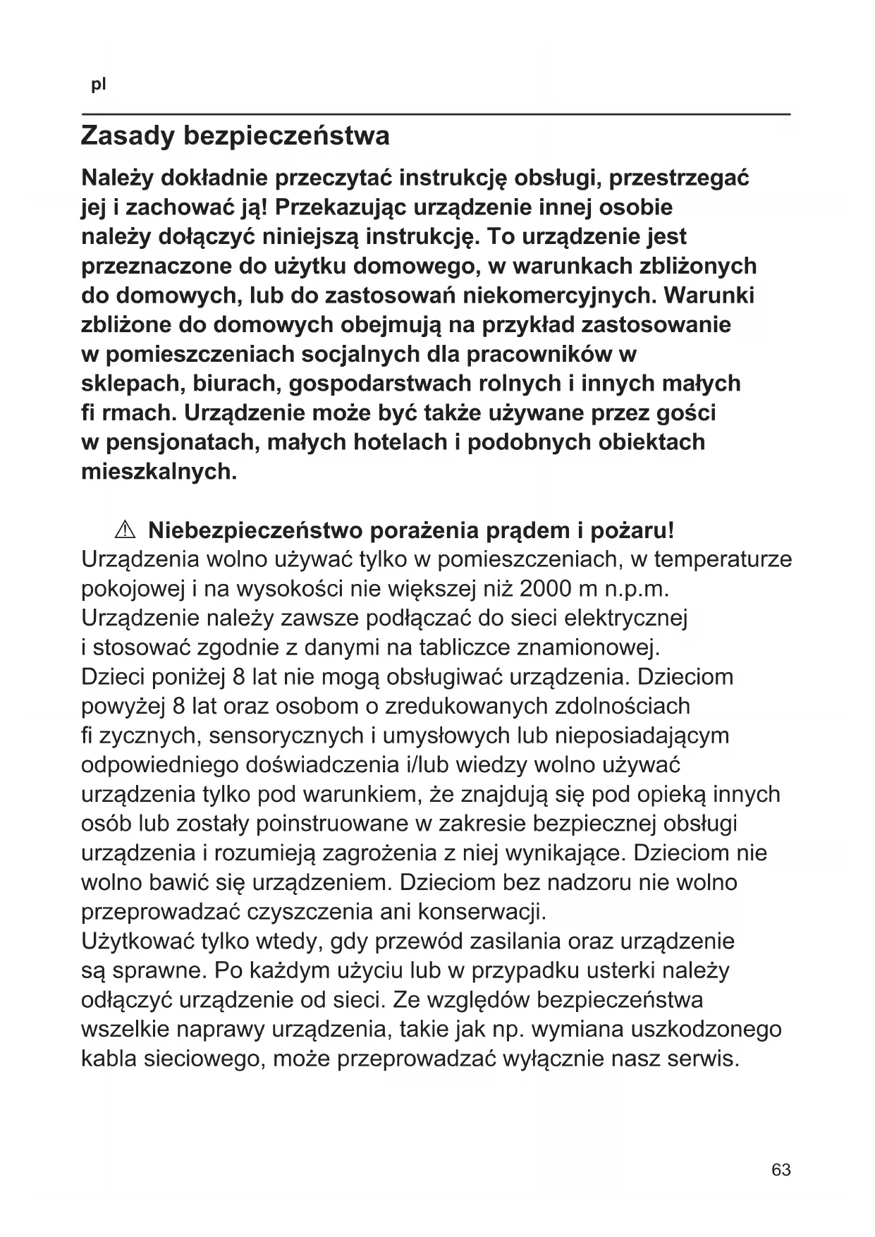 Zasady bezpieczeństwa Należy dokładnie przeczytać instrukcję obsługi, przestrzegać jej i zachować ją! Przekazując urządzenie innej osobie należy dołączyć niniejszą instrukcję. To urządzenie jest przeznaczone do użytku domowego, w warunkach zbliżonych do domowych, lub do zastosowań niekomercyjnych. Warunki zbliżone do domowych obejmują na przykład zastosowanie w pomieszczeniach socjalnych dla pracowników w sklepach, biurach, gospodarstwach rolnych i innych małych rmach. Urządzenie może być także używane przez gości w pensjonatach, małych hotelach i podobnych obiektach mieszkalnych. A Niebezpieczeństwo porażenia prądem i pożaru! Urządzenia wolno używać tylko w pomieszczeniach, w temperaturze pokojowej i na wysokości nie większej niż 2000 m n.p.m. Urządzenie należy zawsze podłączać do sieci elektrycznej i stosować zgodnie z danymi na tabliczce znamionowej. Dzieci poniżej 8 lat nie mogą obsługiwać urządzenia. Dzieciom powyżej 8 lat oraz osobom o zredukowanych zdolnościach zycznych, sensorycznych i umysłowych lub nieposiadającym odpowiedniego doświadczenia i/lub wiedzy wolno używać urządzenia tylko pod warunkiem, że znajdują się pod opieką innych osób lub zostały poinstruowane w zakresie bezpiecznej obsługi urządzenia i rozumieją zagrożenia z niej wynikające. Dzieciom nie wolno bawić się urządzeniem. Dzieciom bez nadzoru nie wolno przeprowadzać czyszczenia ani konserwacji. Użytkować tylko wtedy, gdy przewód zasilania oraz urządzenie są sprawne. Po każdym użyciu lub w przypadku usterki należy odłączyć urządzenie od sieci. Ze względów bezpieczeństwa wszelkie naprawy urządzenia, takie jak np. wymiana uszkodzonego kabla sieciowego, może przeprowadzać wyłącznie nasz serwis.64