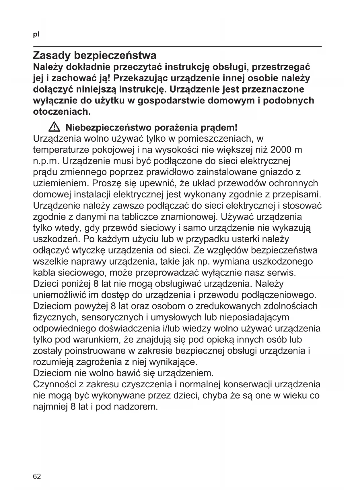 Zasady bezpieczeństwa Należy dokładnie przeczytać instrukcję obsługi, przestrzegać jej i zachować ją! Przekazując urządzenie innej osobie należy dołączyć niniejszą instrukcję. Urządzenie jest przeznaczone wyłącznie do użytku w gospodarstwie domowym i podobnych otoczeniach. W Niebezpieczeństwo porażenia prądem! Urządzenia wolno używać tylko w pomieszczeniach, w temperaturze pokojowej i na wysokości nie większej niż 2000 m n.p.m. Urządzenie musi być podłączone do sieci elektrycznej prądu zmiennego poprzez prawidłowo zainstalowane gniazdo z uziemieniem. Proszę się upewnić, że układ przewodów ochronnych domowej instalacji elektrycznej jest wykonany zgodnie z przepisami. Urządzenie należy zawsze podłączać do sieci elektrycznej i stosować zgodnie z danymi na tabliczce znamionowej. Używać urządzenia tylko wtedy, gdy przewód sieciowy i samo urządzenie nie wykazują uszkodzeń. Po każdym użyciu lub w przypadku usterki należy odłączyć wtyczkę urządzenia od sieci. Ze względów bezpieczeństwa wszelkie naprawy urządzenia, takie jak np. wymiana uszkodzonego kabla sieciowego, może przeprowadzać wyłącznie nasz serwis. Dzieci poniżej 8 lat nie mogą obsługiwać urządzenia. Należy uniemożliwić im dostęp do urządzenia i przewodu podłączeniowego. Dzieciom powyżej 8 lat oraz osobom o zredukowanych zdolnościach zycznych, sensorycznych i umysłowych lub nieposiadającym odpowiedniego doświadczenia i/lub wiedzy wolno używać urządzenia tylko pod warunkiem, że znajdują się pod opieką innych osób lub zostały poinstruowane w zakresie bezpiecznej obsługi urządzenia i rozumieją zagrożenia z niej wynikające. Dzieciom nie wolno bawić się urządzeniem. Czynności z zakresu czyszczenia i normalnej konserwacji urządzenia nie mogą być wykonywane przez dzieci, chyba że są one w wieku co najmniej 8 lat i pod nadzorem.63
