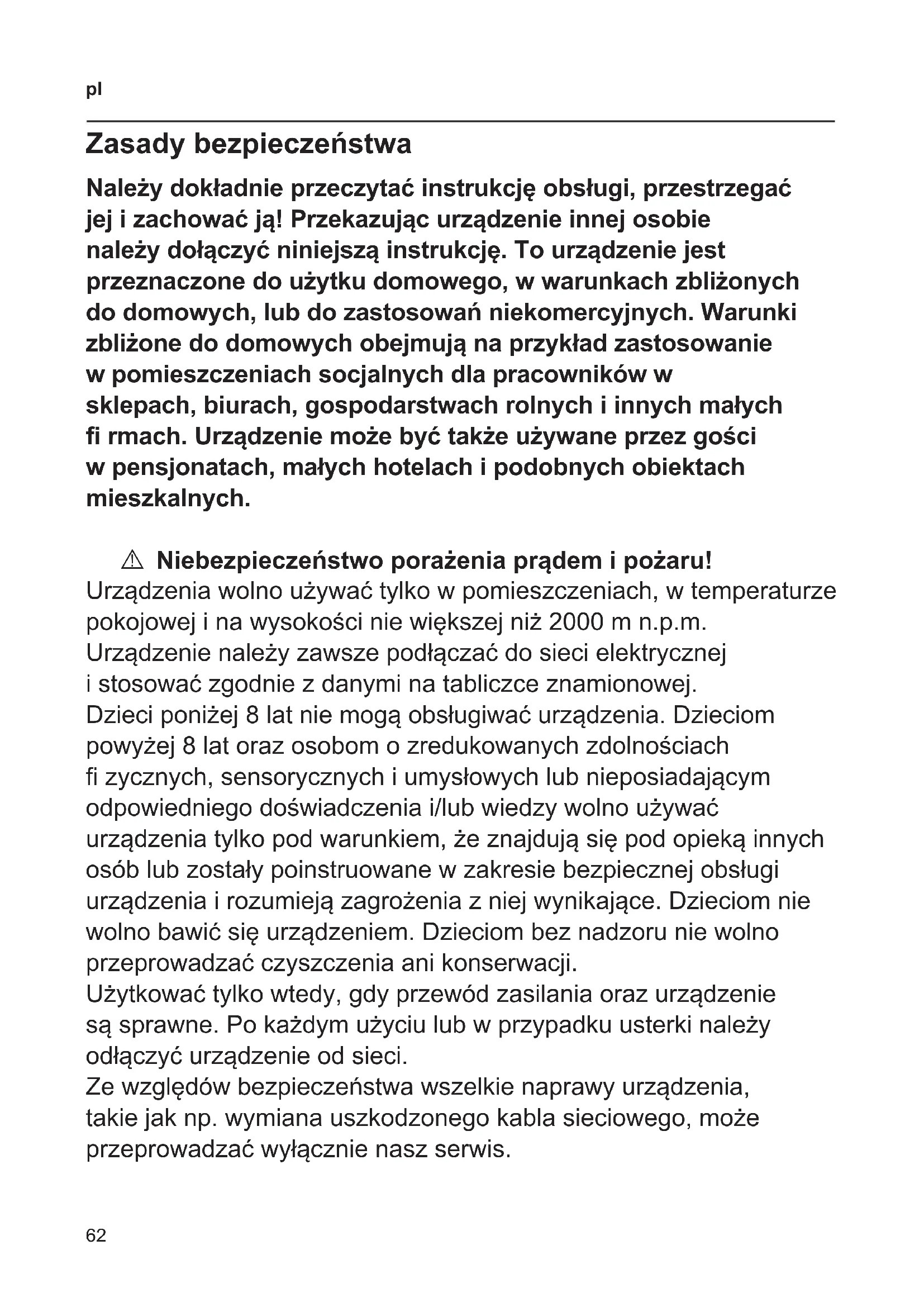 Zasady bezpieczeństwa Należy dokładnie przeczytać instrukcję obsługi, przestrzegać jej i zachować ją! Przekazując urządzenie innej osobie należy dołączyć niniejszą instrukcję. To urządzenie jest przeznaczone do użytku domowego, w warunkach zbliżonych do domowych, lub do zastosowań niekomercyjnych. Warunki zbliżone do domowych obejmują na przykład zastosowanie w pomieszczeniach socjalnych dla pracowników w sklepach, biurach, gospodarstwach rolnych i innych małych rmach. Urządzenie może być także używane przez gości w pensjonatach, małych hotelach i podobnych obiektach mieszkalnych. A Niebezpieczeństwo porażenia prądem i pożaru! Urządzenia wolno używać tylko w pomieszczeniach, w temperaturze pokojowej i na wysokości nie większej niż 2000 m n.p.m. Urządzenie należy zawsze podłączać do sieci elektrycznej i stosować zgodnie z danymi na tabliczce znamionowej. Dzieci poniżej 8 lat nie mogą obsługiwać urządzenia. Dzieciom powyżej 8 lat oraz osobom o zredukowanych zdolnościach zycznych, sensorycznych i umysłowych lub nieposiadającym odpowiedniego doświadczenia i/lub wiedzy wolno używać urządzenia tylko pod warunkiem, że znajdują się pod opieką innych osób lub zostały poinstruowane w zakresie bezpiecznej obsługi urządzenia i rozumieją zagrożenia z niej wynikające. Dzieciom nie wolno bawić się urządzeniem. Dzieciom bez nadzoru nie wolno przeprowadzać czyszczenia ani konserwacji. Użytkować tylko wtedy, gdy przewód zasilania oraz urządzenie są sprawne. Po każdym użyciu lub w przypadku usterki należy odłączyć urządzenie od sieci. Ze względów bezpieczeństwa wszelkie naprawy urządzenia, takie jak np. wymiana uszkodzonego kabla sieciowego, może przeprowadzać wyłącznie nasz serwis.63