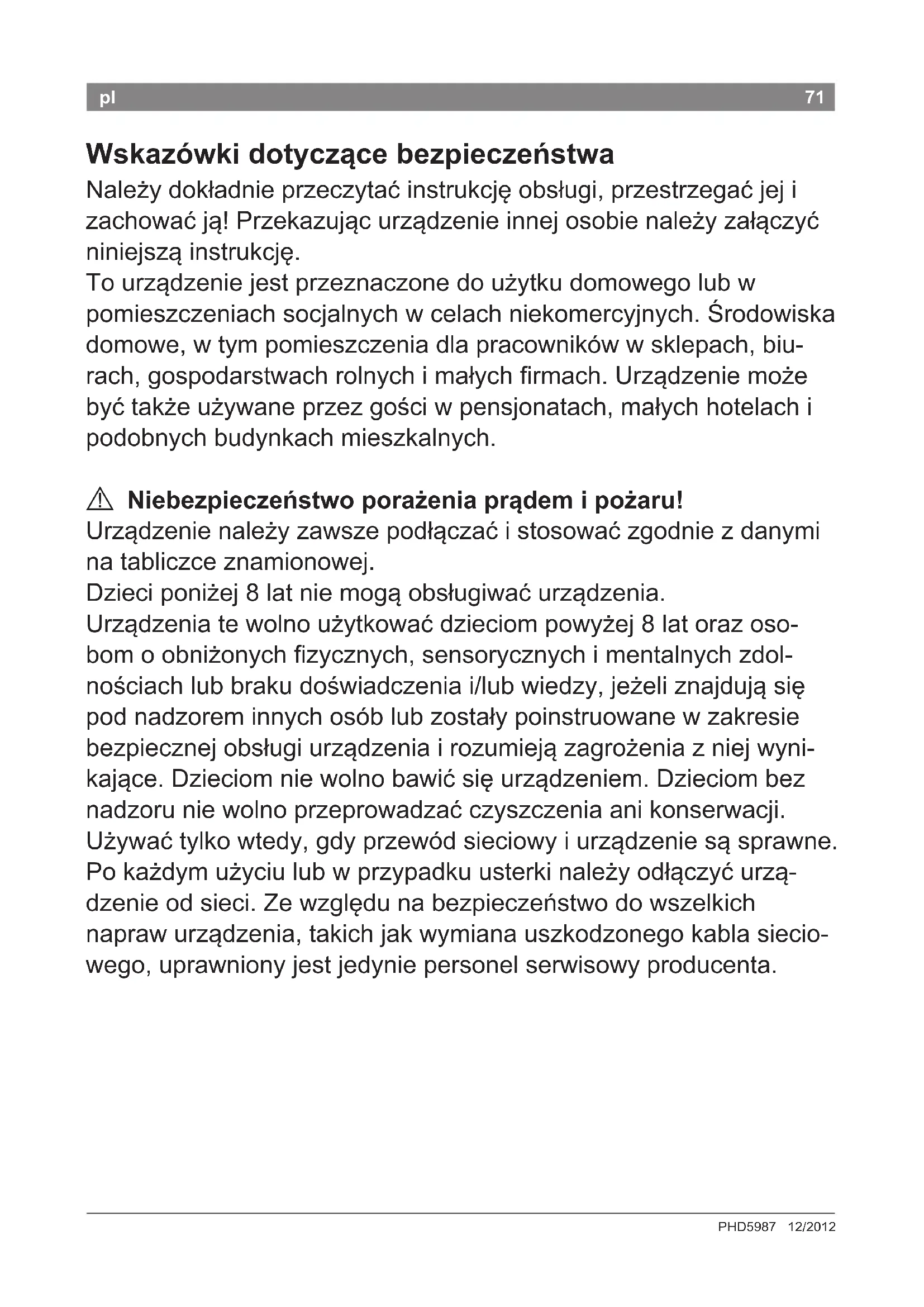 Takie oznakowanie informuje, że sprzęt ten, po okresie jego użytkowania nie może być umieszczany łącznie z innymi odpadami pochodzącymi z gospodarstwa domowego. Użytkownik jest zobowiązany do oddania go prowadzącym zbieranie zużytego sprzętu elektrycznego i elektronicznego. Prowa- dzący zbieranie, w tym lokalne punkty zbiórki, sklepy oraz gminne jednostki, tworzą odpowiedni system umożliwiający oddanie tego sprzętu. Właściwe postępowanie ze zużytym sprzętem elektrycznym i elektronicznym przyczynia się do uniknięcia szkodliwych dla zdrowia ludzi i środowiska naturalnego konsekwencji, wynikających z obecności składników niebezpiecznych oraz niewłaści- wego składowania i przetwarzania takiego sprzętu.77 PHD5987 12/2012 77hu Biztonsági előírások Olvassa el gyelmesen a használati útmutatót, és eszerint cselekedjen. Az útmutatót őrizze meg! Ha a készüléket továbbadja, mellékelje hozzá ezt az útmutatót. Ez a készülék háztartási, illetve háztartási jellegű, nem ipari jellegű használatra szolgál. Háztartási jellegű használat alatt például a boltok, irodák, mezőgazdasági és más kisipari üzemek személyzeti helyiségeiben való használatot, vagy panziókban, kisebb szállodák- ban és hasonló lakókörnyezetekben a vendégek általi használatot értjük.