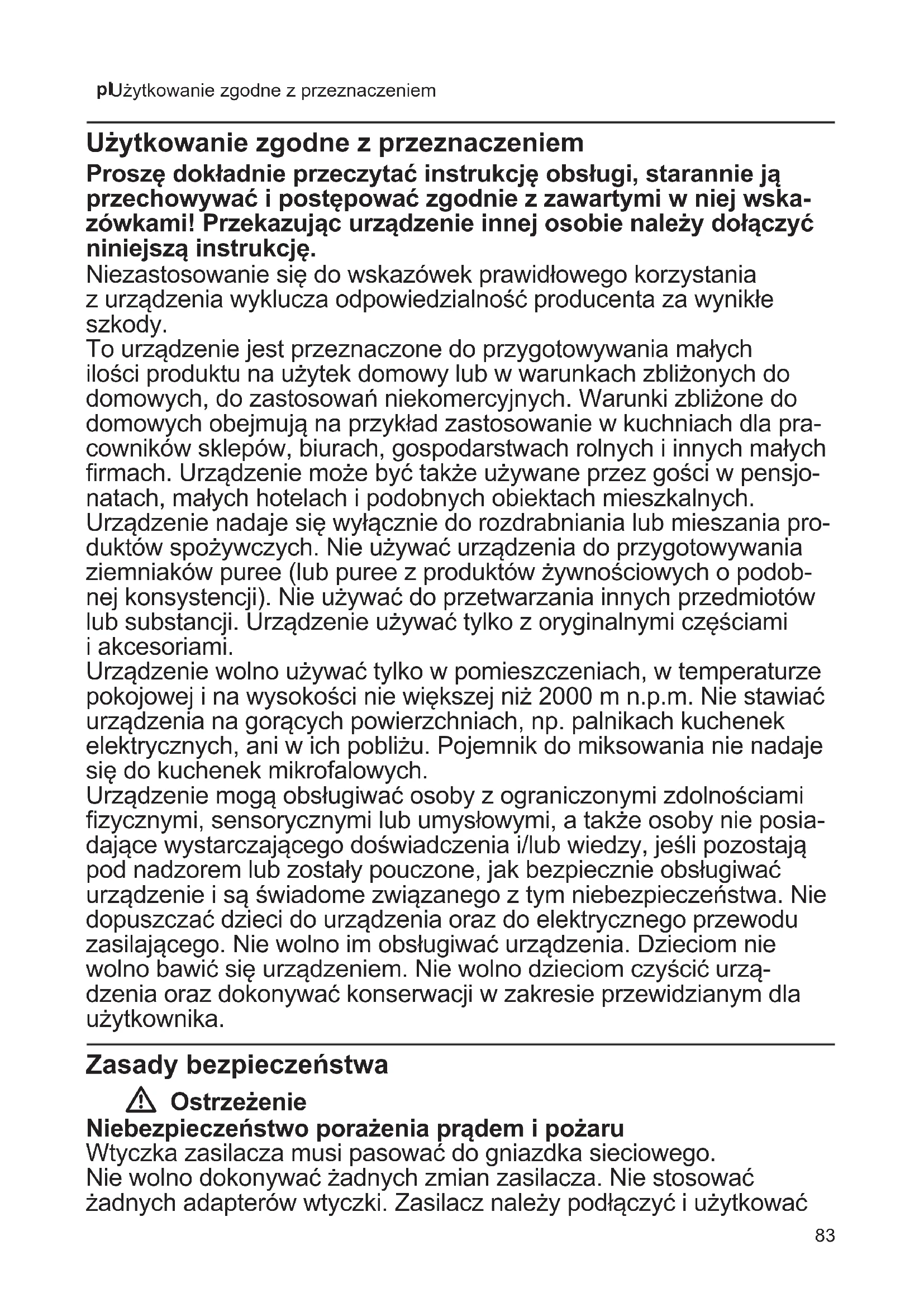 Użytkowanie zgodne z przeznaczeniem Użytkowanie zgodne z przeznaczeniem Proszę dokładnie przeczytać instrukcję obsługi, starannie ją przechowywać i postępować zgodnie z zawartymi w niej wska- zówkami! Przekazując urządzenie innej osobie należy dołączyć niniejszą instrukcję. Niezastosowanie się do wskazówek prawidłowego korzystania z urządzenia wyklucza odpowiedzialność producenta za wynikłe szkody. To urządzenie jest przeznaczone do przygotowywania małych ilości produktu na użytek domowy lub w warunkach zbliżonych do domowych, do zastosowań niekomercyjnych. Warunki zbliżone do domowych obejmują na przykład zastosowanie w kuchniach dla pra- cowników sklepów, biurach, gospodarstwach rolnych i innych małych rmach. Urządzenie może być także używane przez gości w pensjo- natach, małych hotelach i podobnych obiektach mieszkalnych. Urządzenie nadaje się wyłącznie do rozdrabniania lub mieszania pro- duktów spożywczych. Nie używać urządzenia do przygotowywania ziemniaków puree (lub puree z produktów żywnościowych o podob- nej konsystencji). Nie używać do przetwarzania innych przedmiotów lub substancji. Urządzenie używać tylko z oryginalnymi częściami i akcesoriami. Urządzenie wolno używać tylko w pomieszczeniach, w temperaturze pokojowej i na wysokości nie większej niż 2000 m n.p.m. Nie stawiać urządzenia na gorących powierzchniach, np. palnikach kuchenek elektrycznych, ani w ich pobliżu. Pojemnik do miksowania nie nadaje się do kuchenek mikrofalowych. Urządzenie mogą obsługiwać osoby z ograniczonymi zdolnościami zycznymi, sensorycznymi lub umysłowymi, a także osoby nie posia- dające wystarczającego doświadczenia i/lub wiedzy, jeśli pozostają pod nadzorem lub zostały pouczone, jak bezpiecznie obsługiwać urządzenie i są świadome związanego z tym niebezpieczeństwa. Nie dopuszczać dzieci do urządzenia oraz do elektrycznego przewodu zasilającego. Nie wolno im obsługiwać urządzenia. Dzieciom nie wolno bawić się urządzeniem. Nie wolno dzieciom czyścić urzą- dzenia oraz dokonywać konserwacji w zakresie przewidzianym dla użytkownika. Zasady bezpieczeństwa W Ostrzeżenie Niebezpieczeństwo porażenia prądem i pożaru Wtyczka zasilacza musi pasować do gniazdka sieciowego. Nie wolno dokonywać żadnych zmian zasilacza. Nie stosować żadnych adapterów wtyczki. Zasilacz należy podłączyć i użytkować84 pl Zasady bezpieczeństwa zgodnie z informacjami podanymi na tabliczce znamionowej. Urzą- dzenie można użytkować tylko wtedy, gdy akcesoria oraz samo urzą- dzenie nie są uszkodzone. W celu wykluczenia zagrożeń, naprawy urządzenia i akcesoriów może wykonywać tylko nasz autoryzowany punkt serwisowy. Wymianę akumulatora zlecić tylko w naszym auto- ryzowanym punkcie serwisowym. Przesyłać pocztą tylko kompletne, nierozmontowane urządzenia wraz z akumulatorami bez uszkodzeń mechanicznych. Nigdy nie wyjmować akumulatorów i wysyłać osobno. Zawsze nadzorować pracę urządzenia! Nie doprowadzić do stykania się przewodu przyłączeniowego z gorącymi elementami lub nie przeciągać go nad ostrymi krawędziami. Korpusu urządzenia, stacji ładowania i zasilacza nigdy nie zanurzać w wodzie, ani nie myć w zmywarce do naczyń. Urządzenia nie wolno chwytać mokrymi rękoma ani włączać na biegu jałowym. Końcówki miksującej nigdy nie zanurzać w miksowanym produkcie powyżej miejsca połączenia z korpusem urządzenia. Zasilacz musi być zawsze odłączany od sieci przy dłuższym nieużyt- kowaniu, po pełnym naładowaniu akumulatorów, przed złożeniem, demontażem lub czyszczeniem oraz w przypadku wystąpienia awarii. Urządzenie ładować tylko w stacji ładowania dostarczonej w ramach wyposażenia i za pomocą właściwego zasilacza. Zasilacza nie wolno przykrywać. Przedmioty łatwopalne przechowywać z dala od zasila- cza i stacji ładowania. W Ostrzeżenie Niebezpieczeństwo wybuchu! Akumulatory chronić przed wysoką temperaturą i ogniem. W Ostrzeżenie Niebezpieczeństwo zranienia Po bezpośrednim użyciu urządzenia odczekać do zatrzymania się noża końcówki miksującej. Przed wymianą elementów wyposażenia lub części dodatkowych, które znajdują się w ruchu podczas pracy urządzenia, należy koniecznie wyłączyć urządzenie. Nigdy nie chwytać za nóż końcówki miksującej. Noża końcówki miksującej w żadnym przypadku nie czyścić gołymi rękoma. W przypadku niewłaściwego zastosowania ciecz znajdująca się w akumulatorach może się przedostać do korpusu urządzenia. Proszę unikać kontaktu z tą cieczą. W Ostrzeżenie Niebezpieczeństwo oparzenia Zachować ostrożność podczas miksowania gorących produktów. Gorący produkt może się rozpryskiwać podczas miksowania. Koń- cówki miksującej nigdy nie stawiać na gorących powierzchniach,85