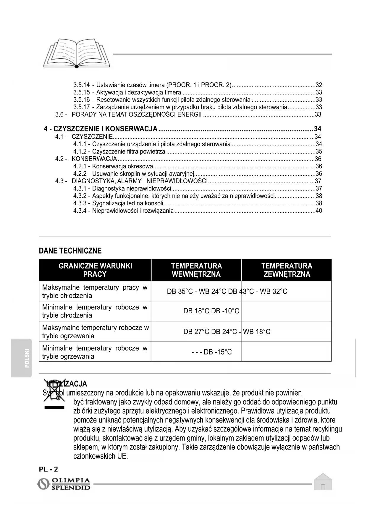 3.5.12 - Ustawianie timera ........................................................................................................31 3.5.13 - Ustawianie zegara i timera ...........................................................................................31PL - 2 POLSKI UTYLIZACJA Symbol umieszczony na produkcie lub na opakowaniu wskazuje, że produkt nie powinien być traktowany jako zwykły odpad domowy, ale należy go oddać do odpowiedniego punktu zbiórki zużytego sprzętu elektrycznego i elektronicznego. Prawidłowa utylizacja produktu pomoże uniknąć potencjalnych negatywnych konsekwencji dla środowiska i zdrowia, które wiążą się z niewłaściwą utylizacją. Aby uzyskać szczegółowe informacje na temat recyklingu produktu, skontaktować się z urzędem gminy, lokalnym zakładem utylizacji odpadów lub sklepem, w którym został zakupiony. Takie zarządzenie obowiązuje wyłącznie w państwach członkowskich UE.
