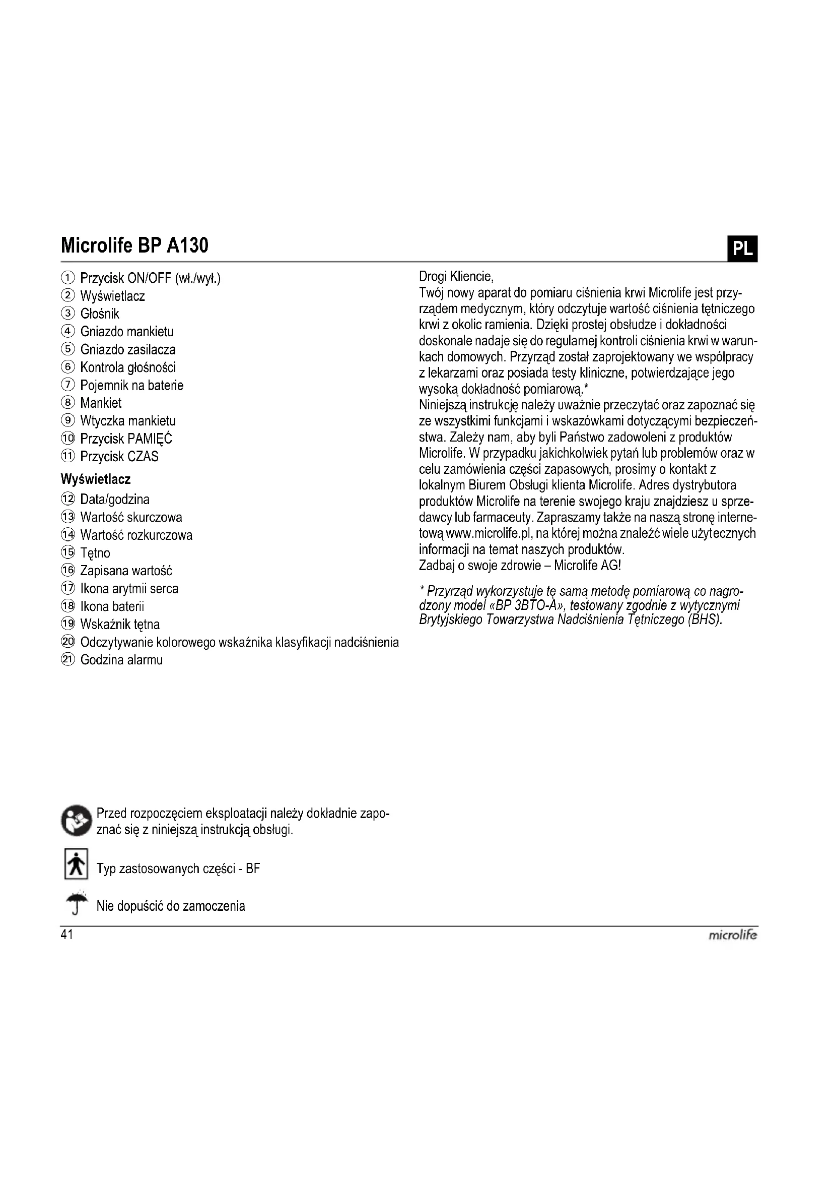Resolución: 1 mm Hg Precisión estática: presión dentro de ± 3 mm Hg Precisión del pulso: ± 5% del valor medido Fuente de corriente: 4 baterías alcalinas 1,5 V; tamaño AA Adaptador de voltaje c.a. 6V, 600 mA (opcional) Referencia a los estándares: EN 1060-1 /-3 /-4; IEC 60601-1; IEC 60601-1-2 (EMC); IEC 60601-1-1140BP A130 ES41 Wyświetlacz Przed rozpoczęciem eksploatacji należy dokładnie zapo- znać się z niniejszą instrukcją obsługi. Typ zastosowanych części - BF Drogi Kliencie, Twój nowy aparat do pomiaru ciśnienia krwi Microlife jest przy- rządem medycznym, który odczytuje wartość ciśnienia tętniczego krwi z okolic ramienia. Dzięki prostej obsłudze i dokładności doskonale nadaje się do regularnej kontroli ciśnienia krwi w warun- kach domowych. Przyrząd został zaprojektowany we współpracy z lekarzami oraz posiada testy kliniczne, potwierdzające jego wysoką dokładność pomiarową.* Niniejszą instrukcję należy uważnie przeczytać oraz zapoznać się ze wszystkimi funkcjami i wskazówkami dotyczącymi bezpieczeń- stwa. Zależy nam, aby byli Państwo zadowoleni z produktów Microlife. W przypadku jakichkolwiek pytań lub problemów oraz w celu zamówienia części zapasowych, prosimy o kontakt z lokalnym Biurem Obsługi klienta Microlife. Adres dystrybutora produktów Microlife na terenie swojego kraju znajdziesz u sprze- dawcy lub farmaceuty. Zapraszamy także na naszą stronę interne- tową www.microlife.pl, na której można znaleźć wiele użyt ecznych inf ormacji na temat naszych produktów. Zadbaj o swoje zdrowie – Microlife AG!