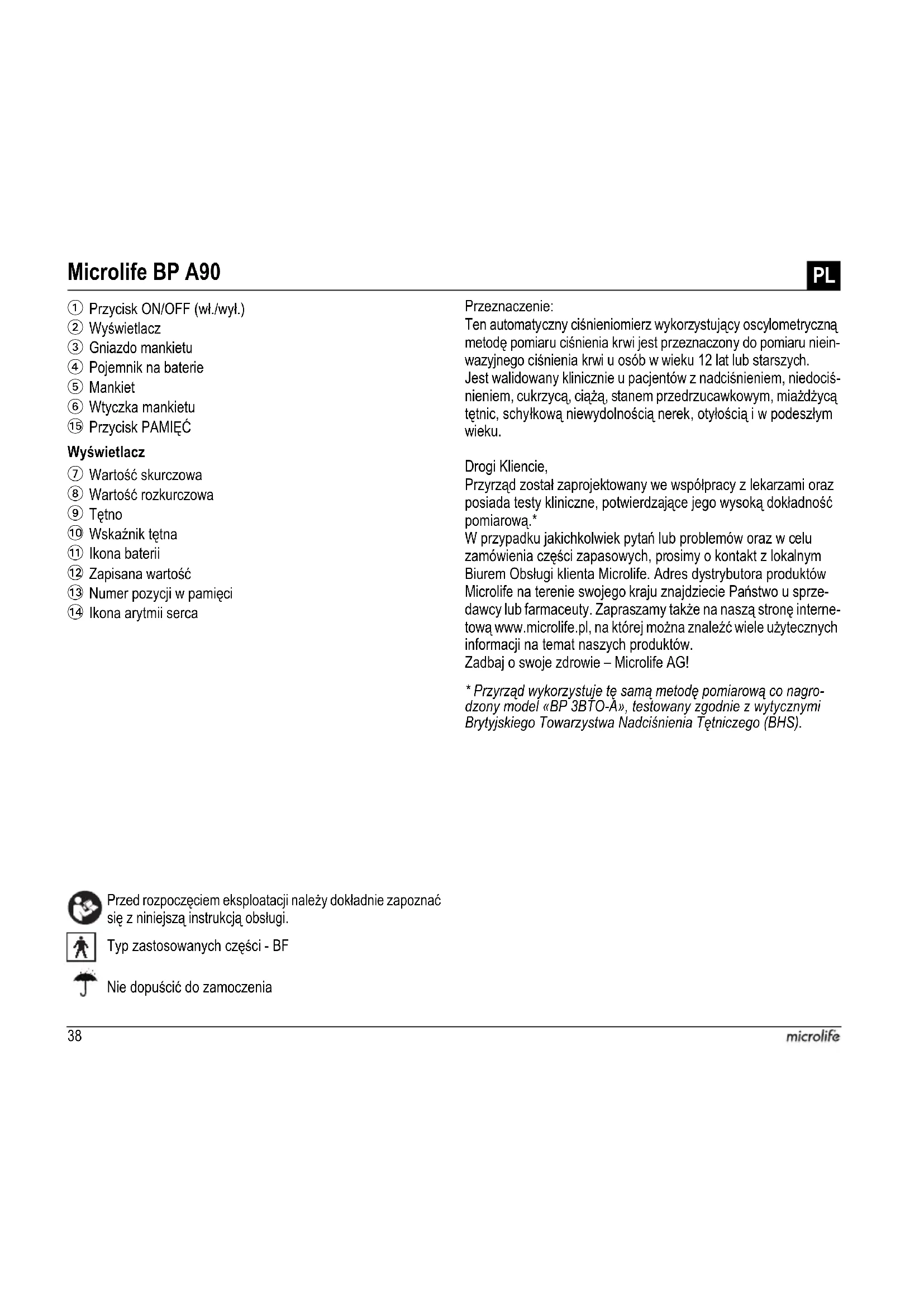 Комплектующие: 2 года38 Wyświetlacz Przed rozpoczęciem eksploatacji należy dokładnie zapoznać się z niniejszą instrukcją obsługi. Typ zastosowanych części - BF Przeznaczenie: Ten automatyczny ciśnieniomierz wykorzystujący oscylometryczną metodę pomiaru ciśnienia krwi jest przeznaczony do pomiaru niein- wazyjnego ciśnienia krwi u osób w wieku 12 lat lub starszych. Jest walidowany klinicznie u pacjentów z nadciśnieniem, niedociś- nieniem, cukrzycą, ciążą, stanem przedrzucawkowym, miażdżycą tętnic, schyłkową niewydolnością nerek, otyłością i w podeszłym wieku. Drogi Kliencie, Przyrząd został zaprojektowany we współpracy z lekarzami oraz posiada testy kliniczne, potwierdzające jego wysoką dokładność pomiarową.* W przypadku jakichkolwiek pytań lub problemów oraz w celu zamówienia części zapasowych, prosimy o kontakt z lokalnym Biurem Obsługi klienta Microlife. Adres dystrybutora produktów Microlife na terenie swojego kraju znajdziecie Państwo u sprze- dawcy lub farmaceuty. Zapraszamy także na naszą stronę interne- tową www.microlife.pl, na której można znaleźć wiele użytecznych informacji na temat naszych produktów. Zadbaj o swoje zdrowie – Microlife AG!