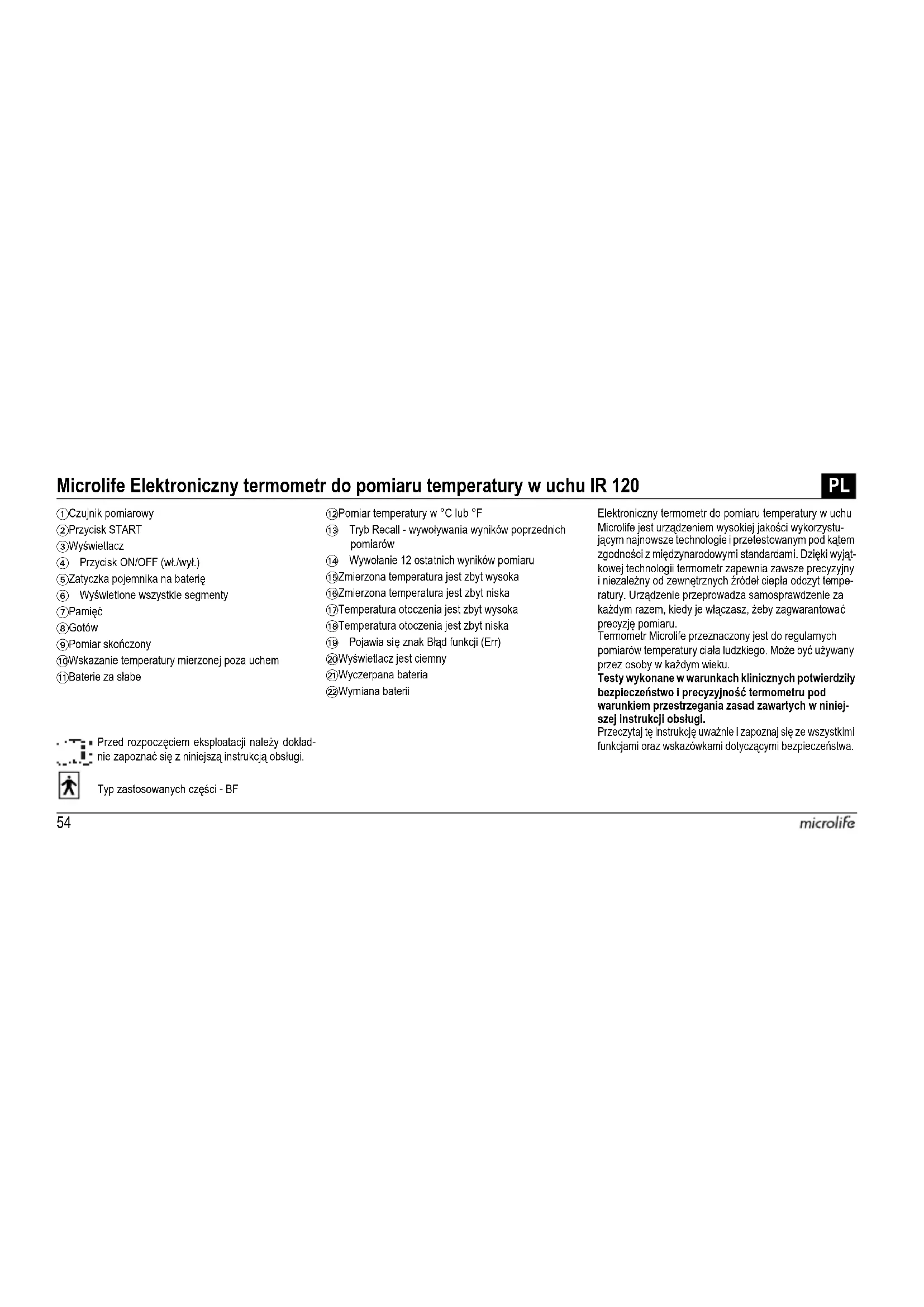 59 г (с батареей), 56 г (без батареи) Соответствие стандартам: EN 12470-5; ASTM E1965; IEC 60601-1; IEC 60601-1-2 (EMC)53IR 120 RU54 Przed rozpoczęciem eksploatacji należy dokład- nie zapoznać się z niniejszą instrukcją obsługi. Typ zastosowanych części - BF Elektroniczny termometr do pomiaru temperatury w uchu Microlife jest urządzeniem wysokiej jakości wykorzystu- jącym najnowsze technologie i przetestowanym pod kątem zgodności z międzynarodowymi standardami. Dzięki wyjąt- kowej technologii termometr zapewnia zawsze precyzyjny i niezależny od zewnętrznych źródeł ciepła odczyt tempe- ratury. Urządzenie przeprowadza samosprawdzenie za każdym razem, kiedy je włączasz, żeby zagwarantować precyzję pomiaru. Termometr Microlife przeznaczony jest do regularnych pomiarów temperatury ciała ludzkiego. Może być używany przez osoby w każdym wieku. Testy wykonane w warunkach klinicznych potwierdziły bezpieczeństwo i precyzyjność termometru pod warunkiem przestrzegania zasad zawartych w niniej- szej instrukcji obsługi. Przeczytaj tę instrukcję uważnie i zapoznaj się ze wszystkimi funkcjami oraz wskazówkami dotyczącymi bezpieczeństwa. Microlife Elektroniczny termometr do pomiaru temperatury w uchu IR 120