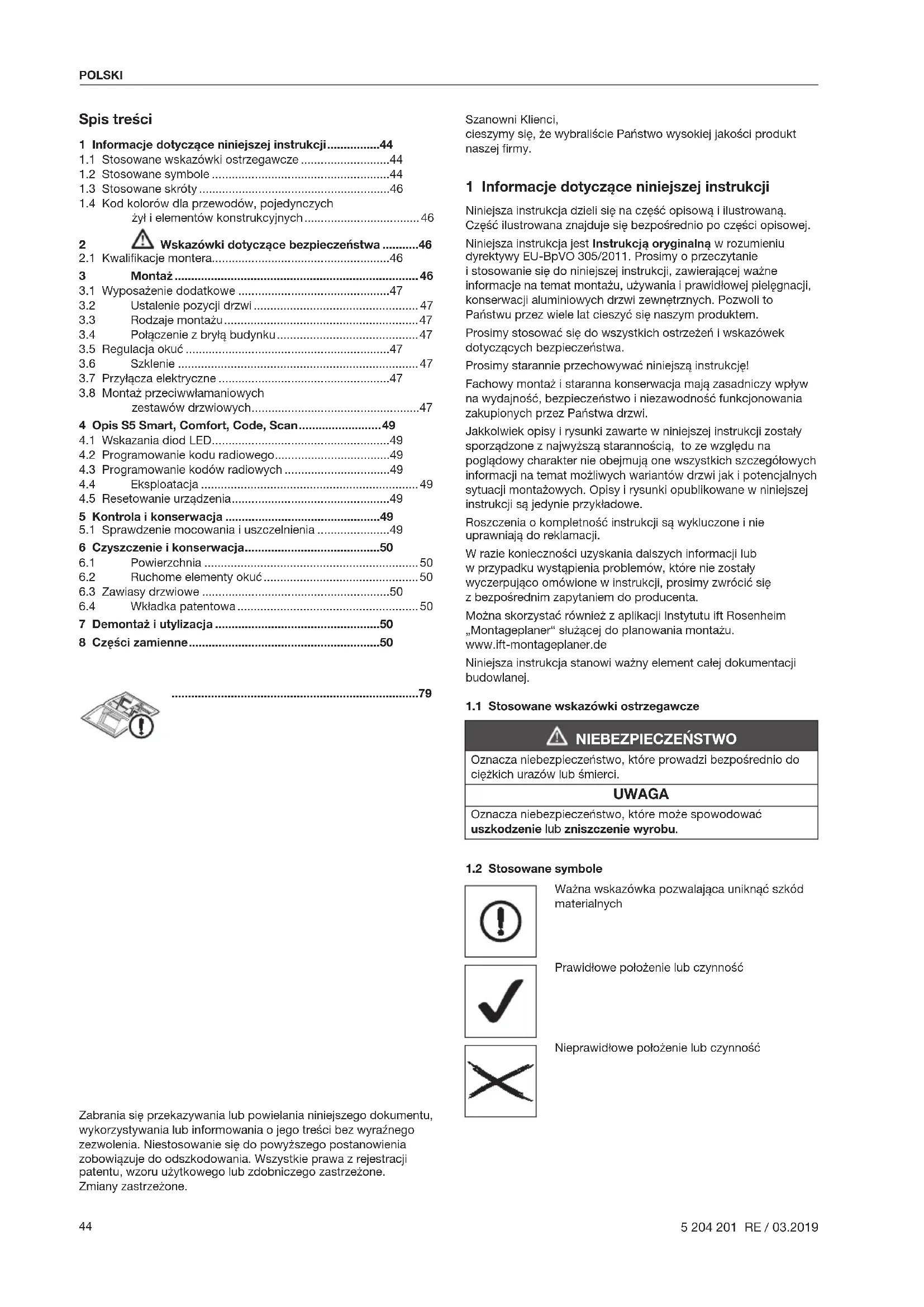 Szanowni Klienci, cieszymy się, że wybraliście Państwo wysokiej jakości produkt naszej firmy. 1 Informacje dotyczące niniejszej instrukcji Niniejsza instrukcja dzieli się na część opisową iilustrowaną. Część ilustrowana znajduje się bezpośrednio po części opisowej. Niniejsza instrukcja jest Instrukcją oryginalną w rozumieniu dyrektywyEU-BpVO 305/2011. Prosimy o przeczytanie istosowanie się do niniejszej instrukcji, zawierającej ważne informacje na temat montażu, używania i prawidłowej pielęgnacji, konserwacji aluminiowych drzwi zewnętrznych. Pozwoli to Państwu przez wiele lat cieszyć się naszym produktem. Prosimy stosować się do wszystkich ostrzeżeń iwskazówek dotyczących bezpieczeństwa. Prosimy starannie przechowywać niniejszą instrukcję! Fachowy montaż i staranna konserwacja mają zasadniczy wpływ na wydajność, bezpieczeństwo i niezawodność funkcjonowania zakupionych przez Państwa drzwi. Jakkolwiek opisy i rysunki zawarte w niniejszej instrukcji zostały sporządzone z najwyższą starannością, to ze względu na poglądowy charakter nie obejmują one wszystkich szczegółowych informacji na temat możliwych wariantów drzwi jak i potencjalnych sytuacji montażowych. Opisy i rysunki opublikowane w niniejszej instrukcji są jedynie przykładowe. Roszczenia o kompletność instrukcji są wykluczone i nie uprawniają do reklamacji. W razie konieczności uzyskania dalszych informacji lub wprzypadku wystąpienia problemów, które nie zostały wyczerpująco omówione w instrukcji, prosimy zwrócić się zbezpośrednim zapytaniem do producenta. Można skorzystać również z aplikacji Instytutu ift Rosenheim „Montageplaner“ służącej do planowania montażu. www.ift-montageplaner.de Niniejsza instrukcja stanowi ważny element całej dokumentacji budowlanej.