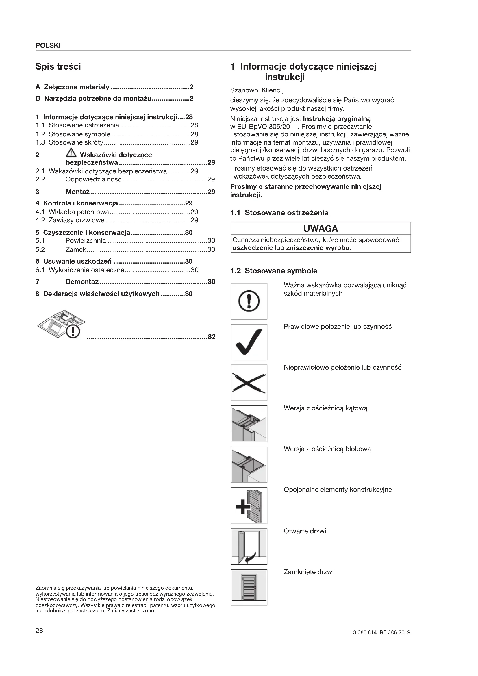 PORTUGUÊS1 Informacje dotyczące niniejszej instrukcji Szanowni Klienci, cieszymy się, że zdecydowaliście się Państwo wybrać wysokiej jakości produkt naszej firmy. Niniejsza instrukcja jest Instrukcją oryginalną wEU-BpVO305/2011. Prosimy o przeczytanie istosowanie się do niniejszej instrukcji, zawierającej ważne informacje na temat montażu, używania i prawidłowej pielęgnacji/konserwacji drzwi bocznych do garażu. Pozwoli to Państwu przez wiele lat cieszyć się naszym produktem. Prosimy stosować się do wszystkich ostrzeżeń iwskazówek dotyczących bezpieczeństwa. Prosimy o staranne przechowywanie niniejszej instrukcji.