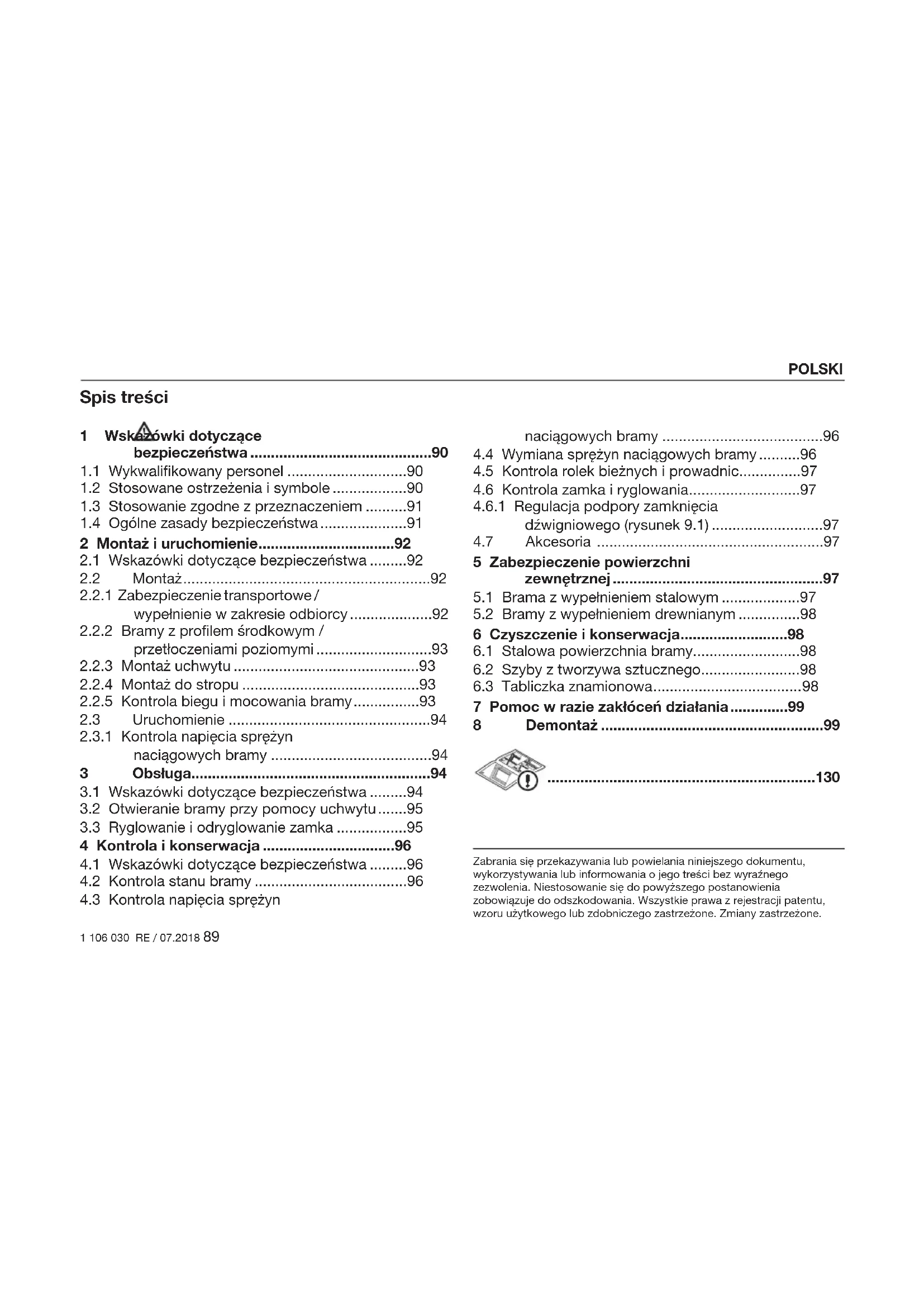 Należy niezwłocznie zlecić wymianę sprężyn naciągowych osobie posiadającej odpowiednie kwalifikacje. POLSKI1 106 030 RE / 07.2018 97
