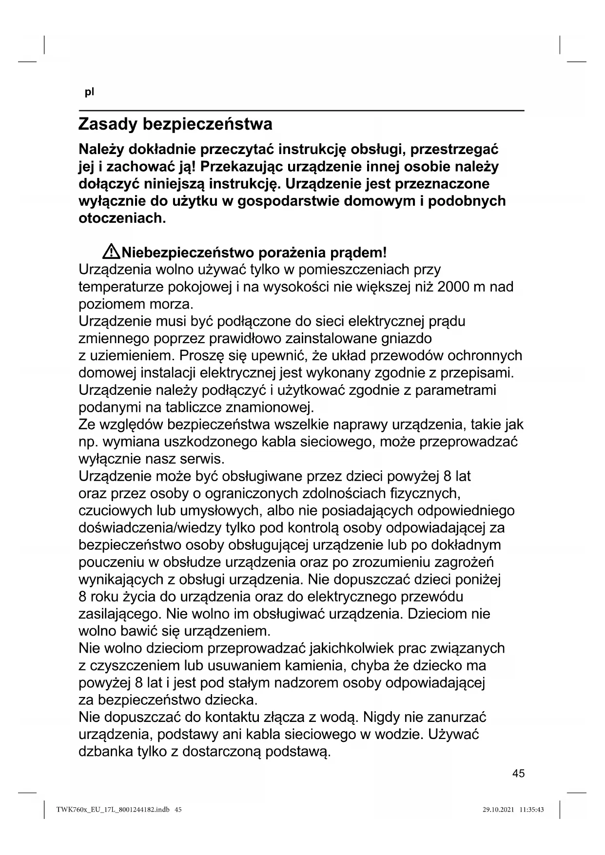 OSTRZEŻENIE: urządzenia tego nie używać w pobliżu wanien, pryszniców, umywalek lub innych zbiorników zawierających wodę. WRyzyko uduszenia! Nie zezwalać dzieciom na zabawę opakowaniem, a szczególnie folią. WNiebezpieczeństwo odniesienia obrażeń! Nieodpowiednie używanie urządzenia może prowadzić do powstania obrażeń. WUwaga! Czyszczenie powierzchni mających kontakt z żywnością! Należy przestrzegać specjalnych wymagań dotyczących czyszczenia, podanych w instrukcji. TWK760x_EU_17L_8001244182.indb 46TWK760x_EU_17L_8001244182.indb 46 29.10.2021 11:35:4329.10.2021 11:35:4347