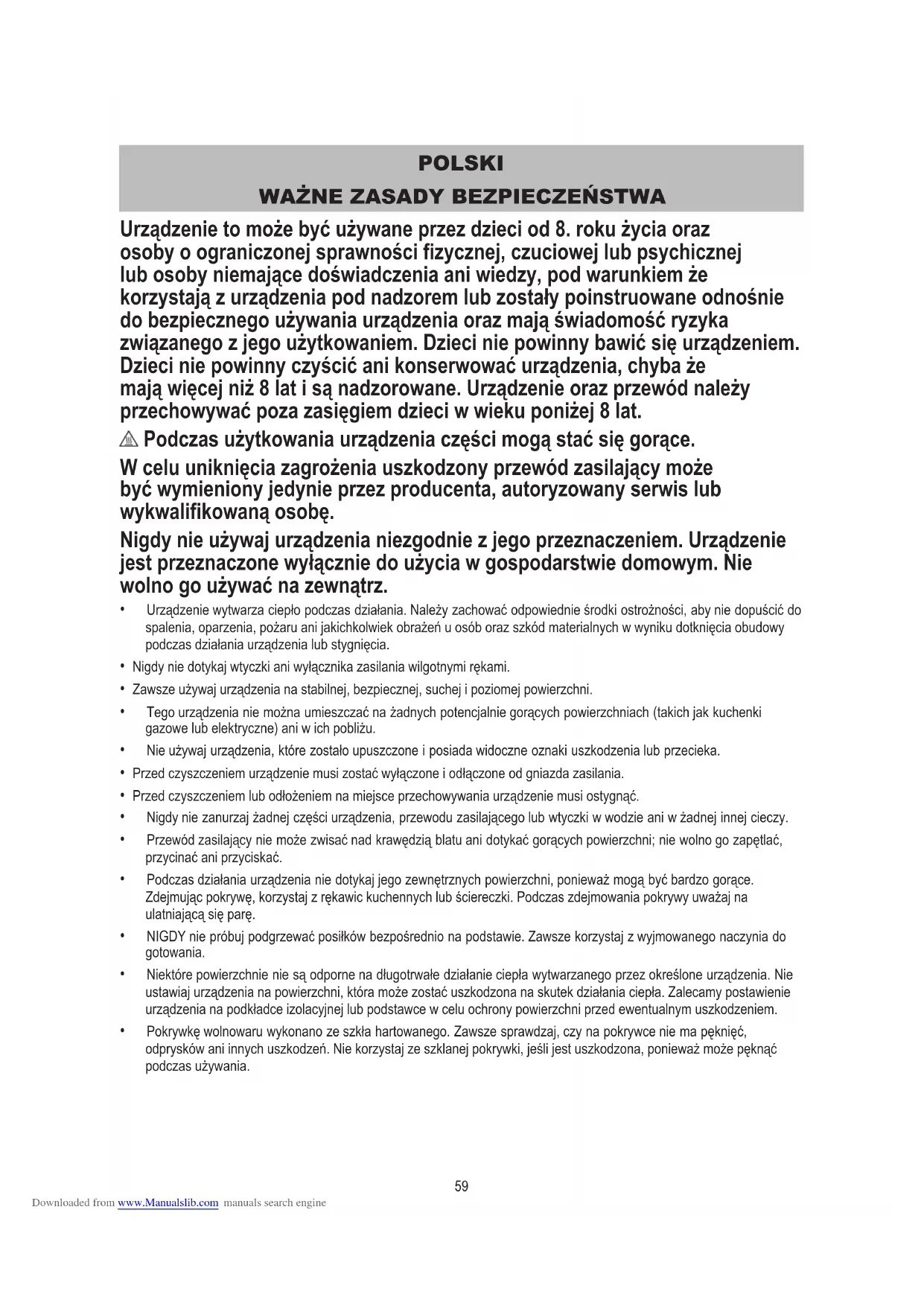 Urządzenie to może być używane przez dzieci od 8. roku życia oraz osoby o ograniczonej sprawności fizycznej, czuciowej lub psychicznej lub osoby niemające doświadczenia ani wiedzy, pod warunkiem że korzystają z urządzenia pod nadzorem lub zostały poinstruowane odnośnie do bezpiecznego używania urządzenia oraz mają świadomość ryzyka związanego z jego użytkowaniem. Dzieci nie powinny bawić się urządzeniem. Dzieci nie powinny czyścić ani konserwować urządzenia, chyba że mają więcej niż 8 lat i są nadzorowane. Urządzenie oraz przewód należy przechowywać poza zasięgiem dzieci w wieku poniżej 8 lat. Podczas użytkowania urządzenia części mogą stać się gorące. W celu uniknięcia zagrożenia uszkodzony przewód zasilający może być wymieniony jedynie przez producenta, autoryzowany serwis lub wykwalifikowaną osobę. Nigdy nie używaj urządzenia niezgodnie z jego przeznaczeniem. Urządzenie jest przeznaczone wyłącznie do użycia w gospodarstwie domowym. Nie wolno go używać na zewnątrz.
