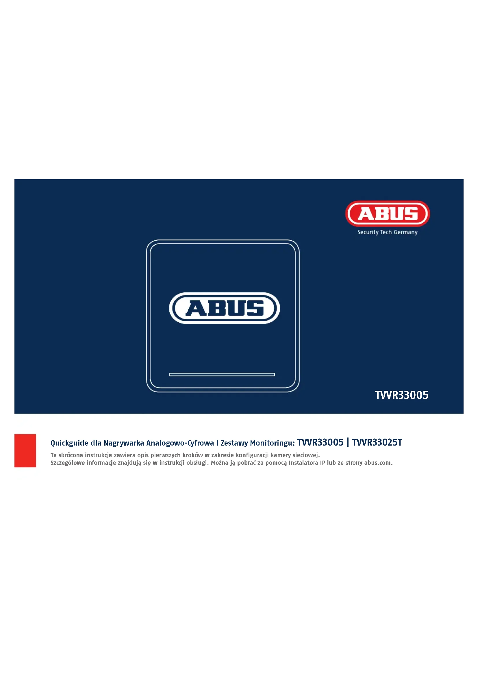 Di seguito sono indicate tutte le videocamere di rete compatibili. Utilizzando le caselle di controllo, selezionare le videocamere di rete desiderate e fare clic su Aggiungi. Passare alla schermata successiva con „Avanti“. Selezionare il tipo di registrazione. È possibile scegliere tra „In continuo“ e „Motion“. Chiudere l‘assistente alla con gurazione con „OK“.111 ItalianoQuickguide dla Nagrywarka Analogowo-Cyfrowa I Zestawy Monitoringu: TVVR33005 | TVVR33025T Ta skrócona instrukcja zawiera opis pierwszych kroków wzakresie konfiguracji kamery sieciowej. Szczegółowe informacje znajdują się winstrukcji obsługi. Można ją pobrać za pomocą Instalatora IP lub ze strony abus.com. TVVR33005113 Polski Szanowni klienci! Dziękujemy za zakup naszego produktu. Spełnia on wymagania obowiązujących norm europejskich i krajowych. Zgodność została udokumentowana, odpowiednie deklaracje i dokumenty są dostępne u producenta (ABUS Security-Center GmbH & Co. KG, Linker Kreuthweg 5, 86444 Ang). Aby zachować ten stan i zapewnić bezpieczną eksploatację, użytkownik musi przestrzegać niniejszej instrukcji obsługi! Przed uruchomieniem produktu przeczytaj całą instrukcję obsługi i przestrzegaj wszystkich zasad bezpieczeństwa! Wszystkie zawarte w niej nazwy rm i oznaczenia produktów są zarejestrowanymi znakami towarowymi odnośnych właścicieli. Wszystkie prawa zastrzeżone. Z pytaniami proszę zwracać się do specjalistycznego sprzedawcy!114 Polski Zakres dostawy TVVR33025T