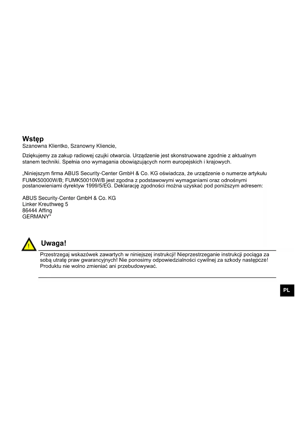 Wstęp Szanowna Klientko, Szanowny Kliencie, Dziękujemy za zakup radiowej czujki otwarcia. Urządzenie jest skonstruowane zgodnie z aktualnym stanem techniki. Spełnia ono wymagania obowiązujących norm europejskich i krajowych. „Niniejszym firma ABUS Security-Center GmbH & Co. KG oświadcza, że urządzenie o numerze artykułu FUMK50000W/B; FUMK50010W/B jest zgodna z podstawowymi wymaganiami oraz odnośnymi postanowieniami dyrektyw 1999/5/EG. Deklarację zgodności można uzyskać pod poniższym adresem: ABUS Security-Center GmbH & Co. KG Linker Kreuthweg 5 86444 Affing GERMANY"