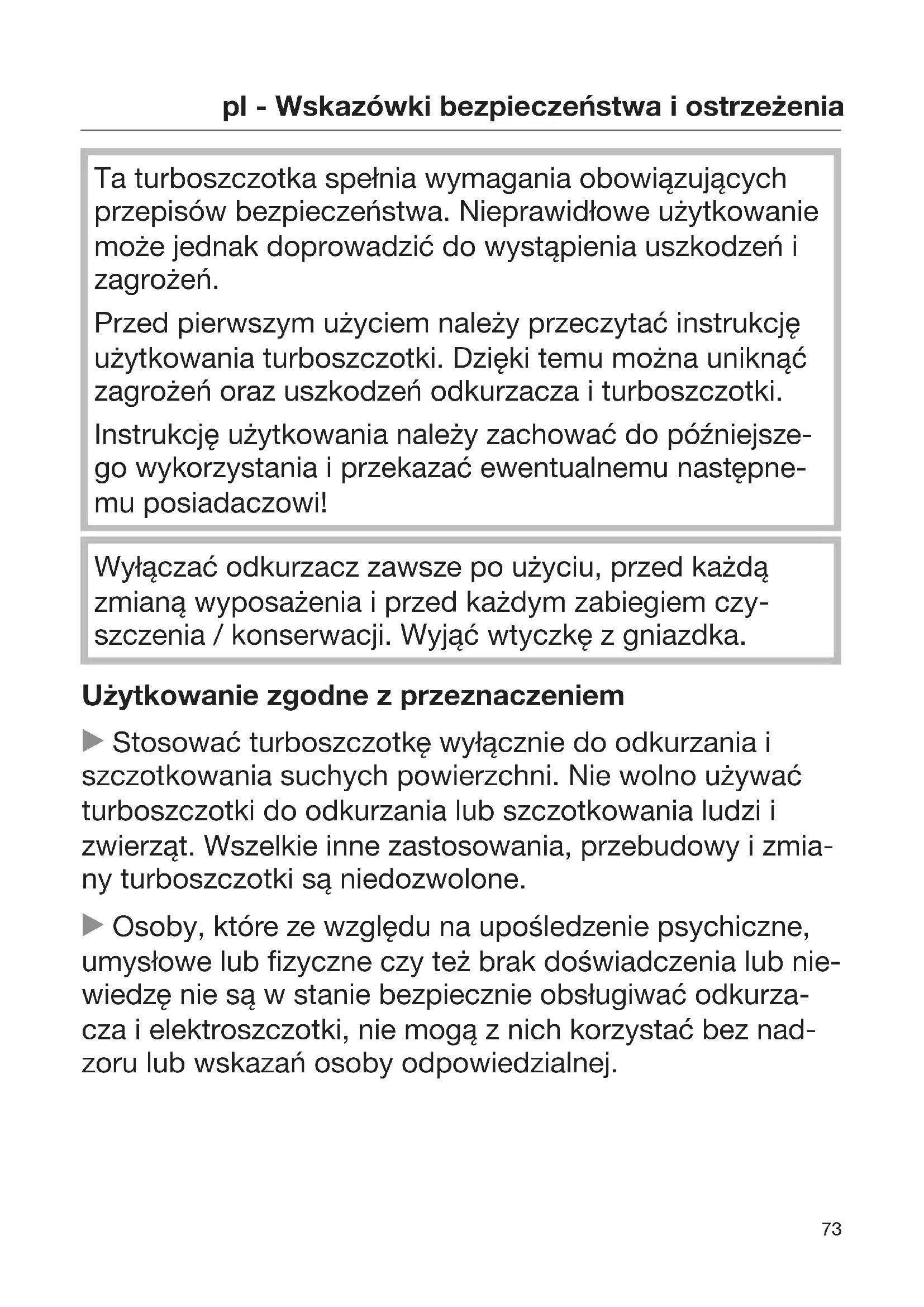 Ta turboszczotka spełnia wymagania obowiązujących przepisów bezpieczeństwa. Nieprawidłowe użytkowanie może jednak doprowadzić do wystąpienia uszkodzeń i zagrożeń. Przed pierwszym użyciem należy przeczytać instrukcję użytkowania turboszczotki. Dzięki temu można uniknąć zagrożeń oraz uszkodzeń odkurzacza i turboszczotki. Instrukcję użytkowania należy zachować do późniejsze‐ go wykorzystania i przekazać ewentualnemu następne‐ mu posiadaczowi! Wyłączać odkurzacz zawsze po użyciu, przed każdą zmianą wyposażenia i przed każdym zabiegiem czy‐ szczenia / konserwacji. Wyjąć wtyczkę z gniazdka. Użytkowanie zgodne z przeznaczeniem Stosować turboszczotkę wyłącznie do odkurzania i szczotkowania suchych powierzchni. Nie wolno używać turboszczotki do odkurzania lub szczotkowania ludzi i zwierząt. Wszelkie inne zastosowania, przebudowy i zmia‐ ny turboszczotki są niedozwolone. Osoby, które ze względu na upośledzenie psychiczne, umysłowe lub fizyczne czy też brak doświadczenia lub nie‐ wiedzę nie są w stanie bezpiecznie obsługiwać odkurza‐ cza i elektroszczotki, nie mogą z nich korzystać bez nad‐ zoru lub wskazań osoby odpowiedzialnej.pl - Wskazówki bezpieczeństwa i ostrzeżenia