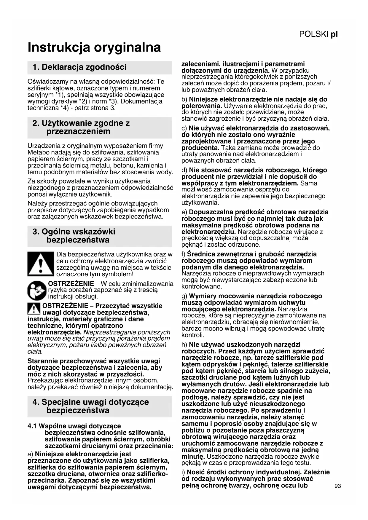 Instrukcja oryginalna Oświadczamy na własną odpowiedzialność: Te szlifierki kątowe, oznaczone typem i numerem seryjnym *1), spełniają wszystkie obowiązujące wymogi dyrektyw *2) i norm *3). Dokumentacja techniczna *4) - patrz strona 3. Urządzenia z oryginalnym wyposażeniem firmy Metabo nadają się do szlifowania, szlifowania papierem ściernym, pracy ze szczotkami i przecinania ściernicą metalu, betonu, kamienia i temu podobnym materiałów bez stosowania wody. Za szkody powstałe w wyniku użytkowania niezgodnego z przeznaczeniem odpowiedzialność ponosi wyłącznie użytkownik. Należy przestrzegać ogólnie obowiązujących przepisów dotyczących zapobiegania wypadkom oraz załączonych wskazówek bezpieczeństwa. Dla bezpieczeństwa użytkownika oraz w celu ochrony elektronarzędzia zwrócić szczególną uwagę na miejsca w tekście oznaczone tym symbolem! OSTRZEŻENIE – W celu zminimalizowania ryzyka obrażeń zapoznać się z treścią instrukcji obsługi. OSTRZEŻENIE – Przeczytać wszystkie uwagi dotyczące bezpieczeństwa, instrukcje, materiały graficzne i dane techniczne, którymi opatrzono elektronarzędzie. Nieprzestrzeganie poniższych uwag może się stać przyczyną porażenia prądem elektrycznym, pożaru i/albo poważnych obrażeń ciała. Starannie przechowywać wszystkie uwagi dotyczące bezpieczeństwa i zalecenia, aby móc z nich skorzystać w przyszłości. Przekazując elektronarzędzie innym osobom, należy przekazać również niniejszą dokumentację.