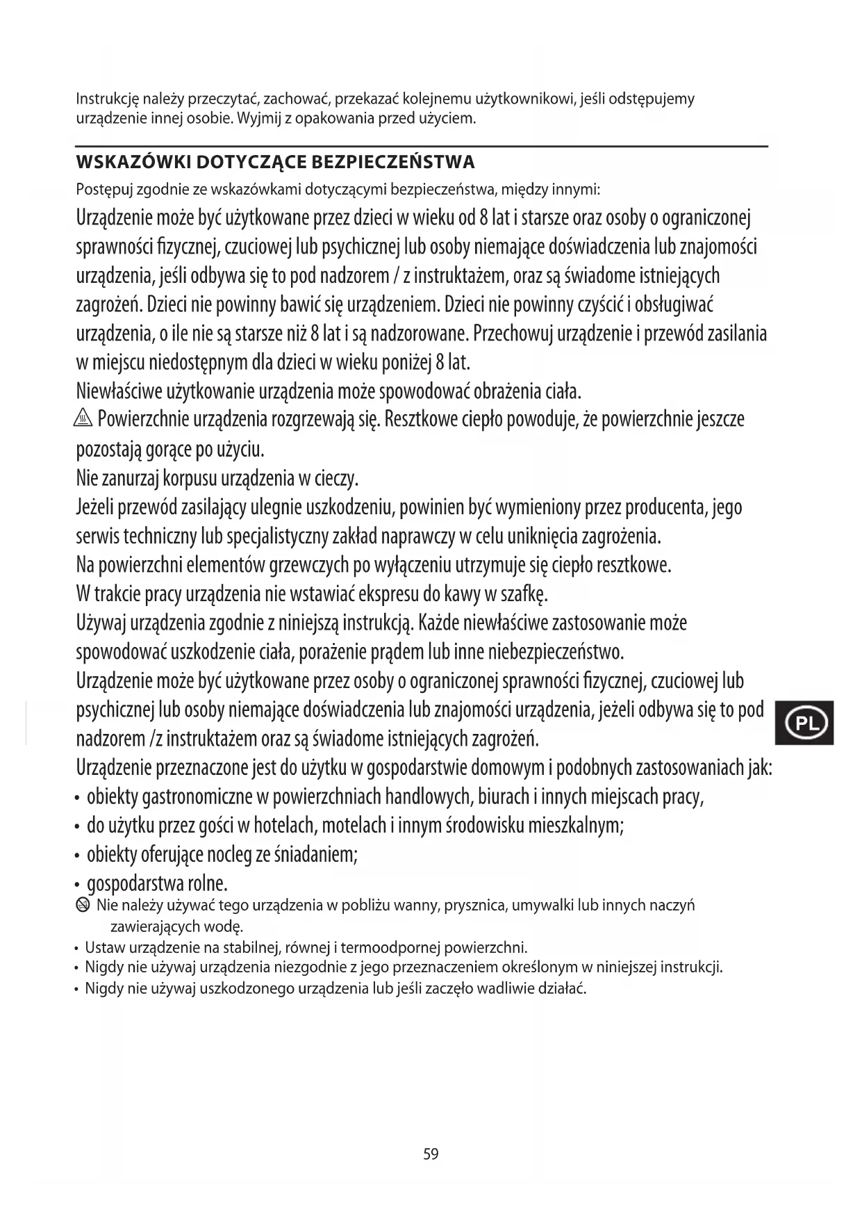 Postępuj zgodnie ze wskazówkami dotyczącymi bezpieczeństwa, między innymi: Urządzenie może być użytkowane przez dzieci w wieku od 8 lat i starsze oraz osoby o ograniczonej sprawności zycznej, czuciowej lub psychicznej lub osoby niemające doświadczenia lub znajomości urządzenia, jeśli odbywa się to pod nadzorem / z instruktażem, oraz są świadome istniejących zagrożeń. Dzieci nie powinny bawić się urządzeniem. Dzieci nie powinny czyścić i obsługiwać urządzenia, o ile nie są starsze niż 8 lat i są nadzorowane. Przechowuj urządzenie i przewód zasilania w miejscu niedostępnym dla dzieci w wieku poniżej 8 lat. Niewłaściwe użytkowanie urządzenia może spowodować obrażenia ciała. h Powierzchnie urządzenia rozgrzewają się. Resztkowe ciepło powoduje, że powierzchnie jeszcze pozostają gorące po użyciu. Nie zanurzaj korpusu urządzenia w cieczy. Jeżeli przewód zasilający ulegnie uszkodzeniu, powinien być wymieniony przez producenta, jego serwis techniczny lub specjalistyczny zakład naprawczy w celu uniknięcia zagrożenia. Na powierzchni elementów grzewczych po wyłączeniu utrzymuje się ciepło resztkowe. W trakcie pracy urządzenia nie wstawiać ekspresu do kawy w szafkę. Używaj urządzenia zgodnie z niniejszą instrukcją. Każde niewłaściwe zastosowanie może spowodować uszkodzenie ciała, porażenie prądem lub inne niebezpieczeństwo. Urządzenie może być użytkowane przez osoby o ograniczonej sprawności zycznej, czuciowej lub psychicznej lub osoby niemające doświadczenia lub znajomości urządzenia, jeżeli odbywa się to pod nadzorem /z instruktażem oraz są świadome istniejących zagrożeń. Urządzenie przeznaczone jest do użytku w gospodarstwie domowym i podobnych zastosowaniach jak: