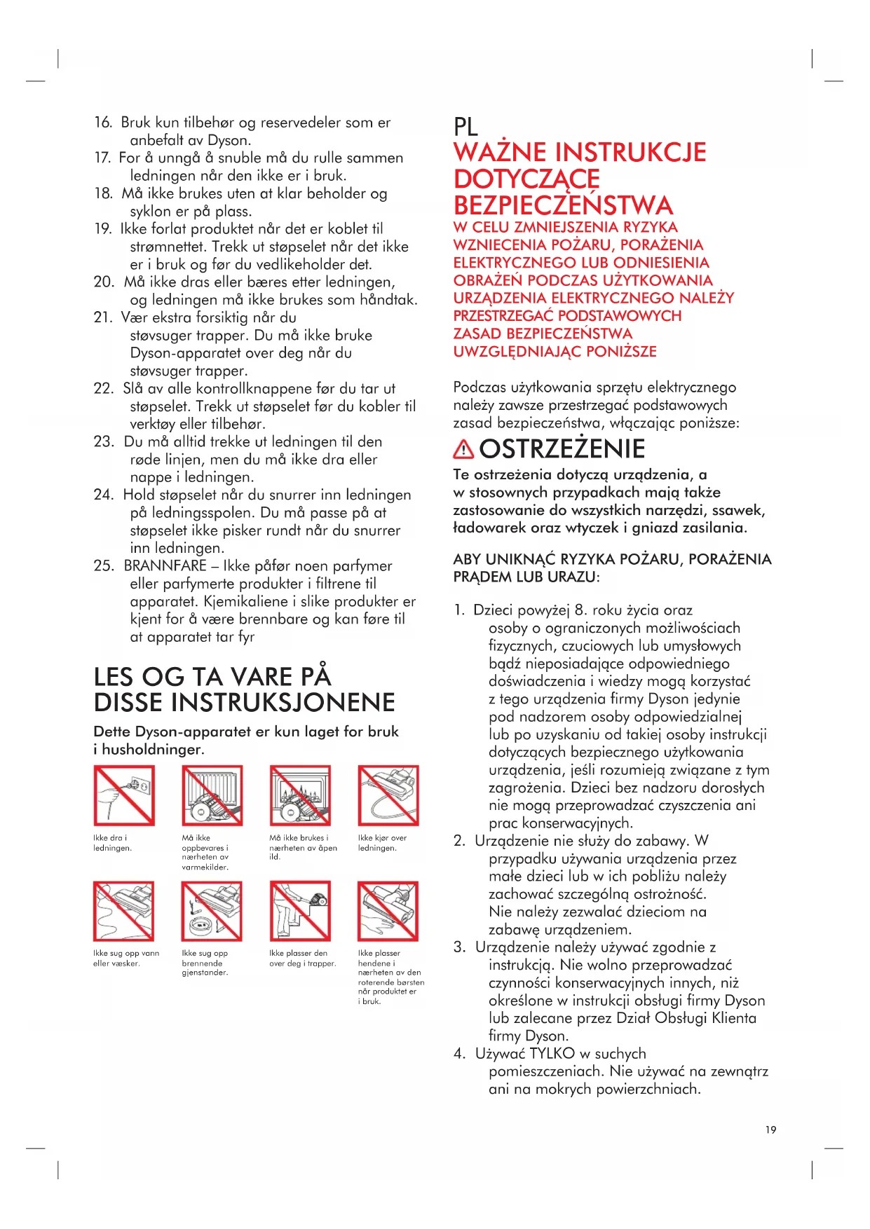 pomieszczeniach. Nie używać na zewnątrz ani na mokrych powierzchniach. Ikke dra i ledningen. Må ikke oppbevares i nærheten av varmekilder. Må ikke brukes i nærheten av åpen ild. Ikke kjør over ledningen. Ikke sug opp vann eller væsker. Ikke sug opp brennende gjenstander. Ikke plasser den over deg i trapper. Ikke plasser hendene i nærheten av den roterende børsten når produktet er i bruk.20